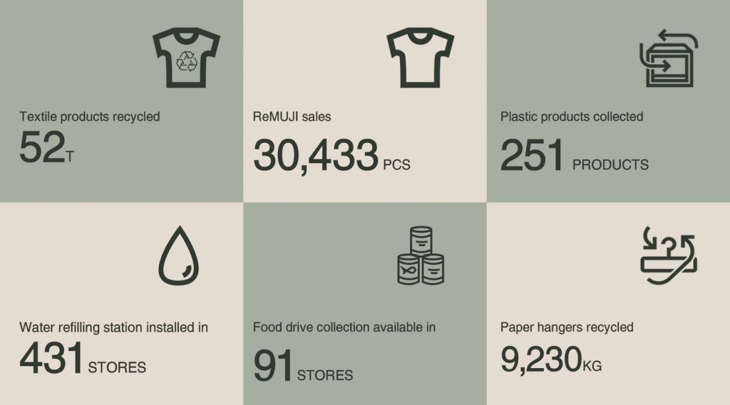 Through our company’s products, services, and activities, we remain committed to advancing the cause of environmental sustainability and fostering a greener society. Below are, Ryohin Keikaku, MUJI’s parent company, key figures that highlight the strides made in recycling Earth’s resources and minimizing waste, all aimed at nurturing a more harmonious relationship with nature.