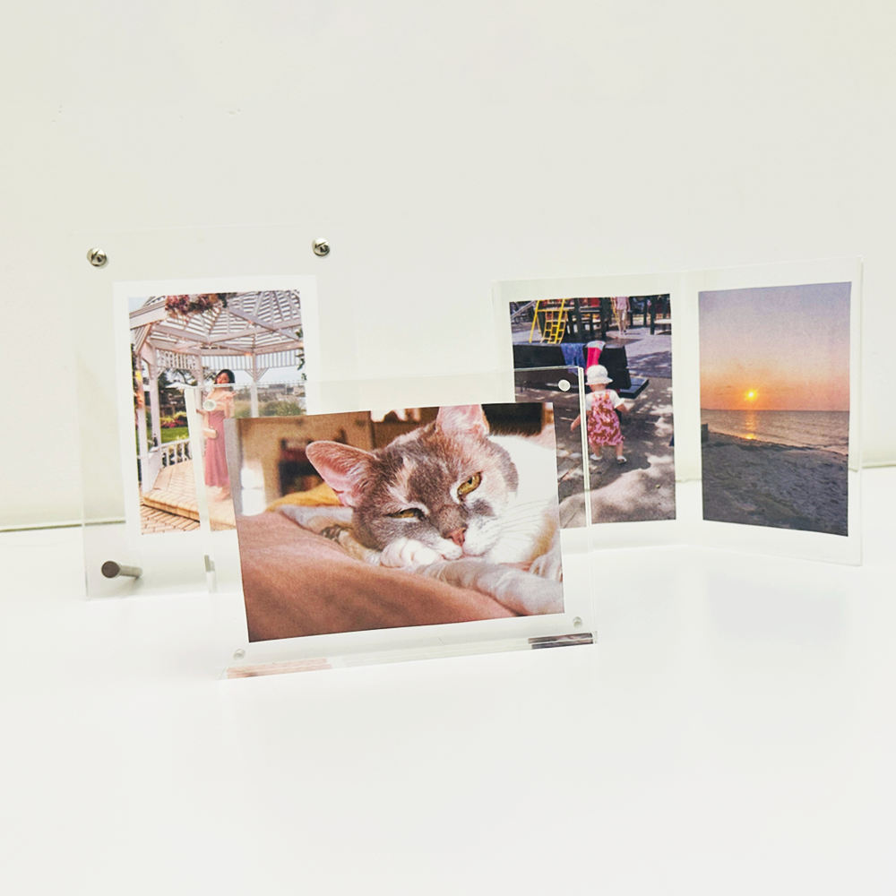 This acrylic frame can be used in horizontally or vertically by changing the positions of the legs. It has a clear. transparent design that will showcase your photos beautifully. Simple to use. it’s perfect for any home or office decor.