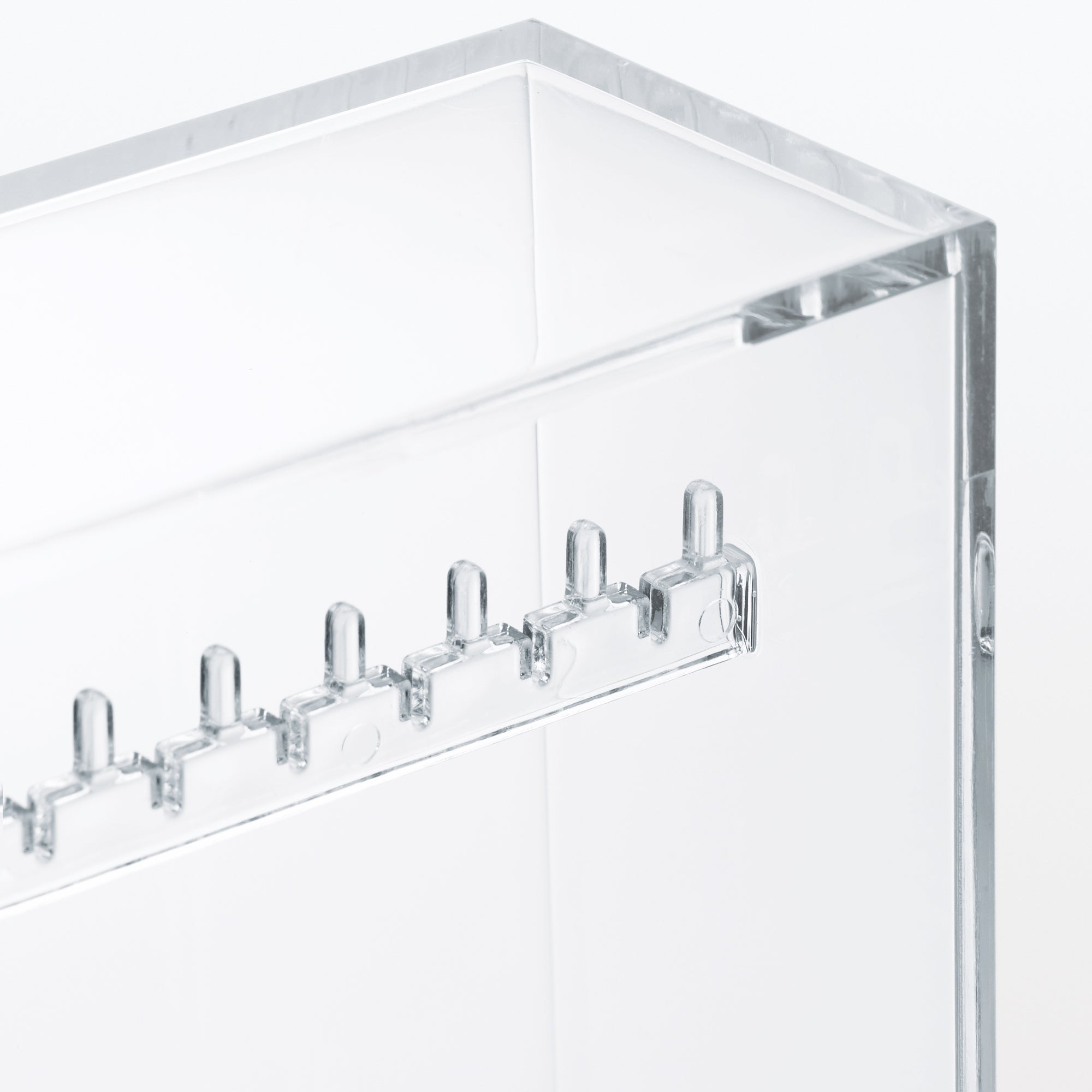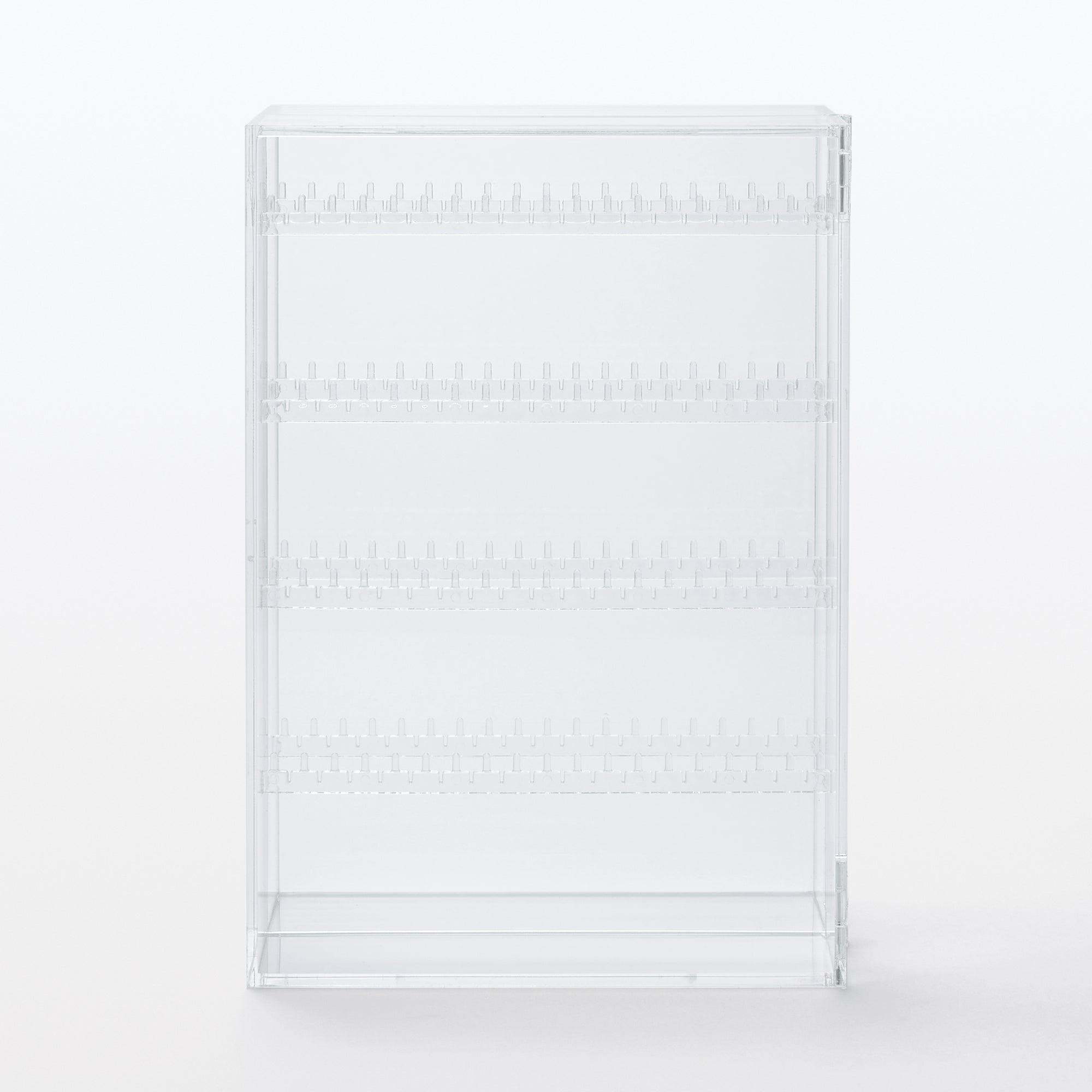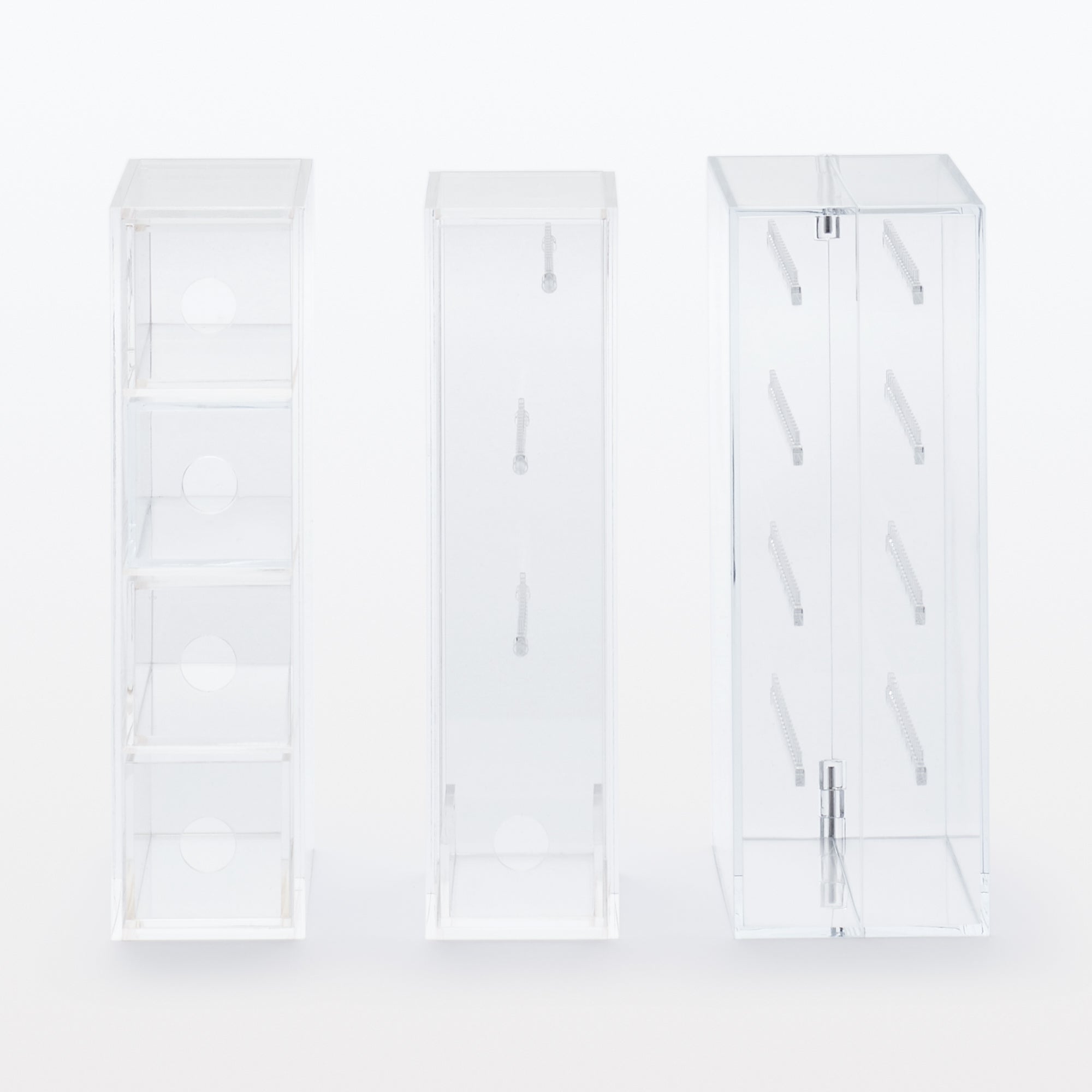 A transparent case with 4 hook tiers that make it ideal for hanging necklaces and earrings. There is also room at the bottom to place a (sold separately) for even more optimized storage.