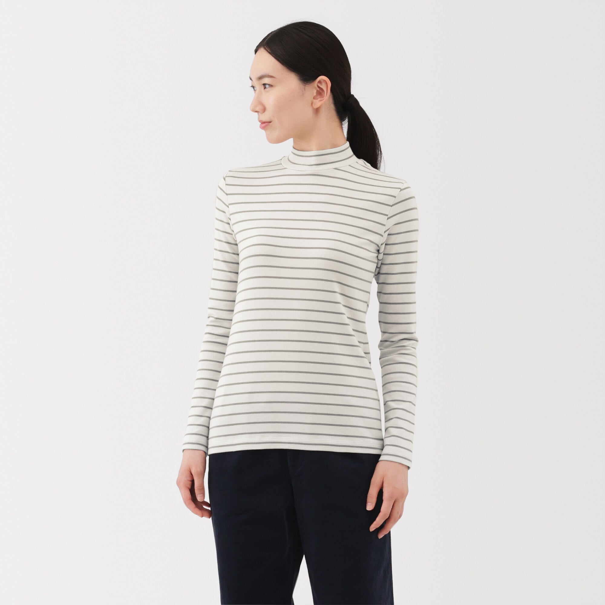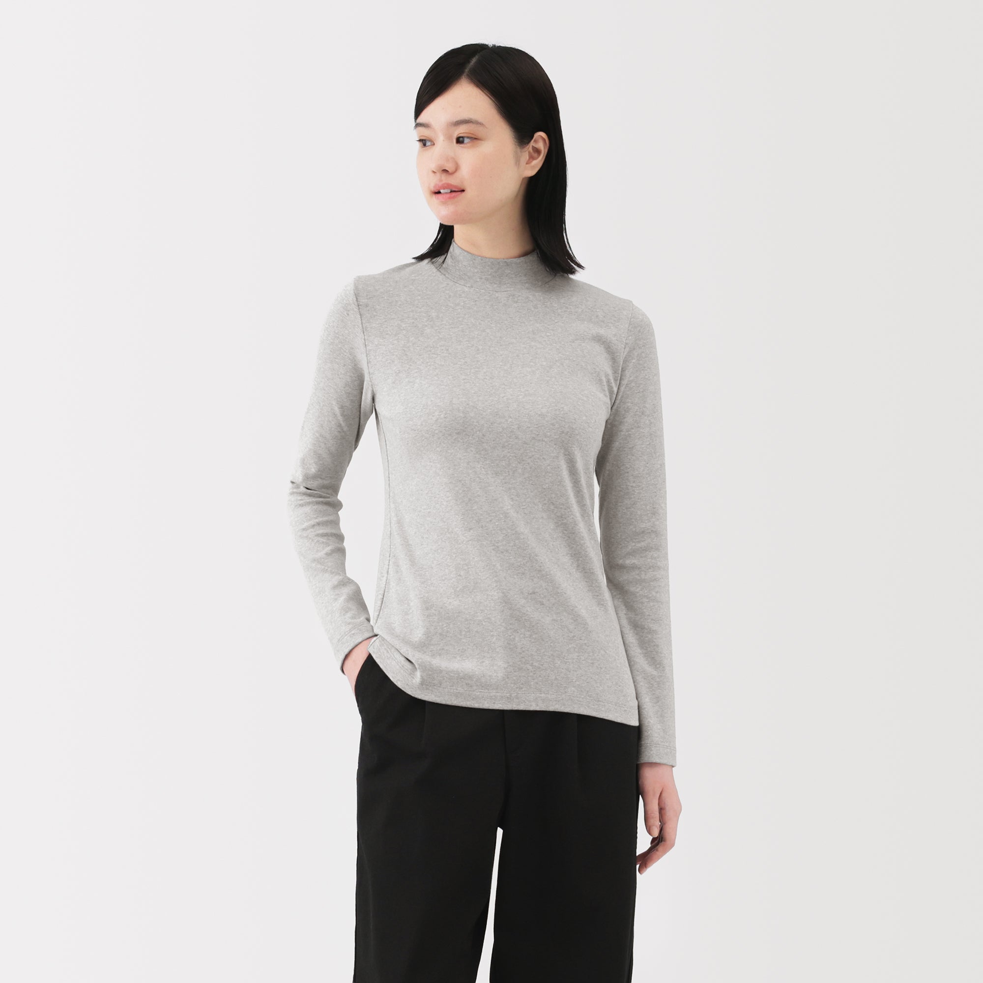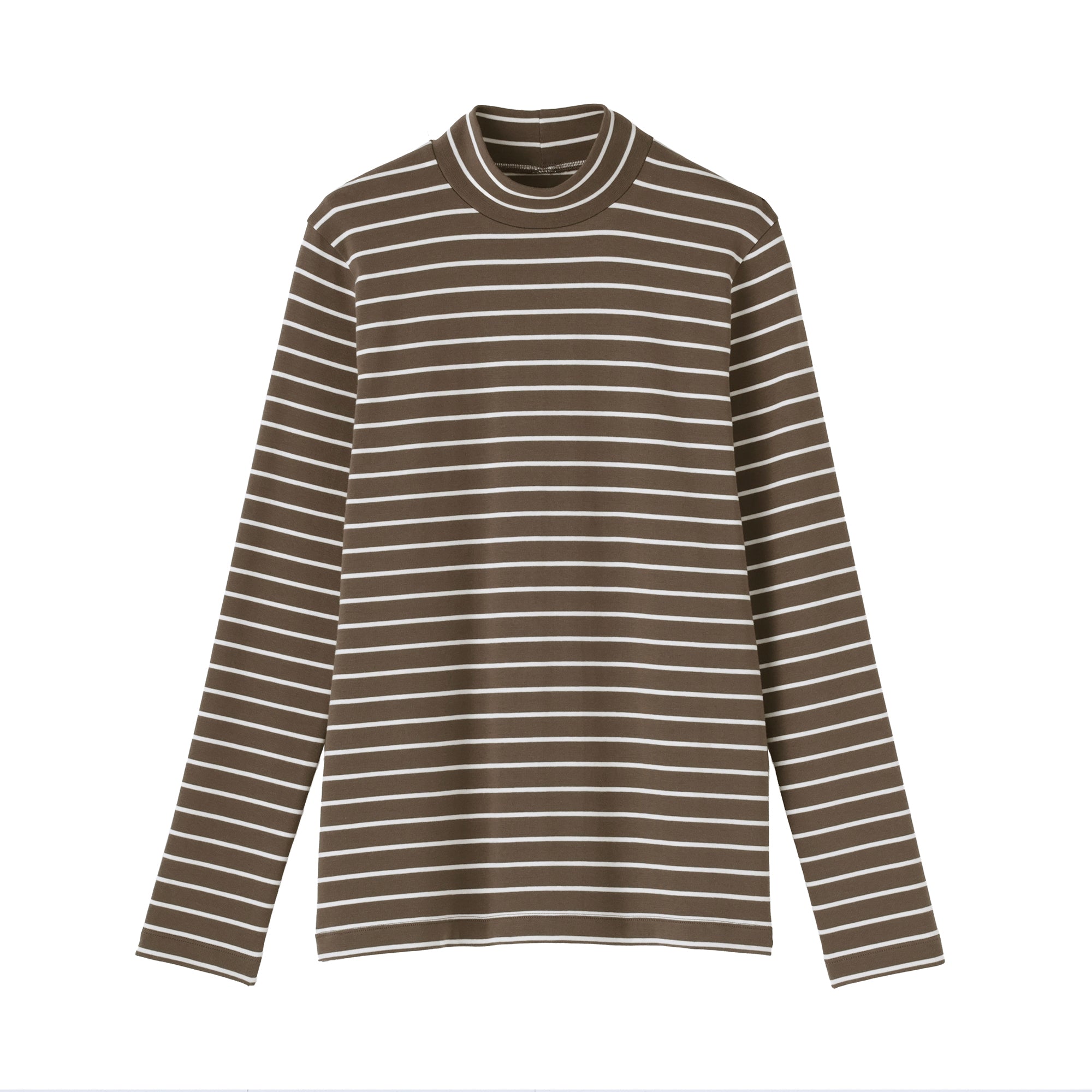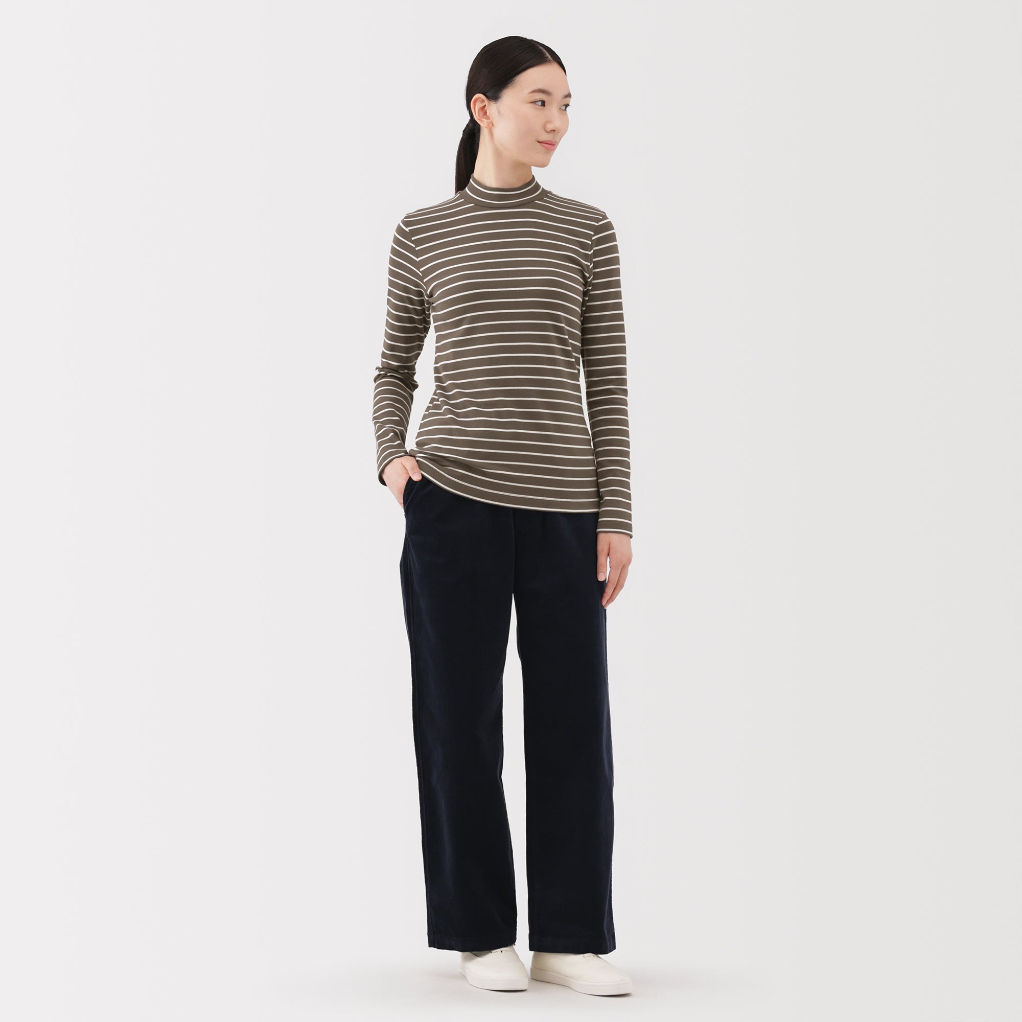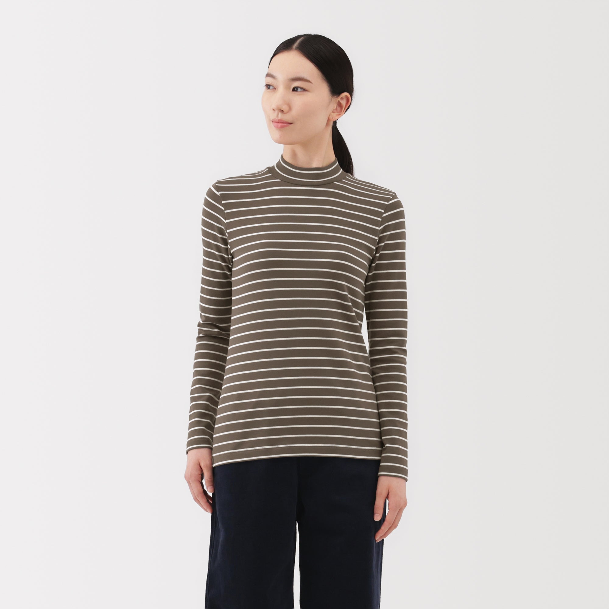 A ribbed mock neck t-shirt with a lightly brushed interior for warmth and a soft. smooth feel against the skin. The high neck fits around the neck to provide protection from the cold. Made with organic cotton.