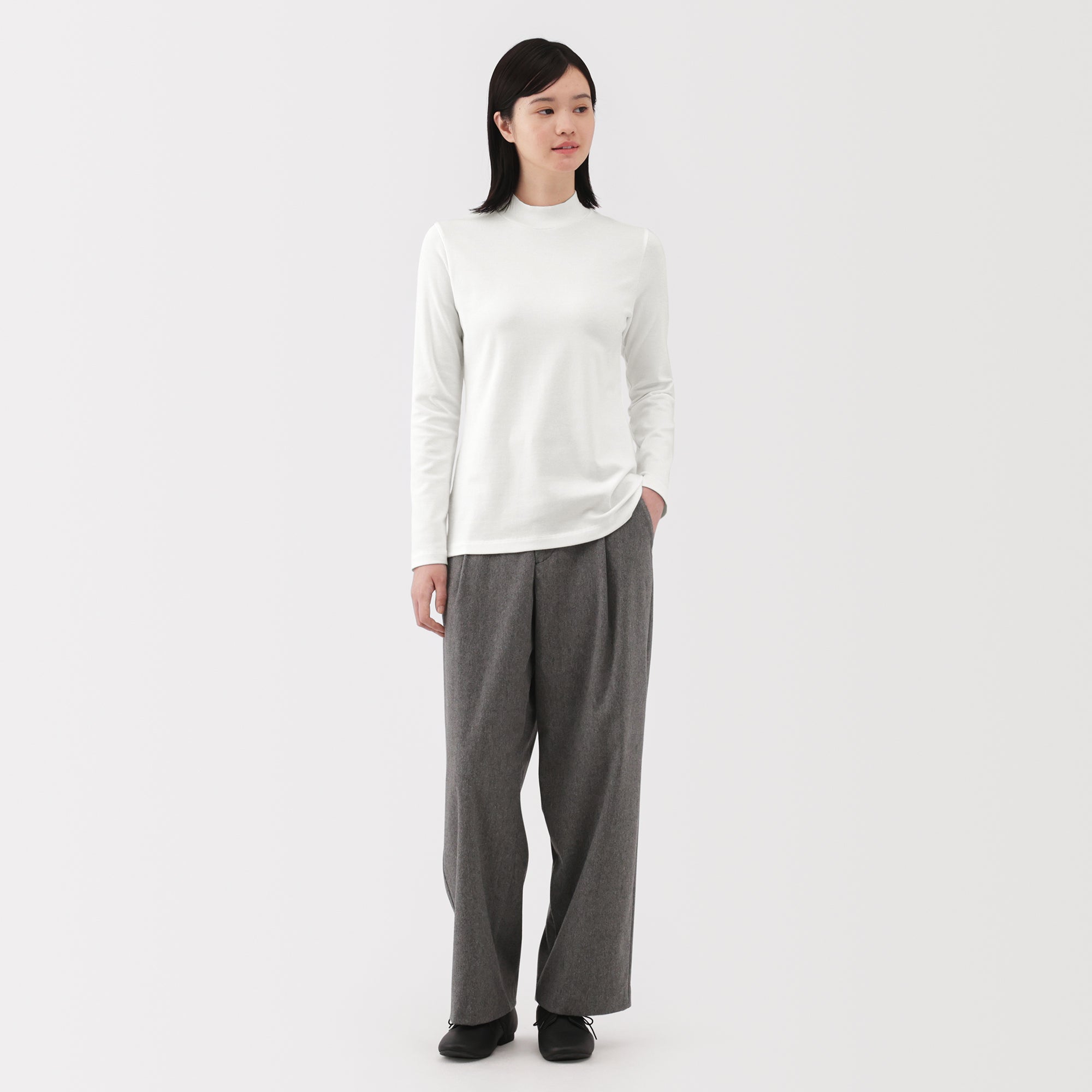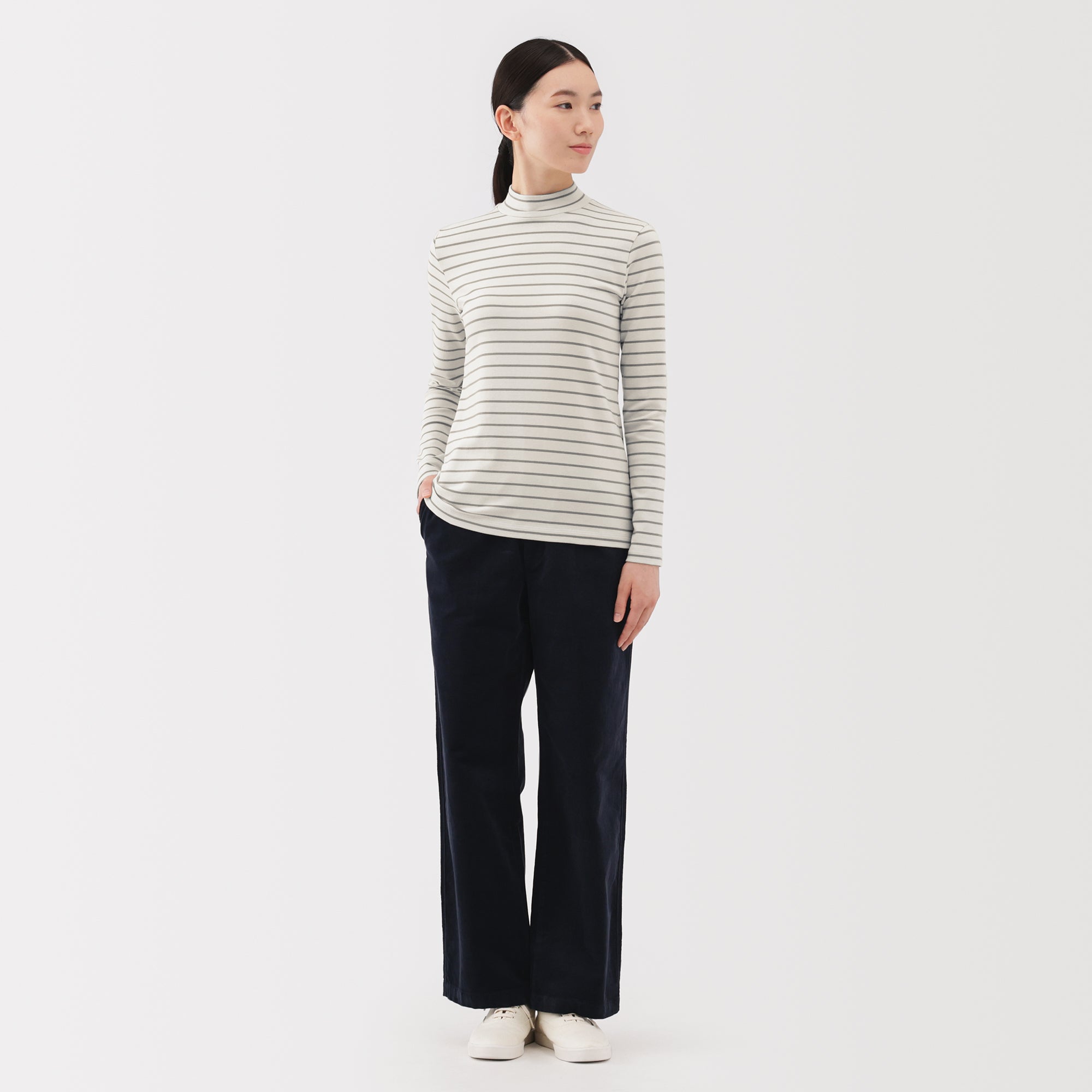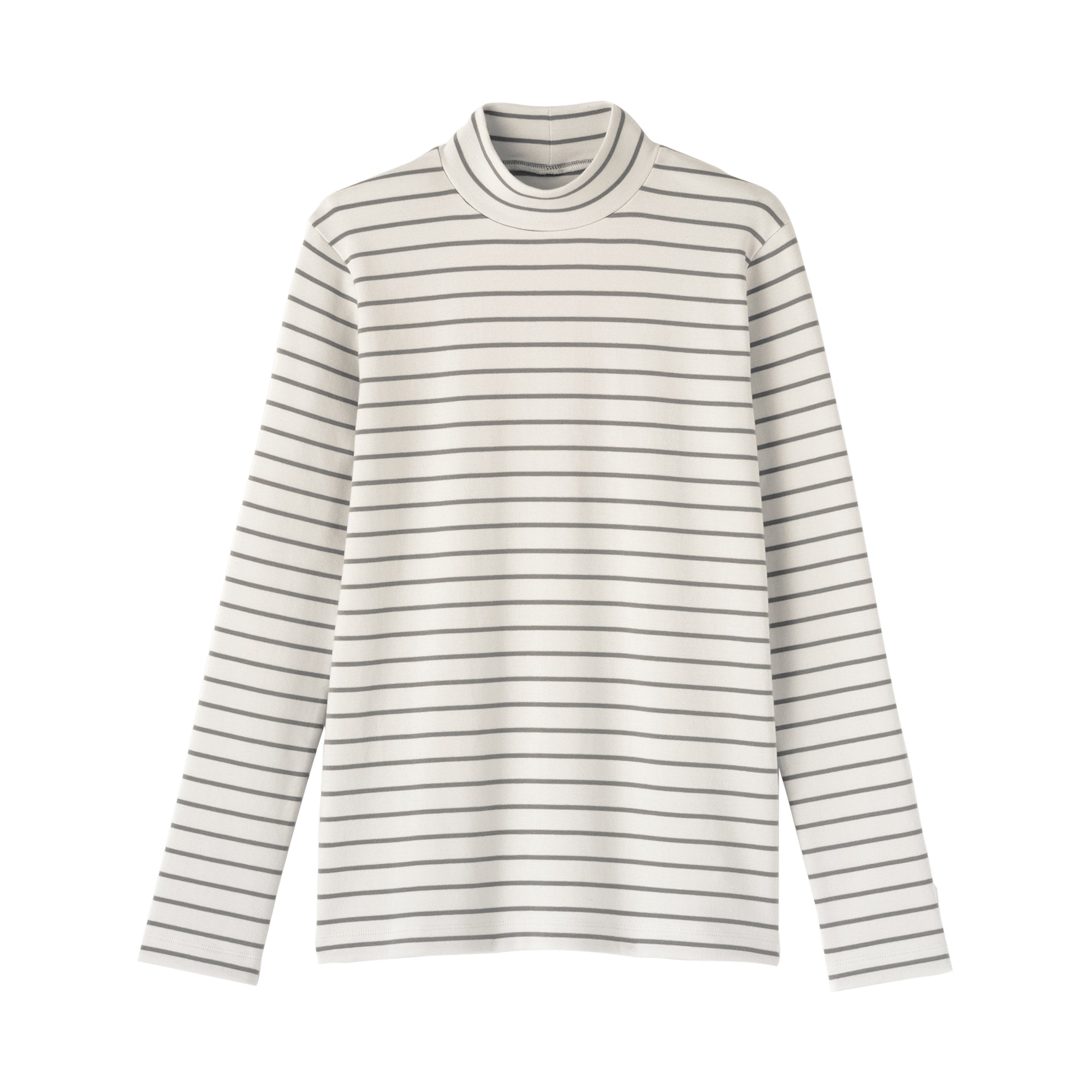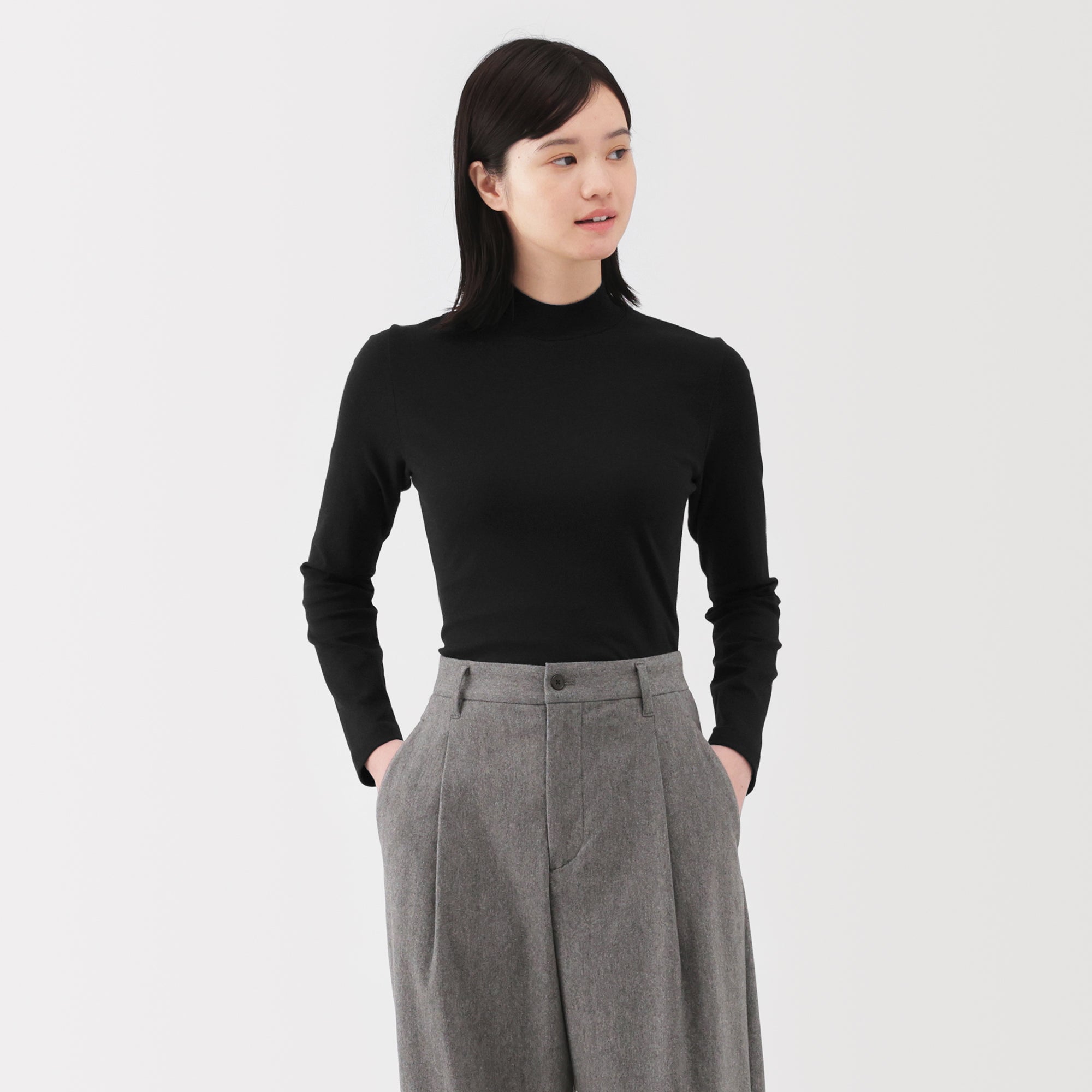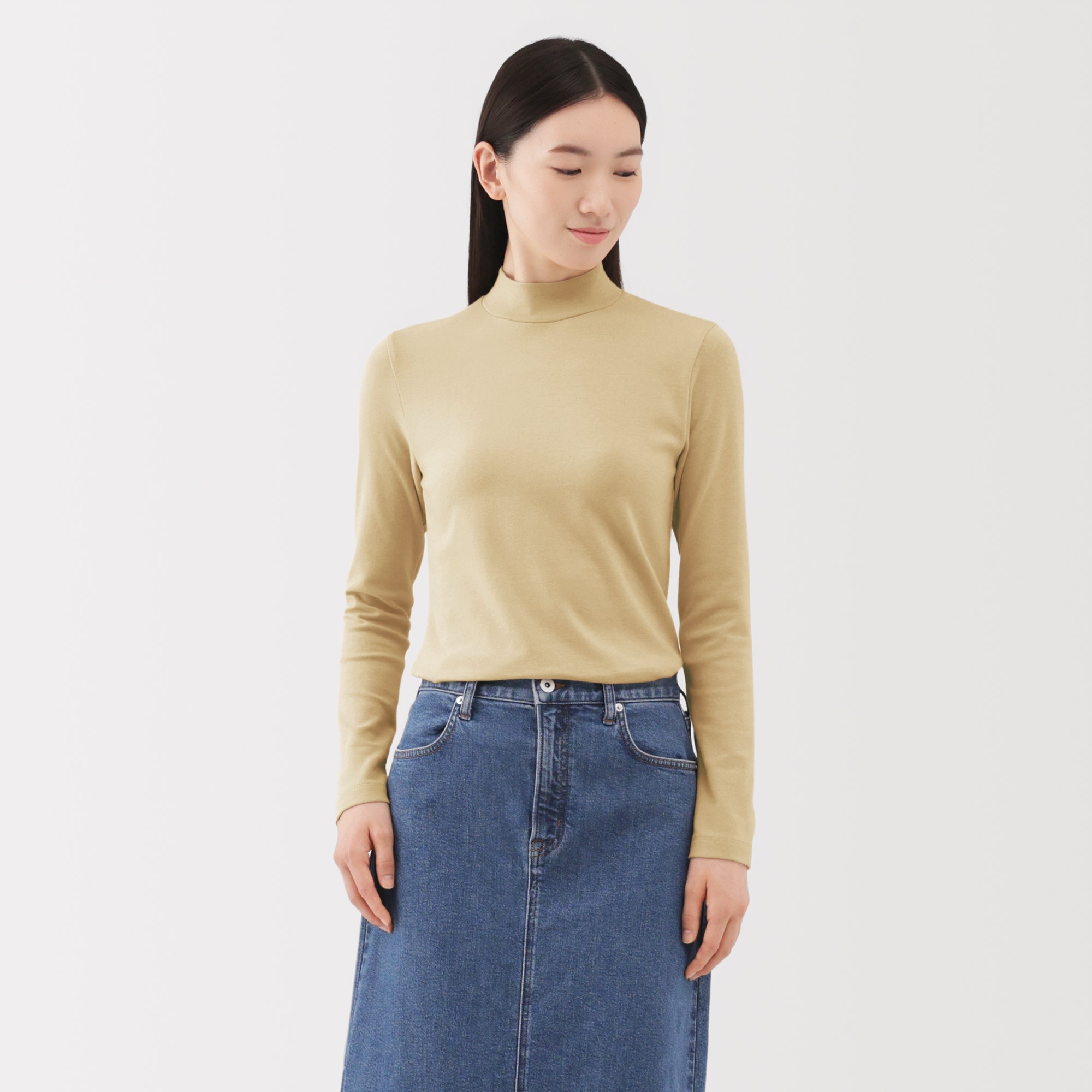 A ribbed mock neck t-shirt with a lightly brushed interior for warmth and a soft. smooth feel against the skin. The high neck fits around the neck to provide protection from the cold. Made with organic cotton.