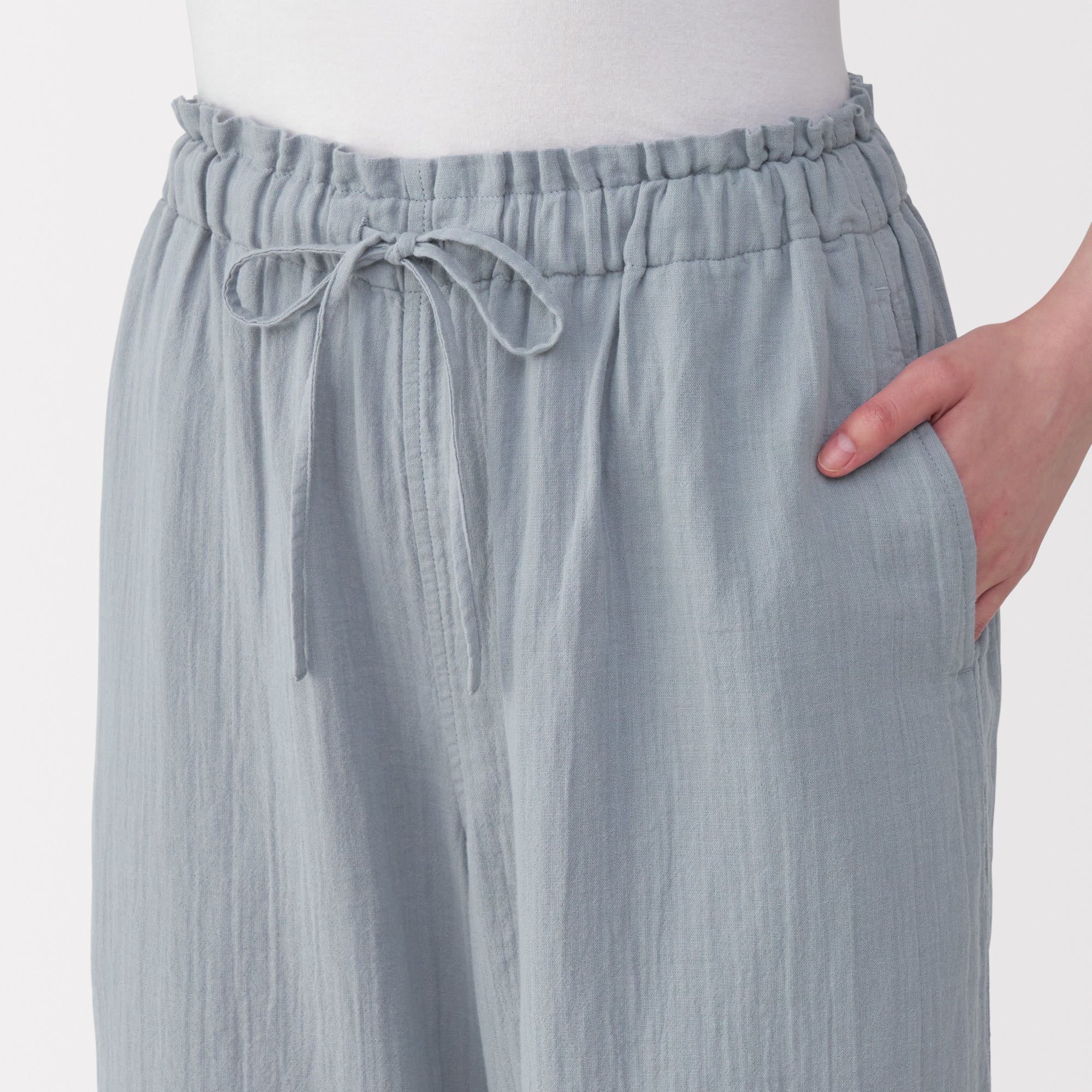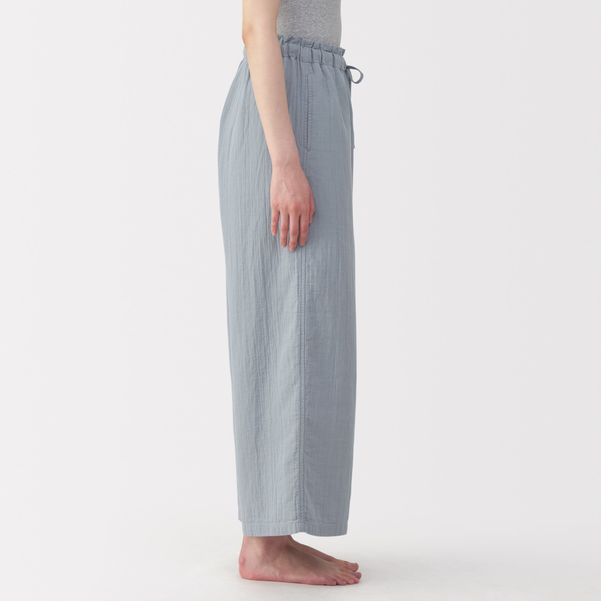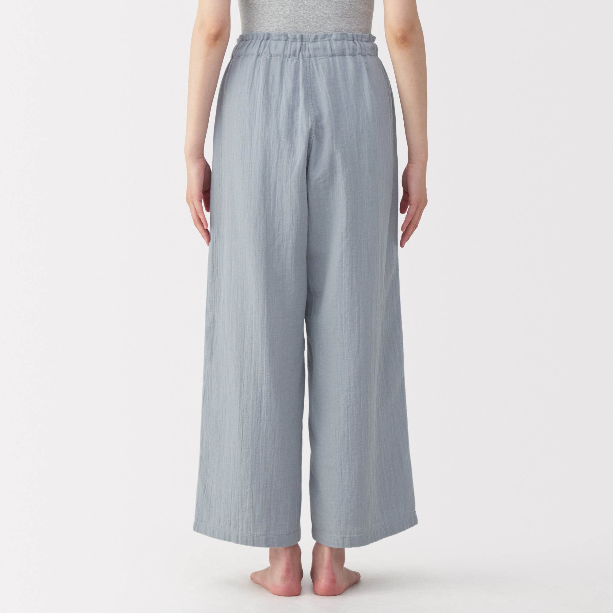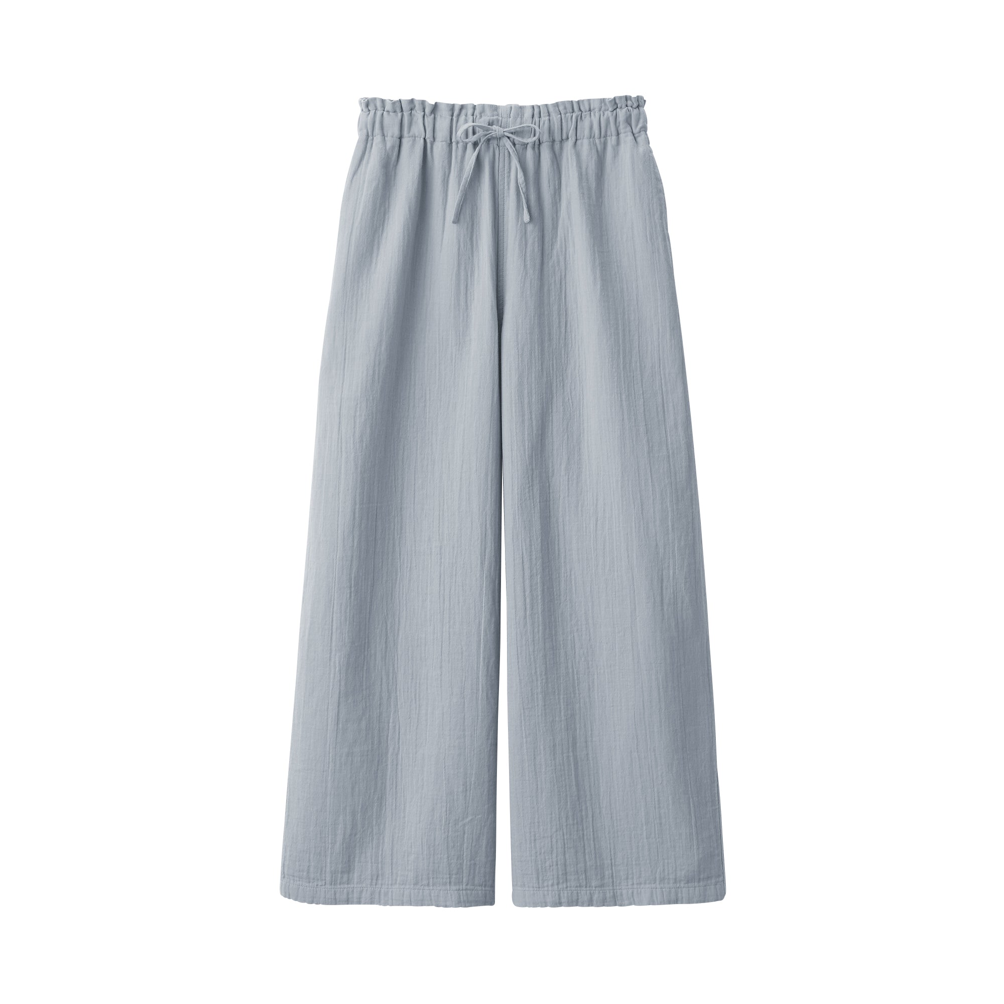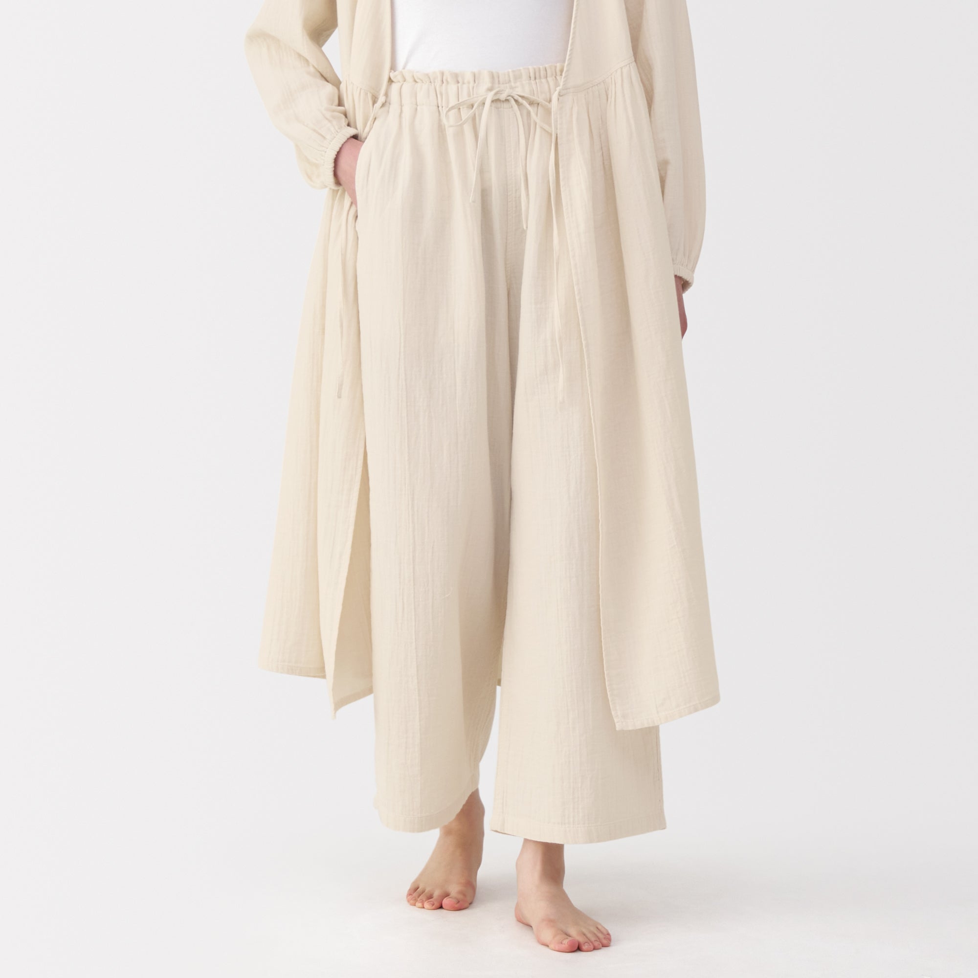 These lightweight and breathable pants are perfect for lounging in. The double-layered organic cotton gauze material is made from tightly twisted yarn. with a wrinkled texture that creates an air layer between the outside air and the skin surface. keeping you cool even on warm days. Its adjustable drawstring waistband and wide-leg silhouette are comfortable to wear to wear at home. yet refined enough to wear for short outings in the neighborhood.