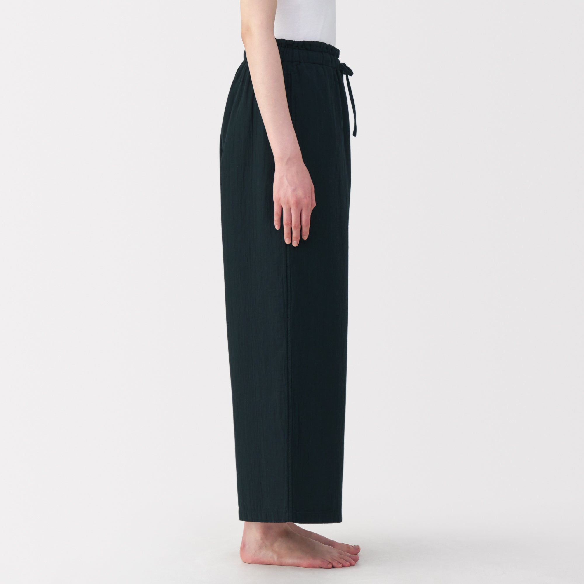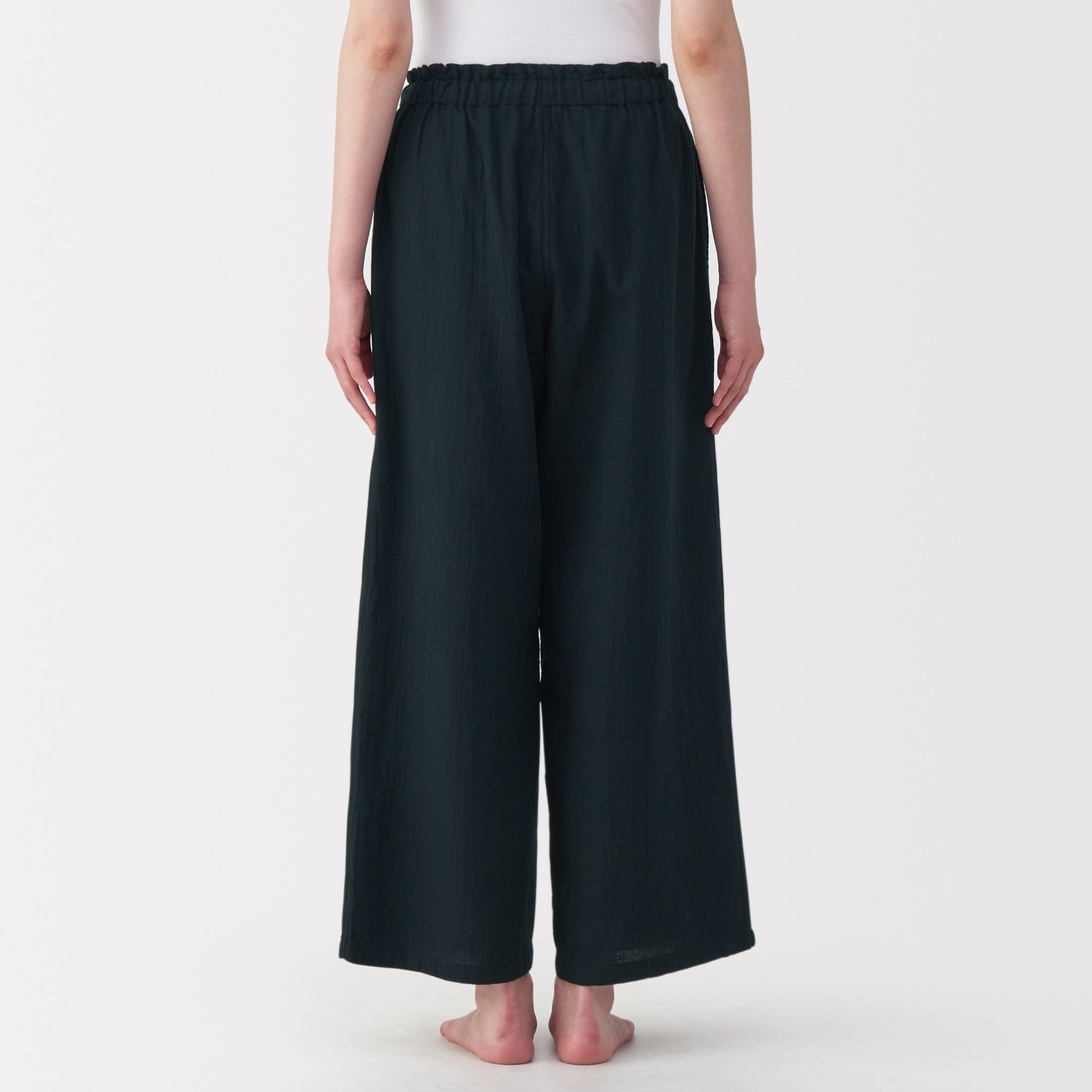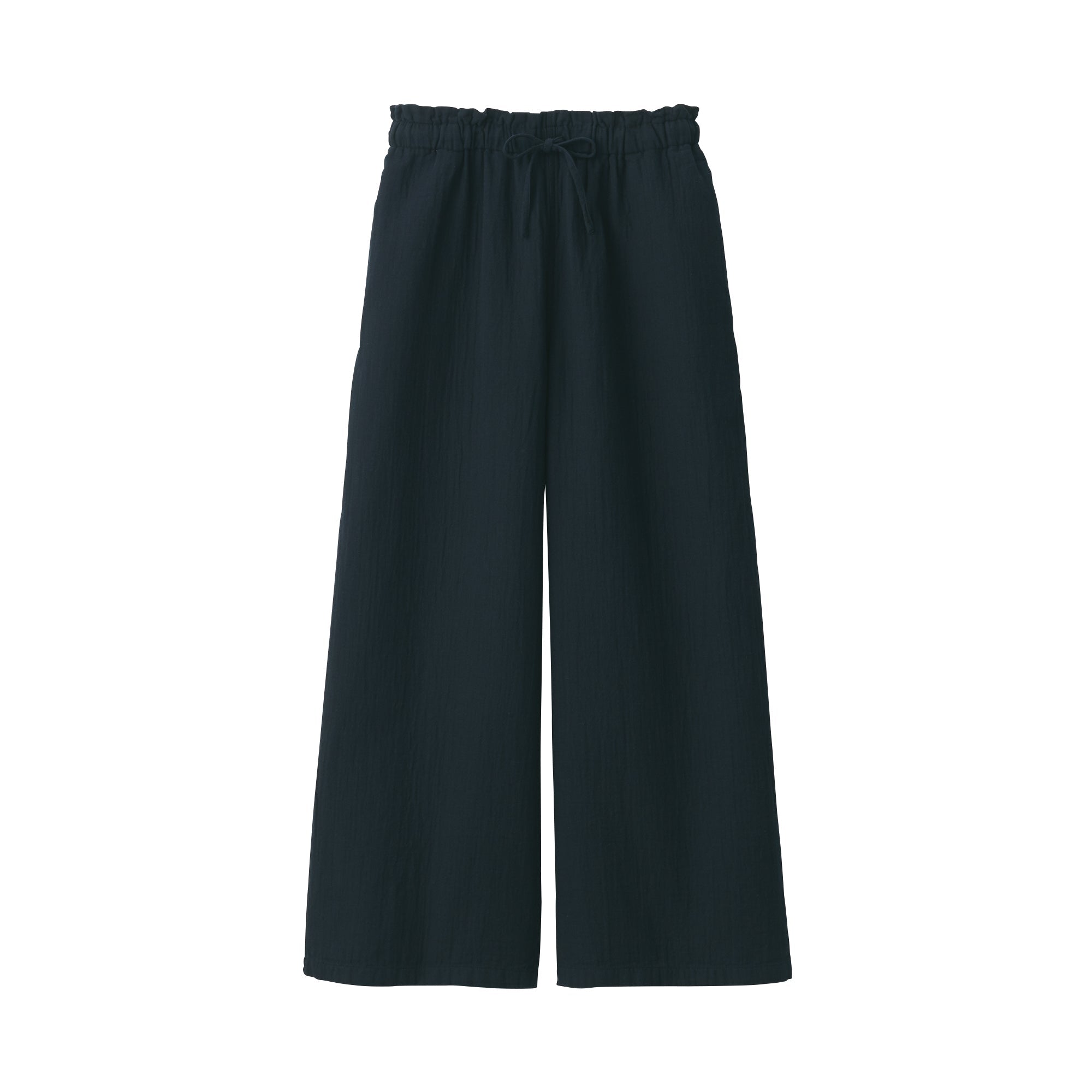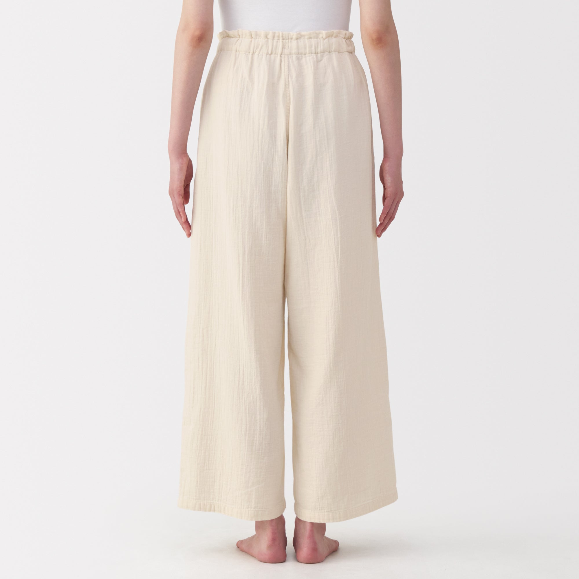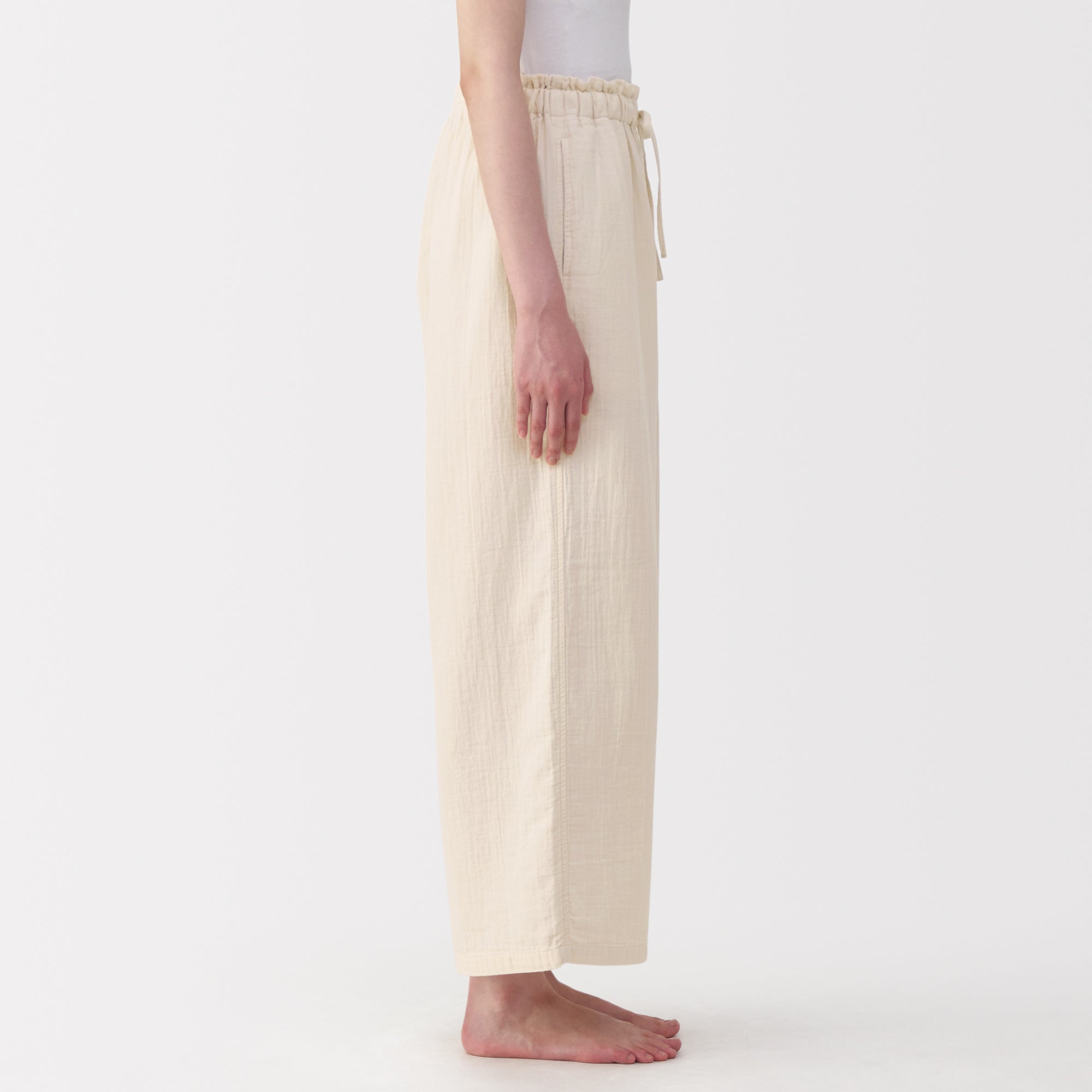 These lightweight and breathable pants are perfect for lounging in. The double-layered organic cotton gauze material is made from tightly twisted yarn. with a wrinkled texture that creates an air layer between the outside air and the skin surface. keeping you cool even on warm days. Its adjustable drawstring waistband and wide-leg silhouette are comfortable to wear to wear at home. yet refined enough to wear for short outings in the neighborhood.