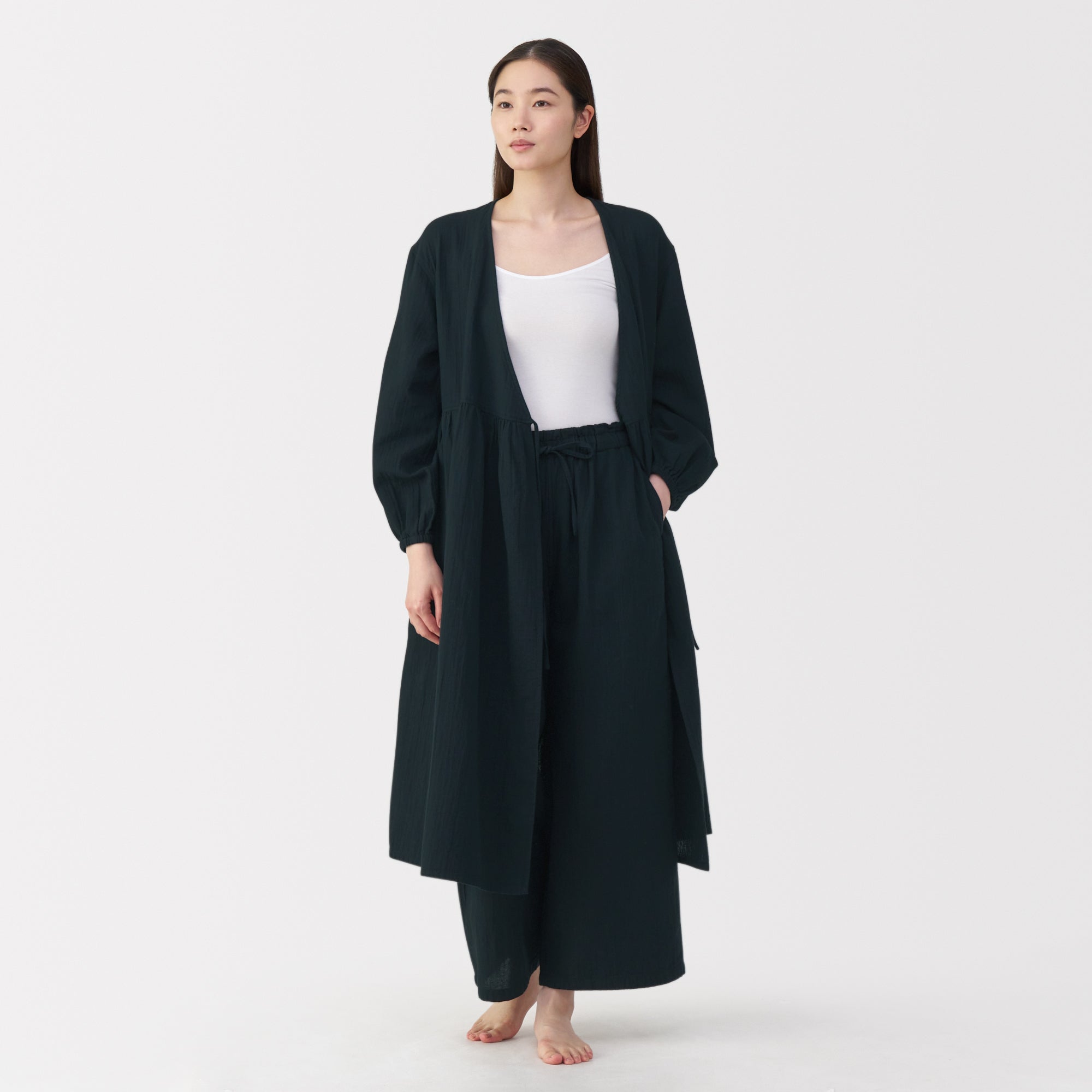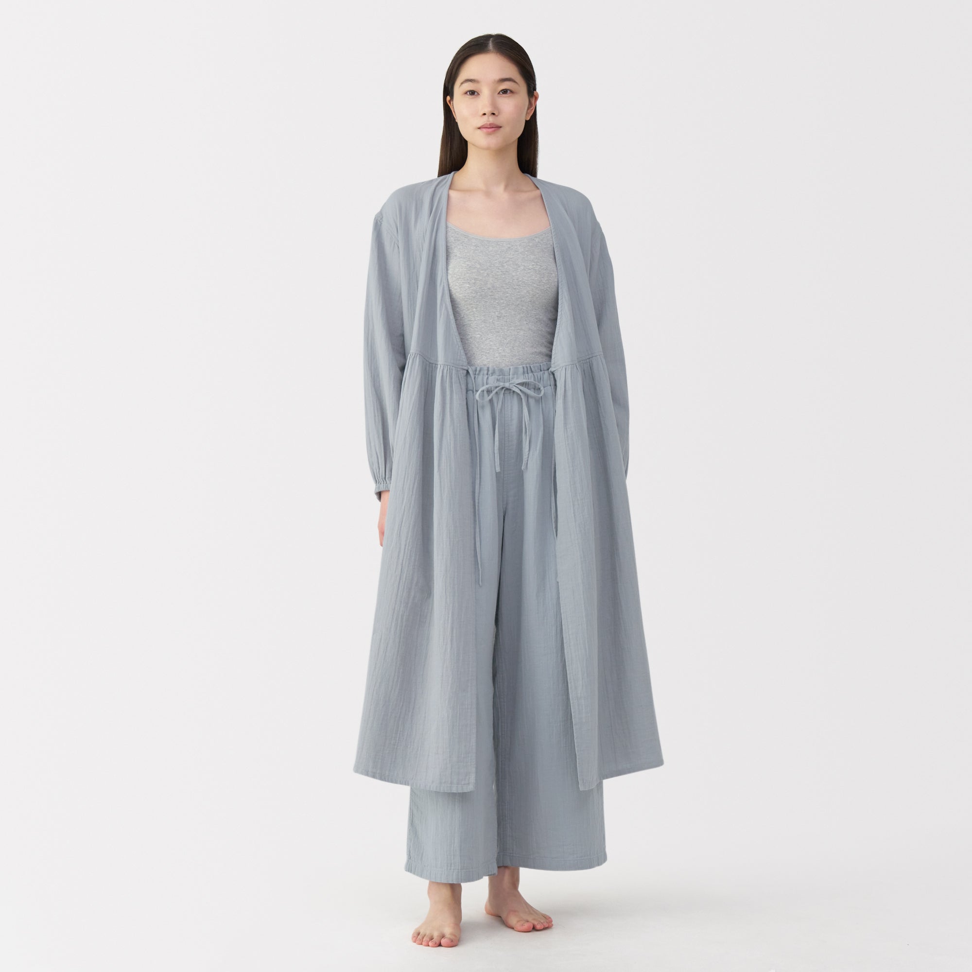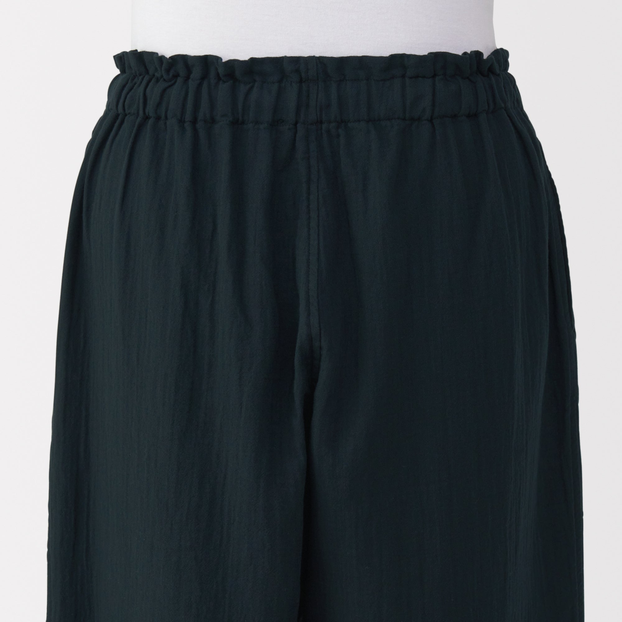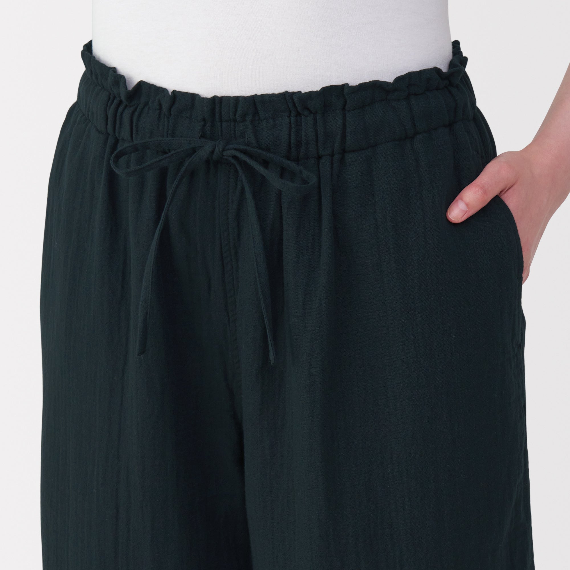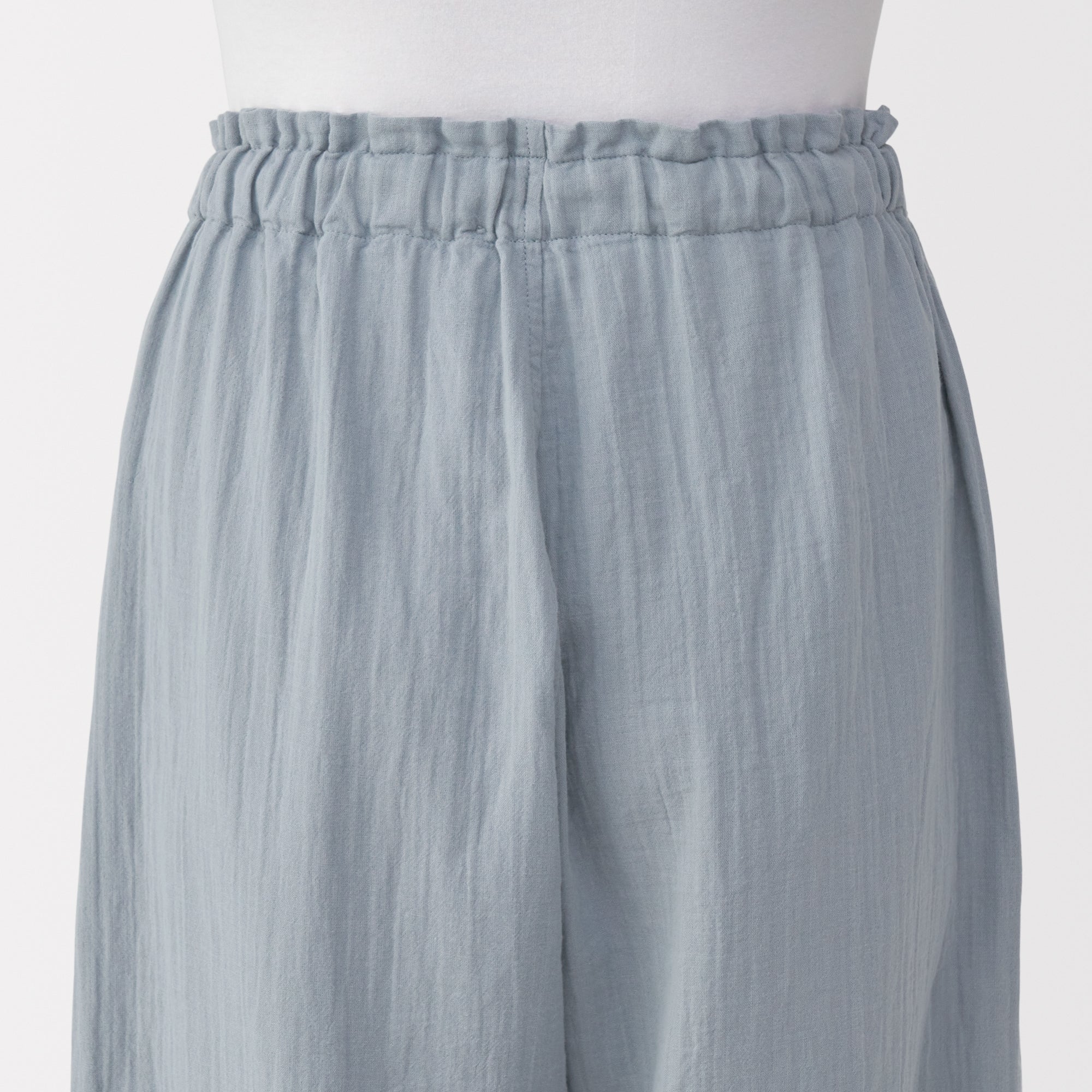 These lightweight and breathable pants are perfect for lounging in. The double-layered organic cotton gauze material is made from tightly twisted yarn. with a wrinkled texture that creates an air layer between the outside air and the skin surface. keeping you cool even on warm days. Its adjustable drawstring waistband and wide-leg silhouette are comfortable to wear to wear at home. yet refined enough to wear for short outings in the neighborhood.
