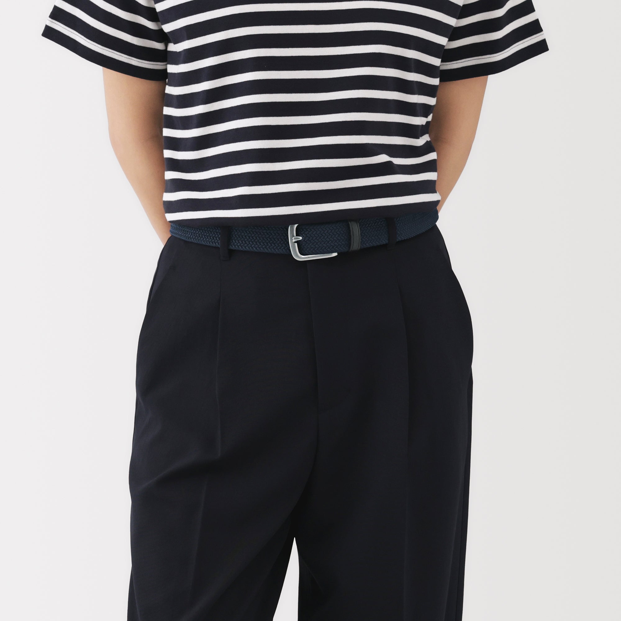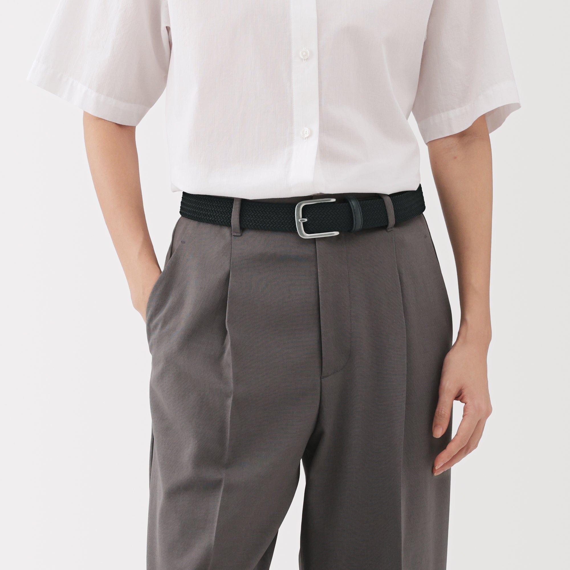 This belt is woven with stretchy elastic thread. allowing for flexibility in movement and adjustable sizing without the need for belt holes.
