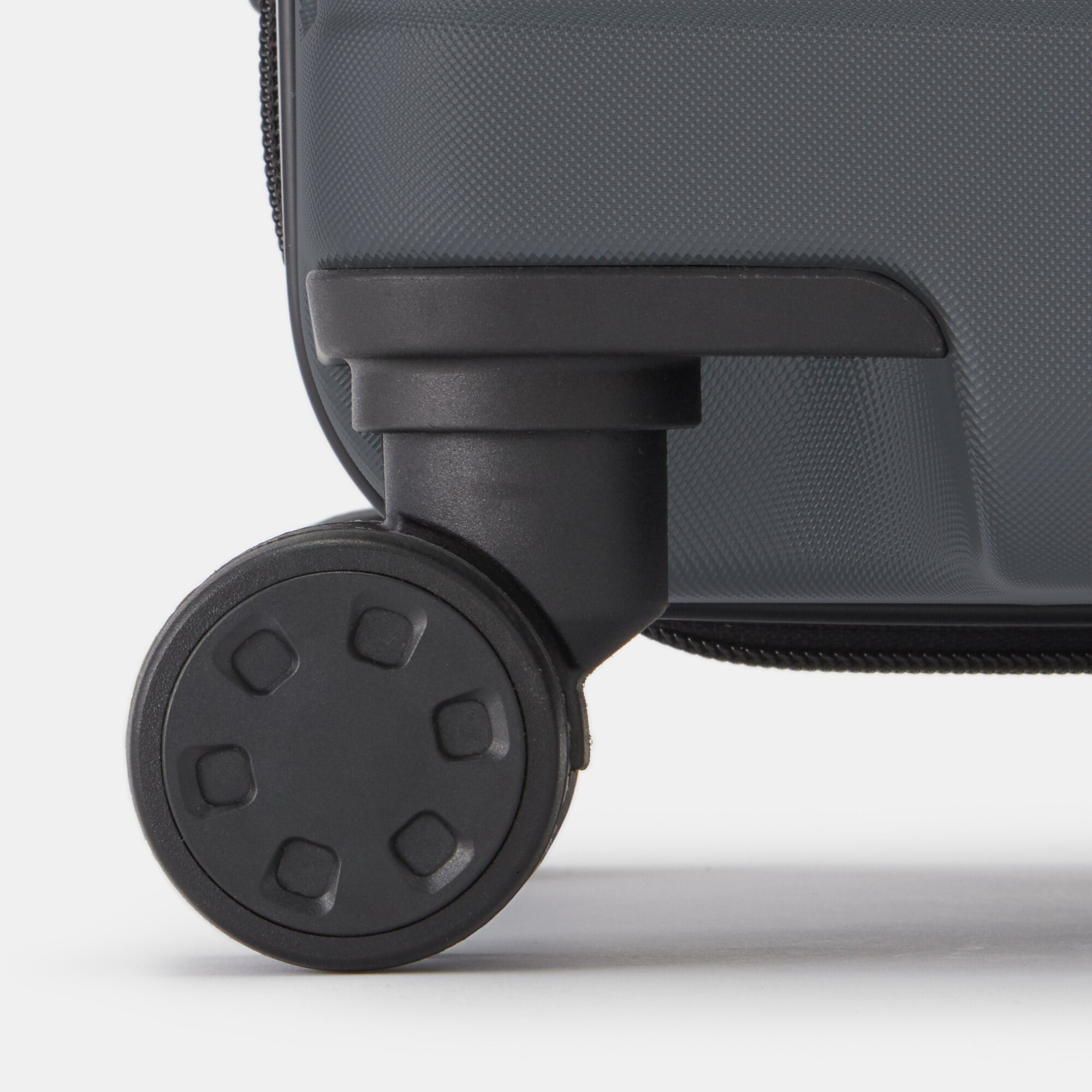 Replacement front right caster for MUJI Hard Shell Suitcases. This replacement wheel features a 360° swivel and a twin-wheel caster design which runs quietly and smoothly.