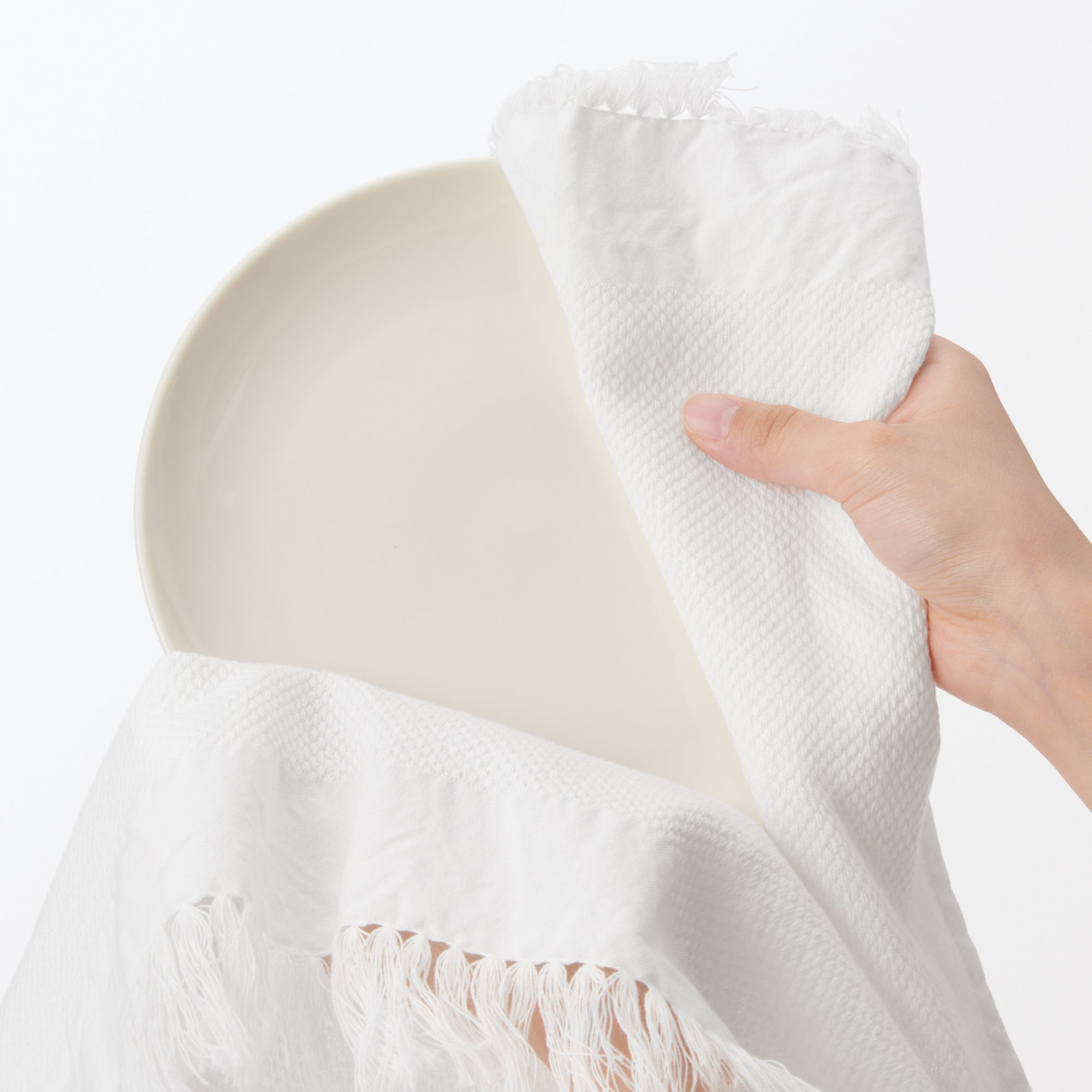 Our Indian Cotton Cloth is perfect for any kitchen task – whether you’re wiping dishes and other household items. using it as a place mat. or protecting items from dust. This cloth features fringes on the ends and a thinner. durable fabric in an off-white color.