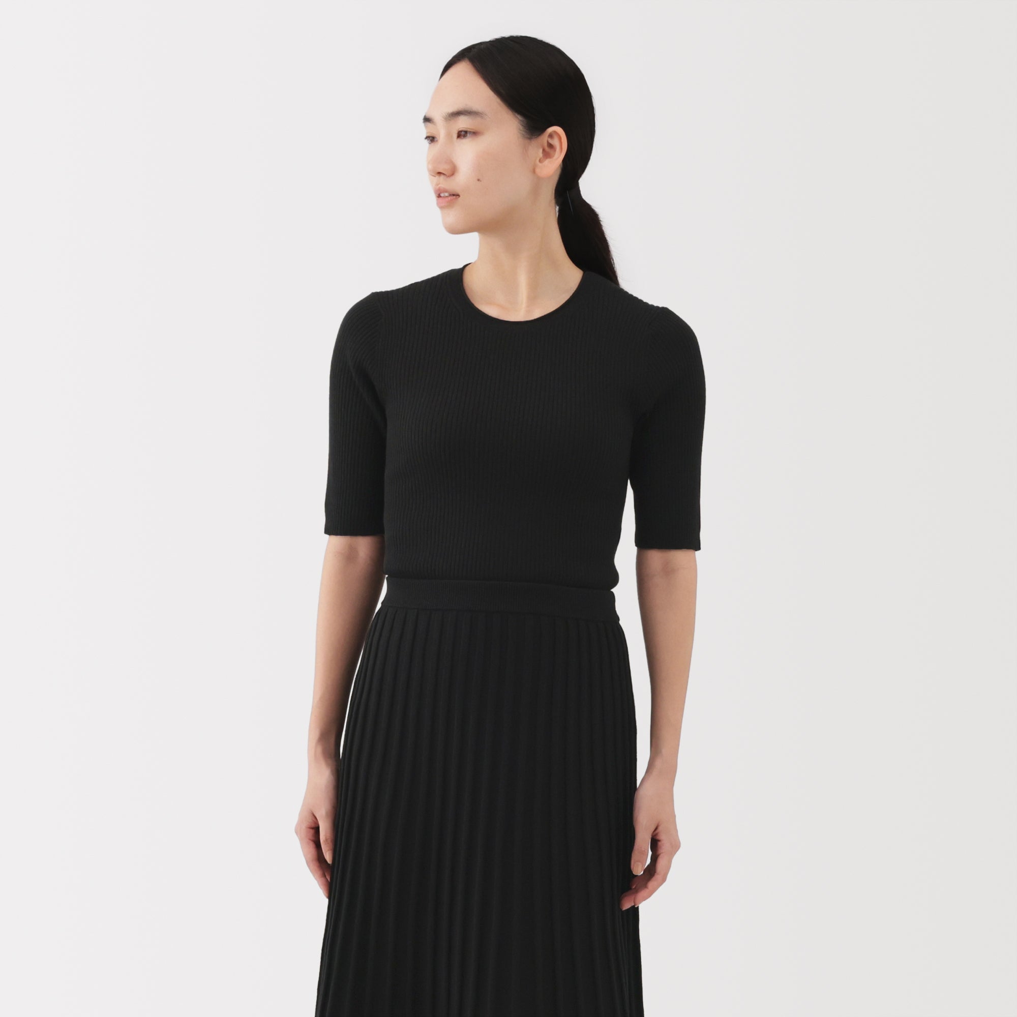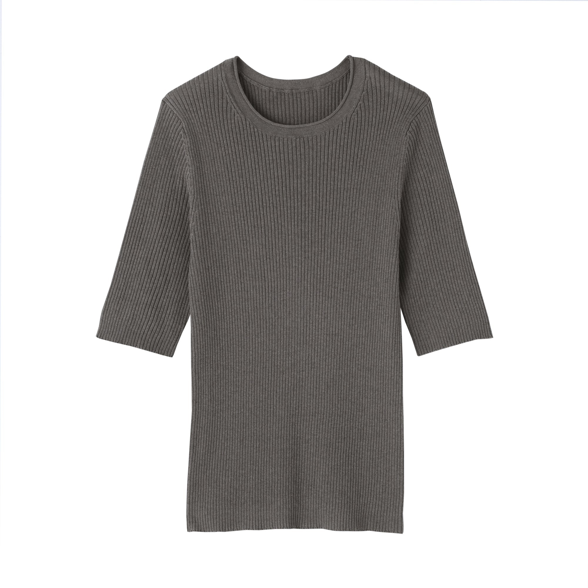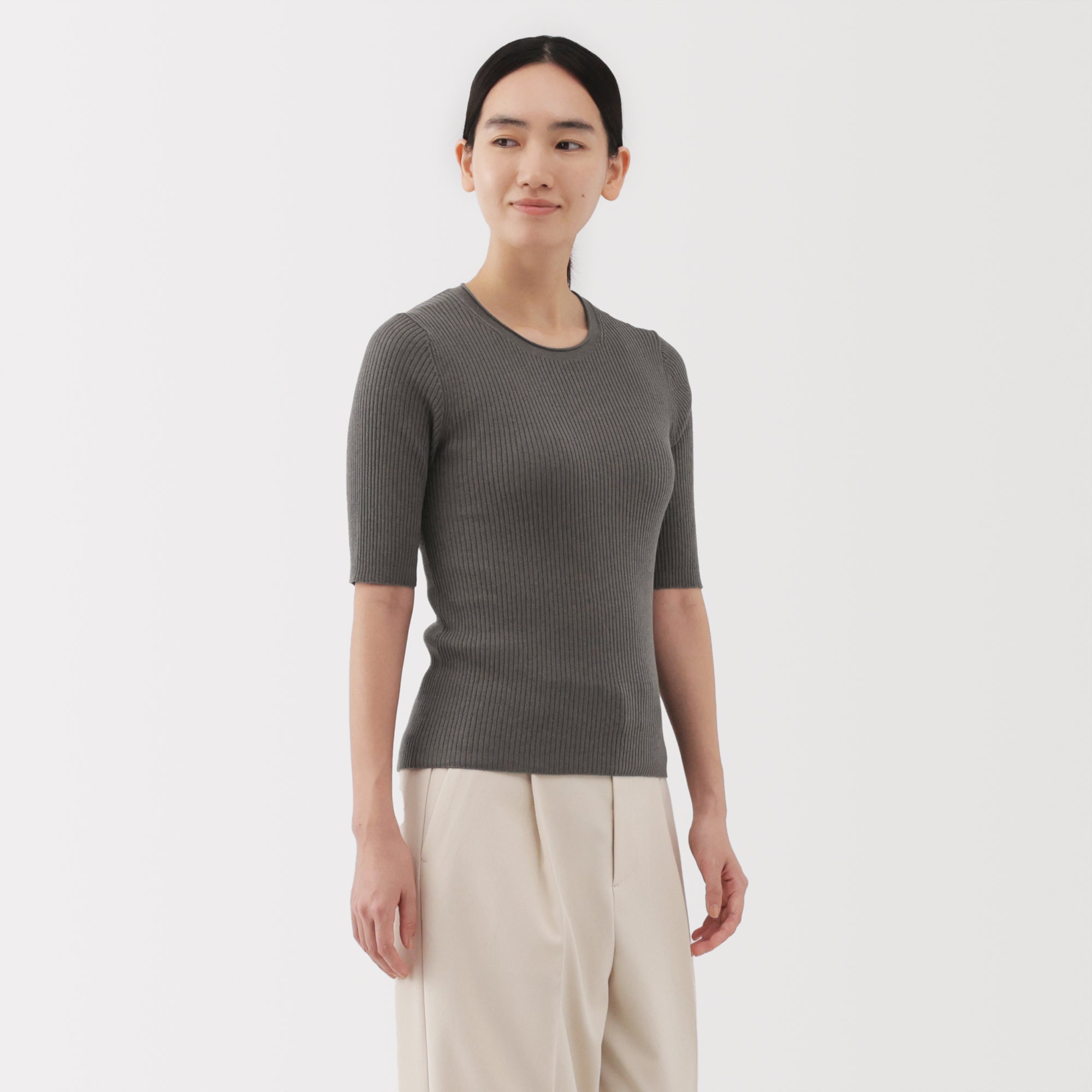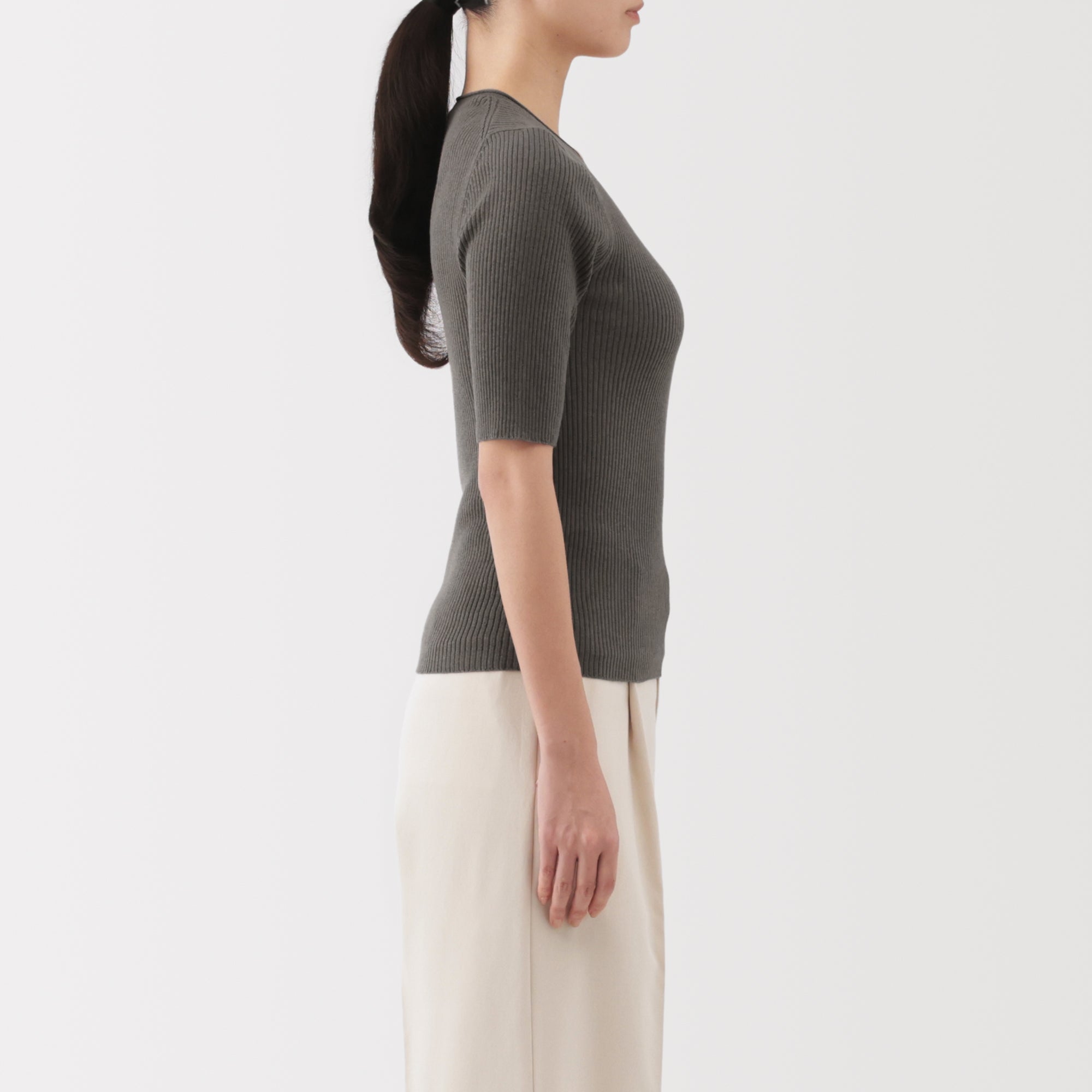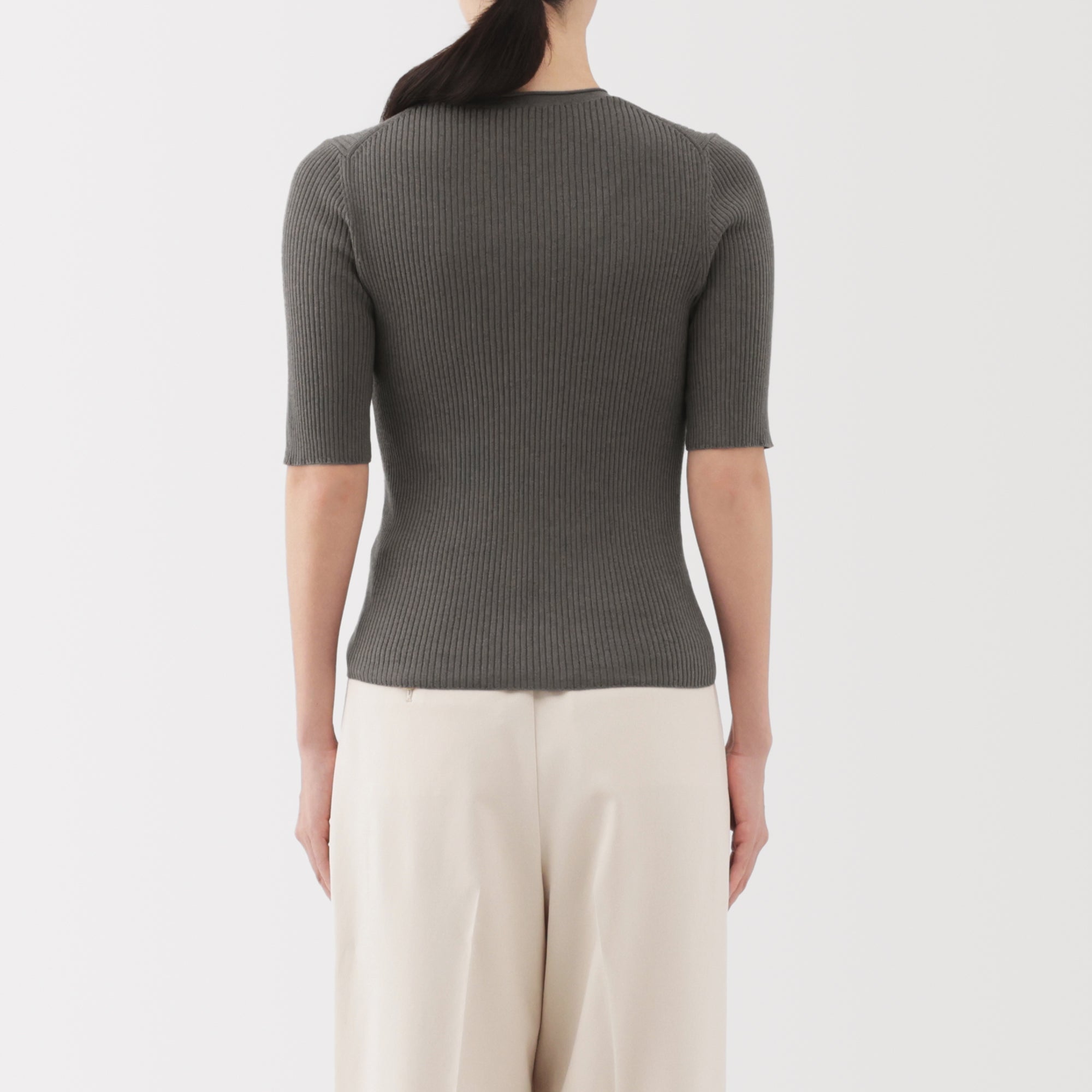 A lightweight half-sleeve sweater made from a blend of organic cotton and lyocell that is soft and smooth to the touch. It has a fitted silhouette with a flattering rib knit design for a clean. refined look.