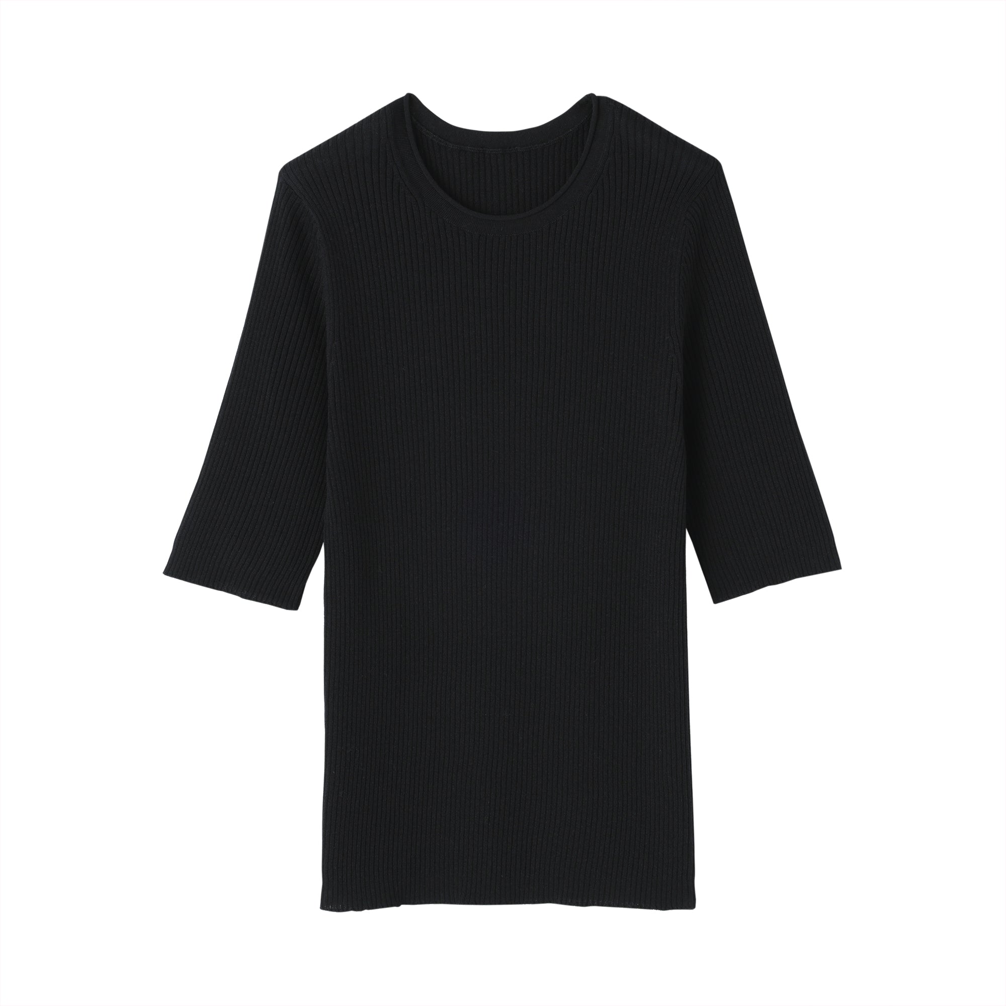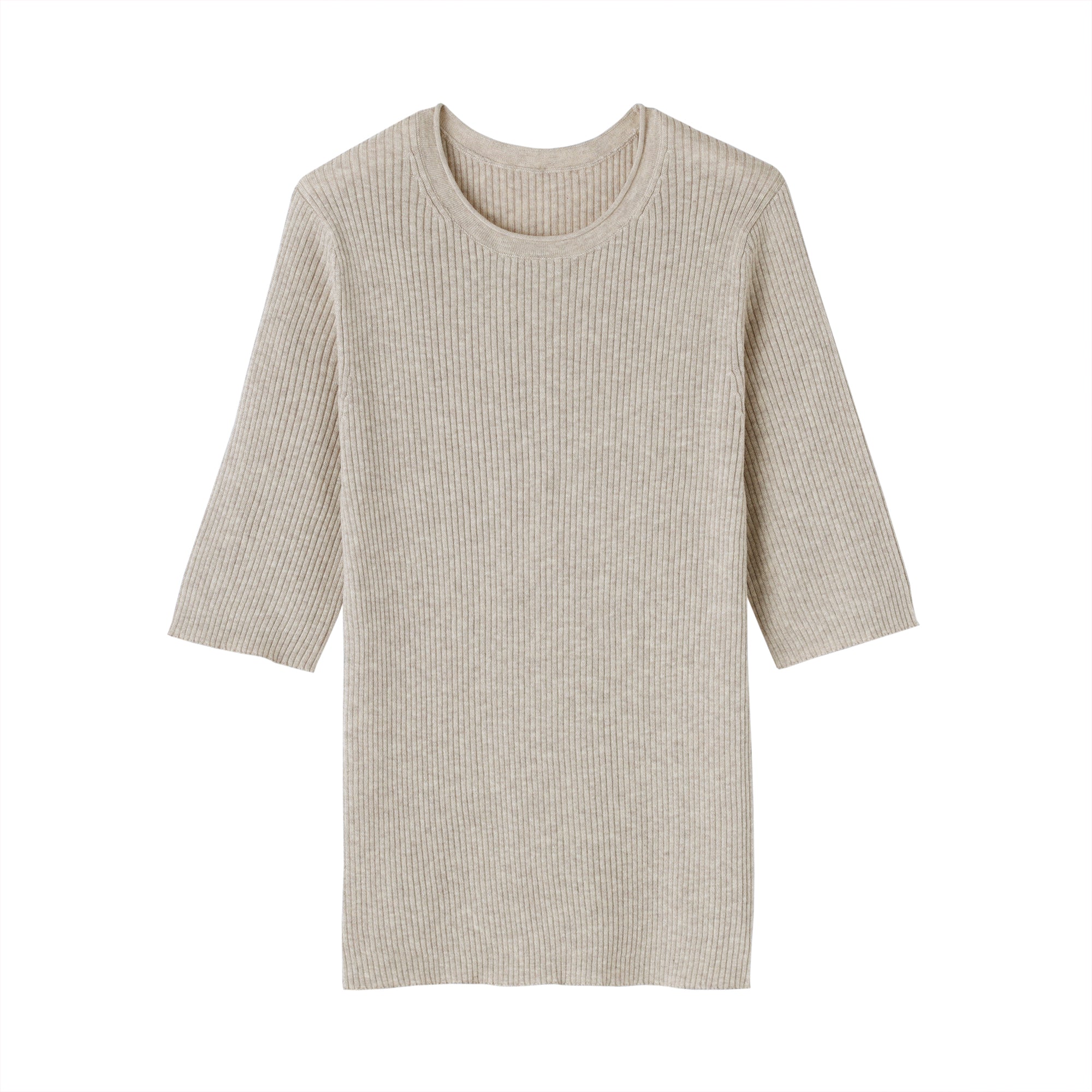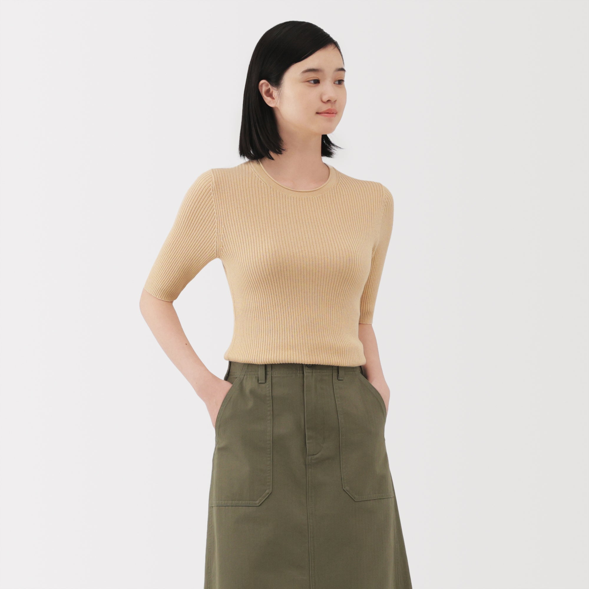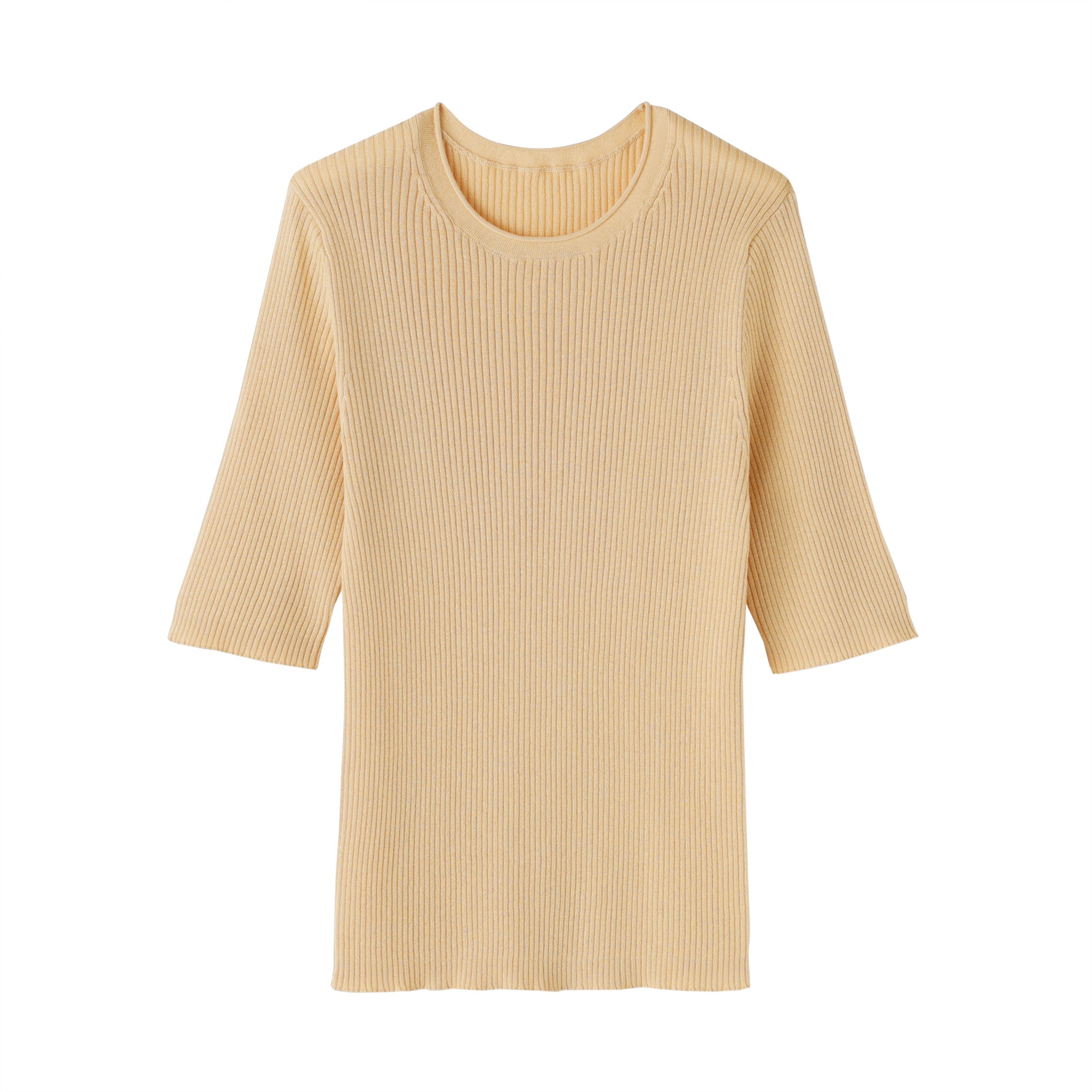 A lightweight half-sleeve sweater made from a blend of organic cotton and lyocell that is soft and smooth to the touch. It has a fitted silhouette with a flattering rib knit design for a clean. refined look.