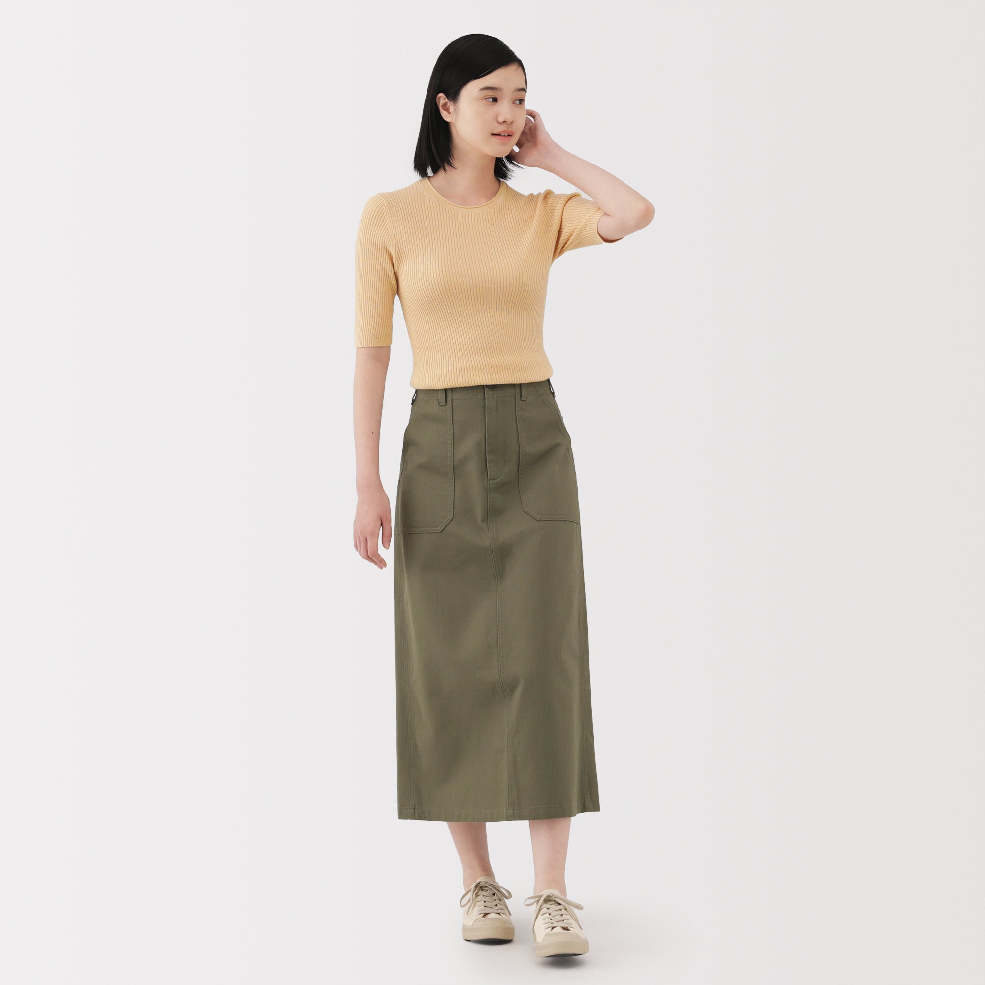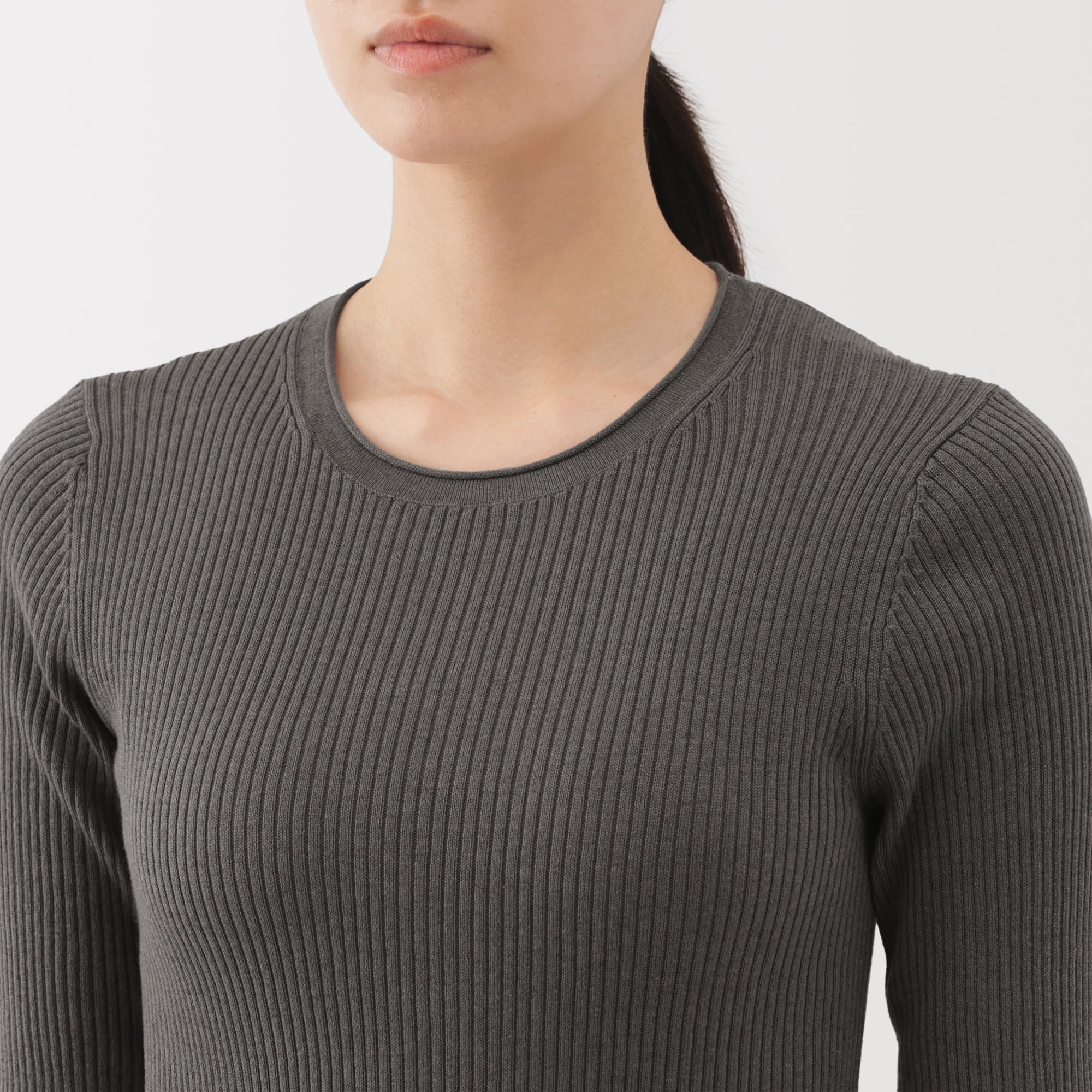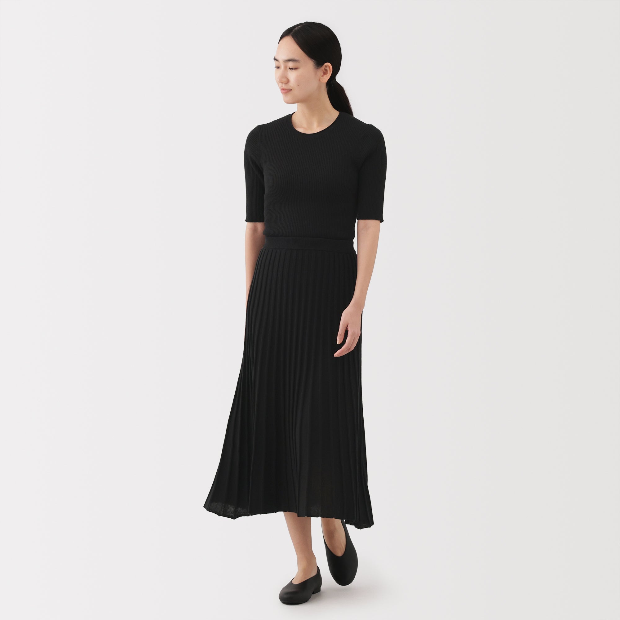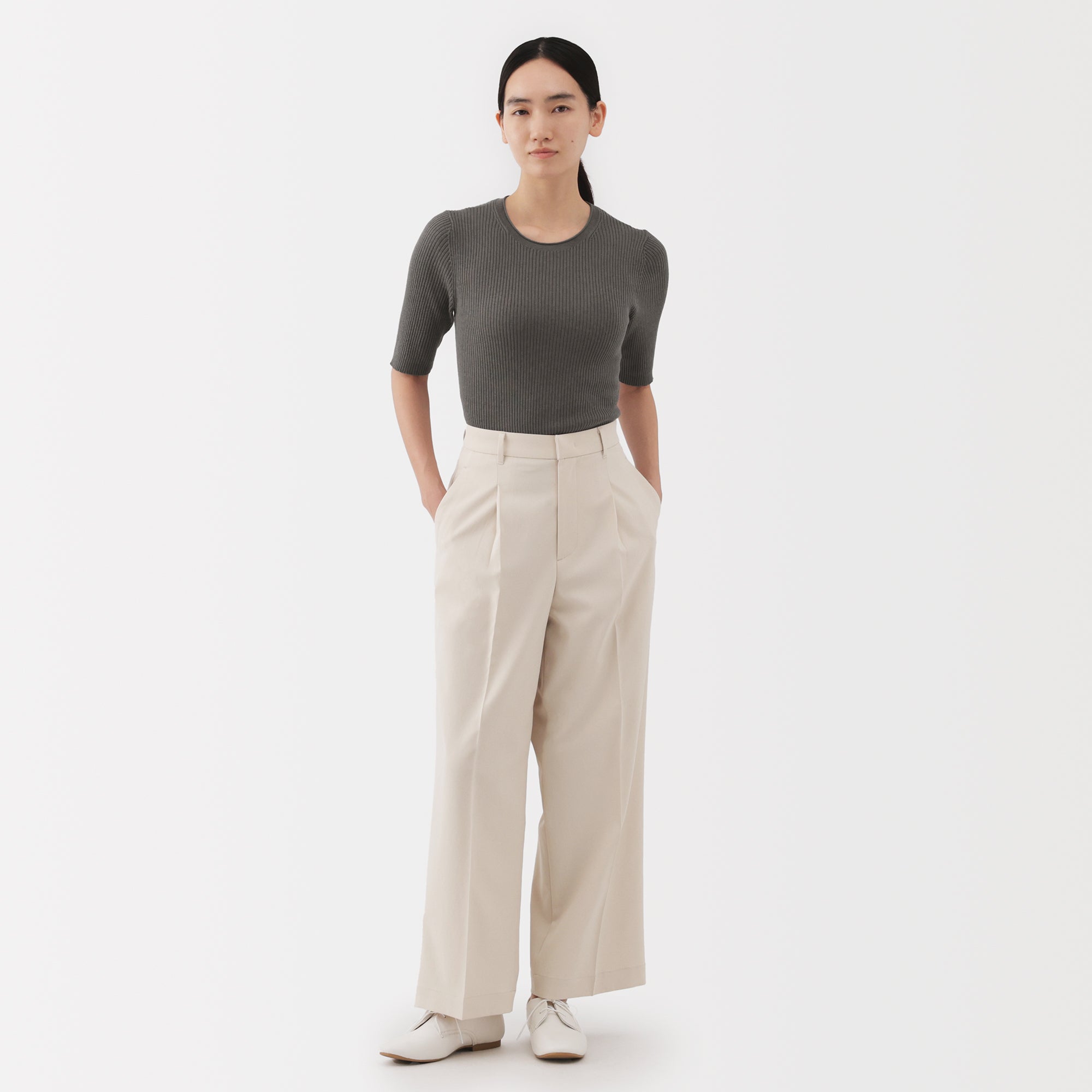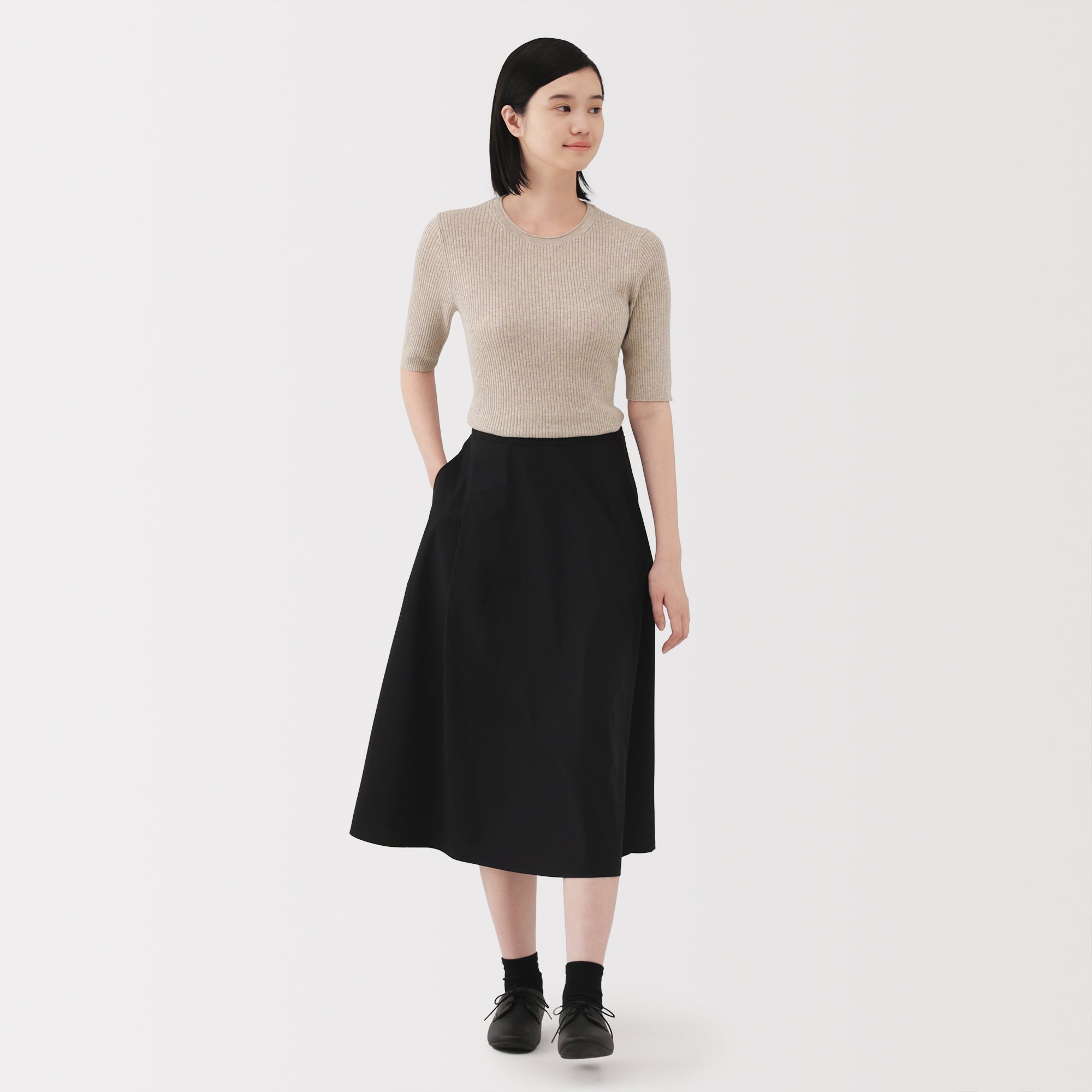 A lightweight half-sleeve sweater made from a blend of organic cotton and lyocell that is soft and smooth to the touch. It has a fitted silhouette with a flattering rib knit design for a clean. refined look.