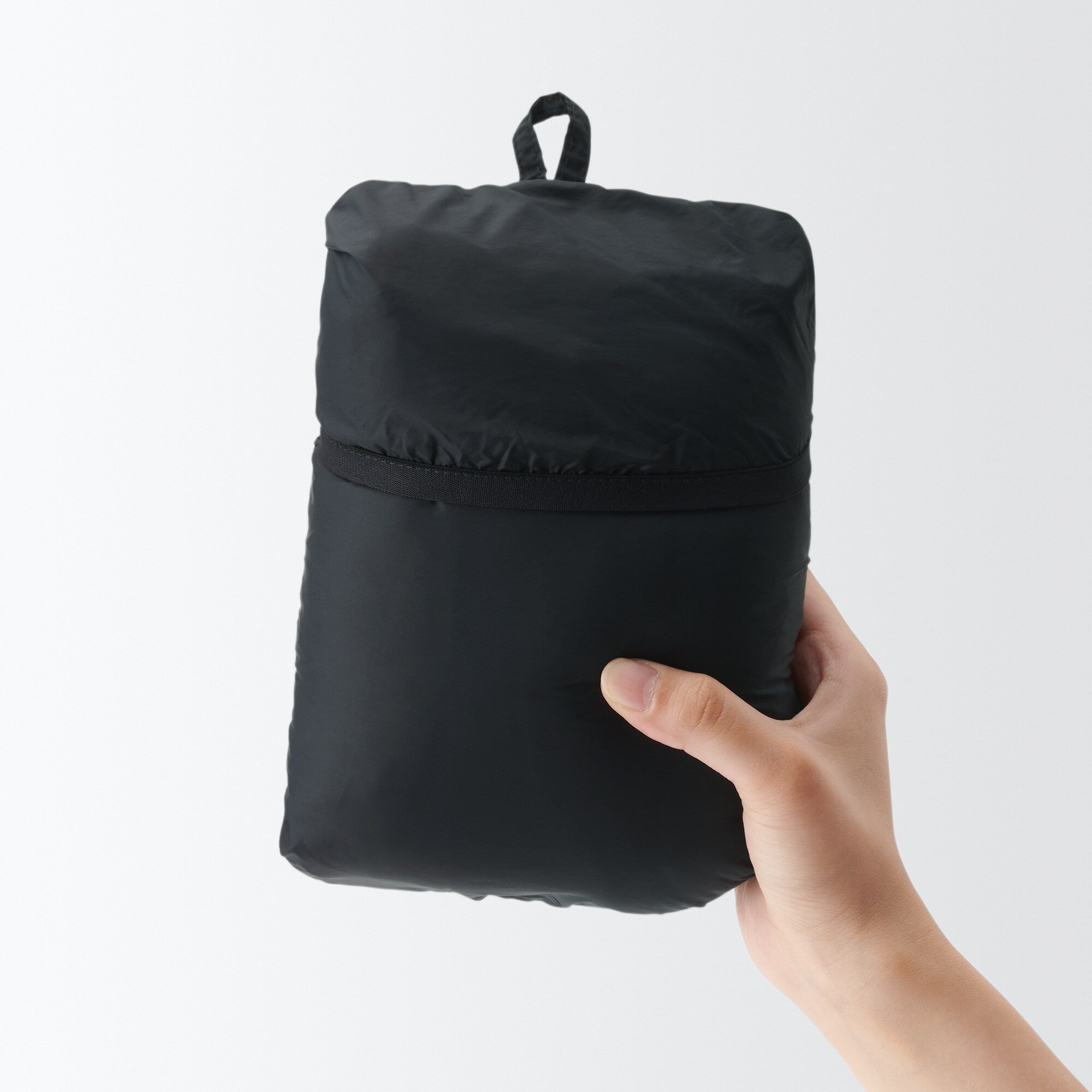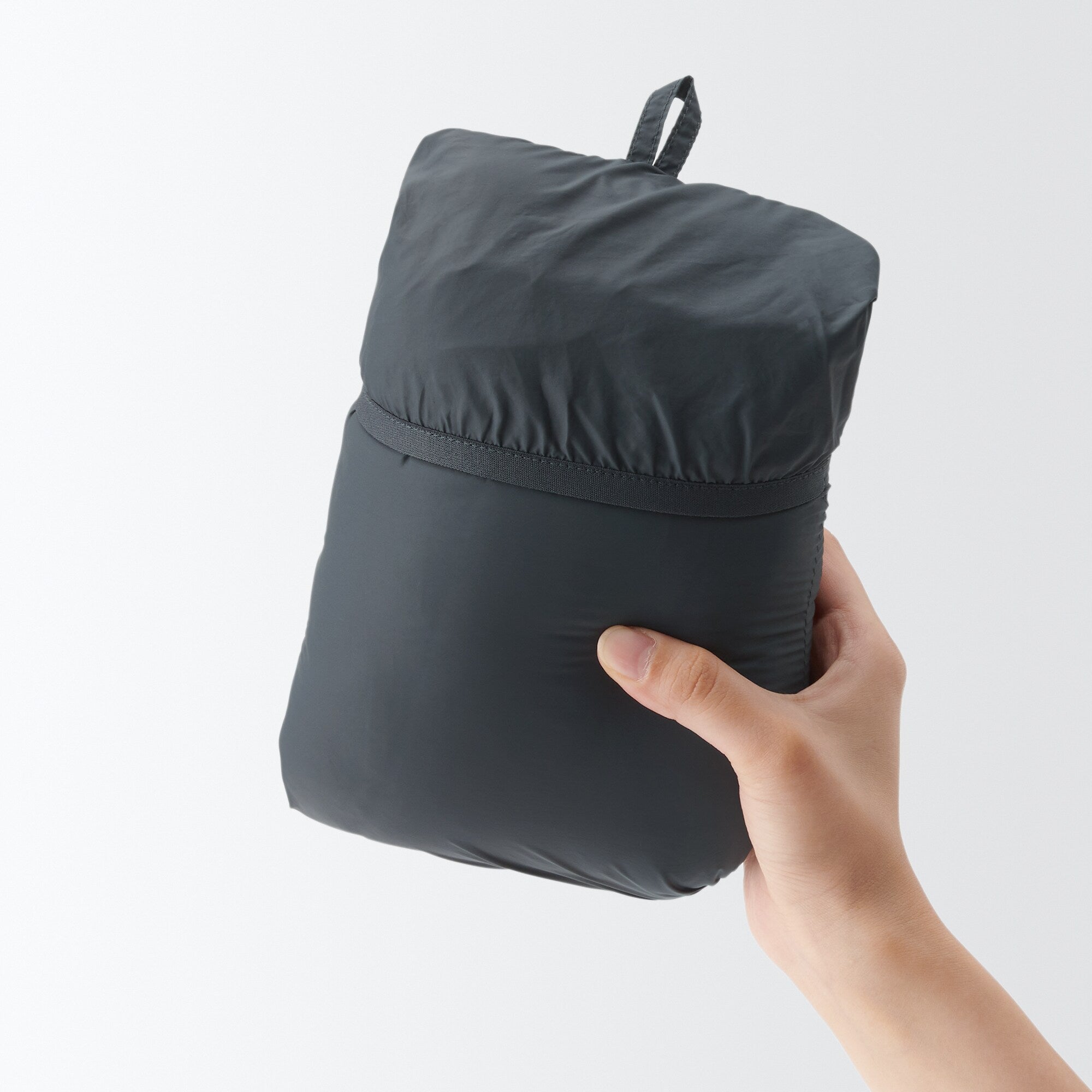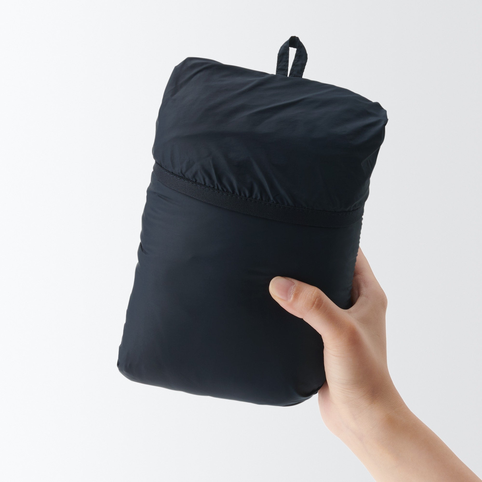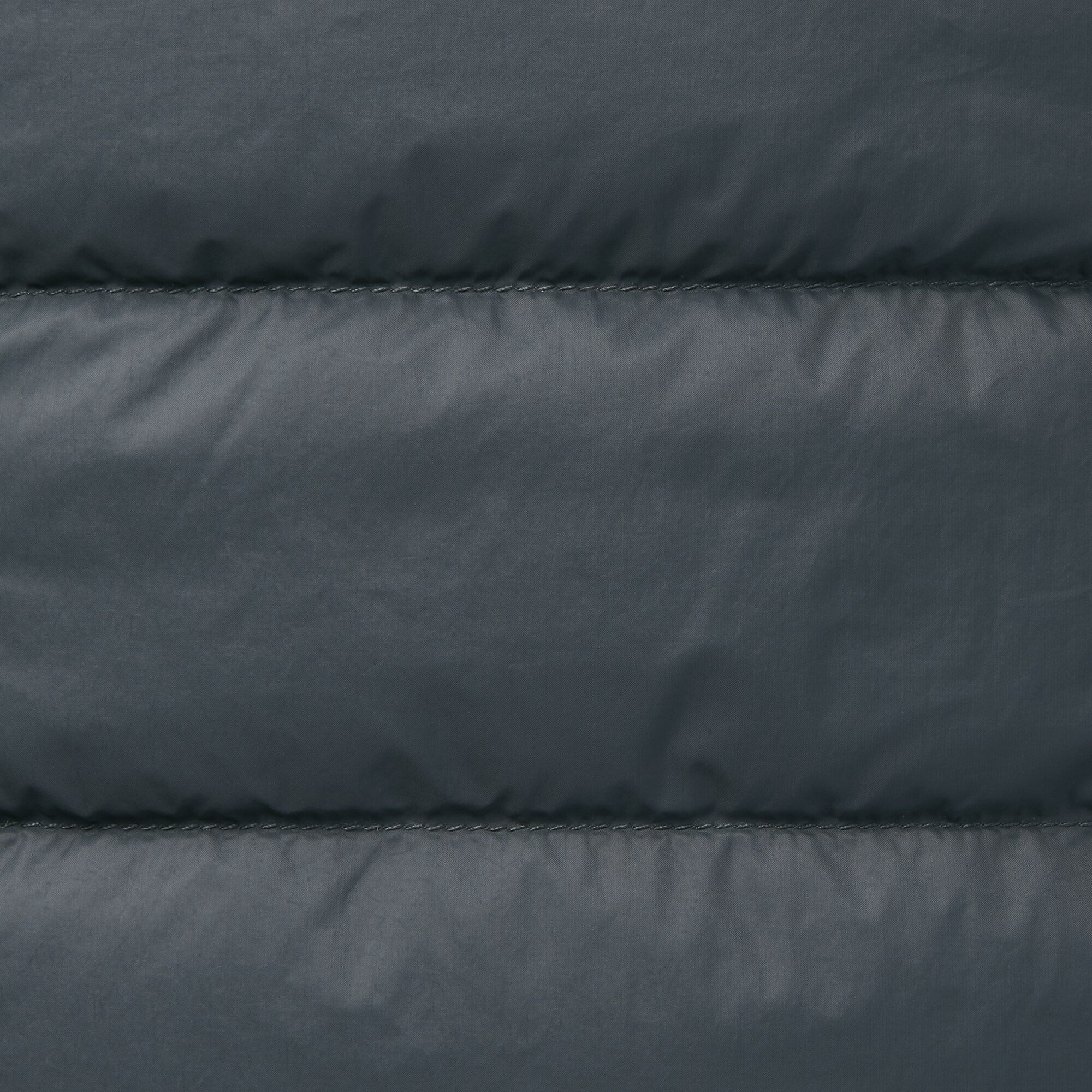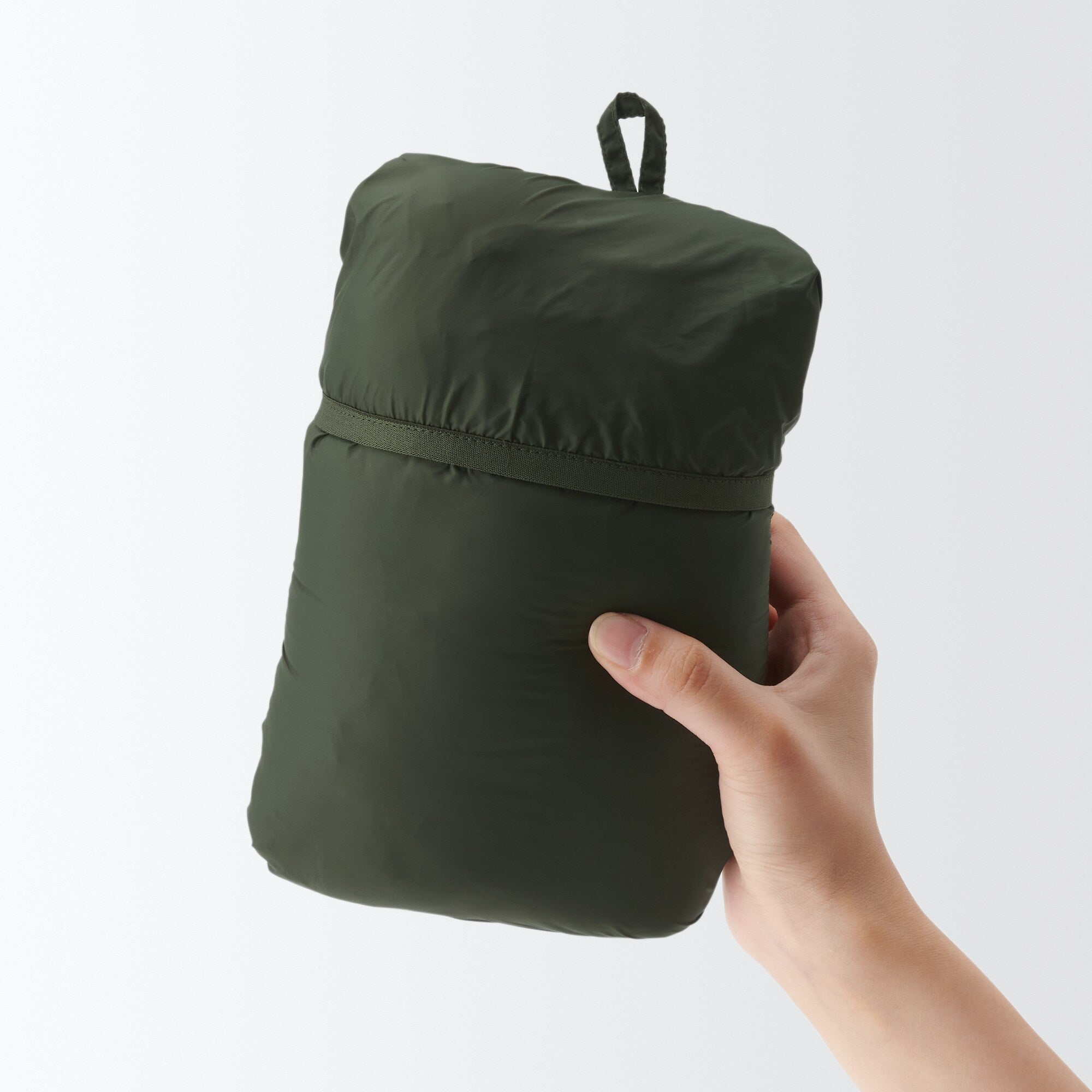 A lightweight down jacket made with recycled nylon fabric. Designed to be foldable and easy to carry. Thick and light enough to be layered in the winter.