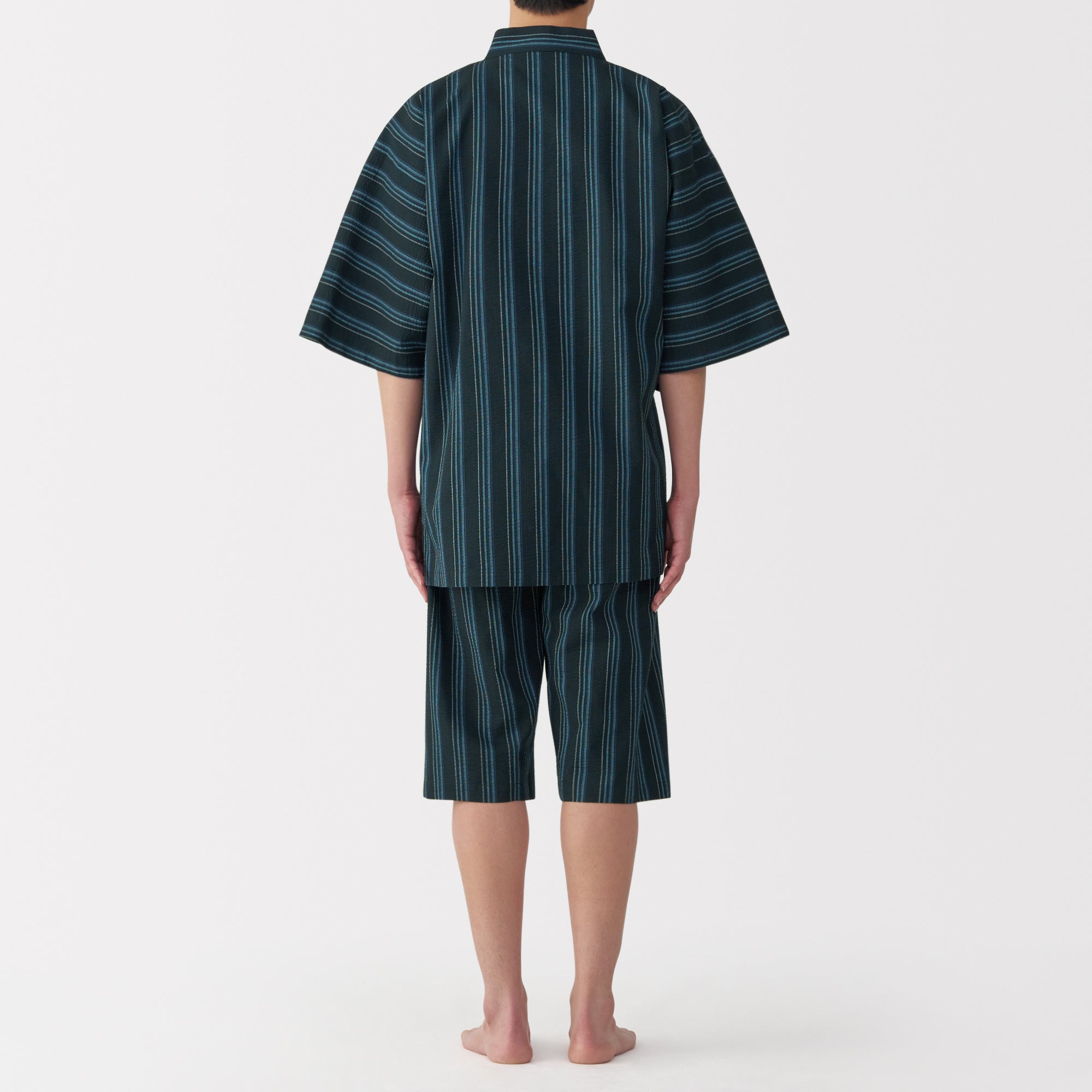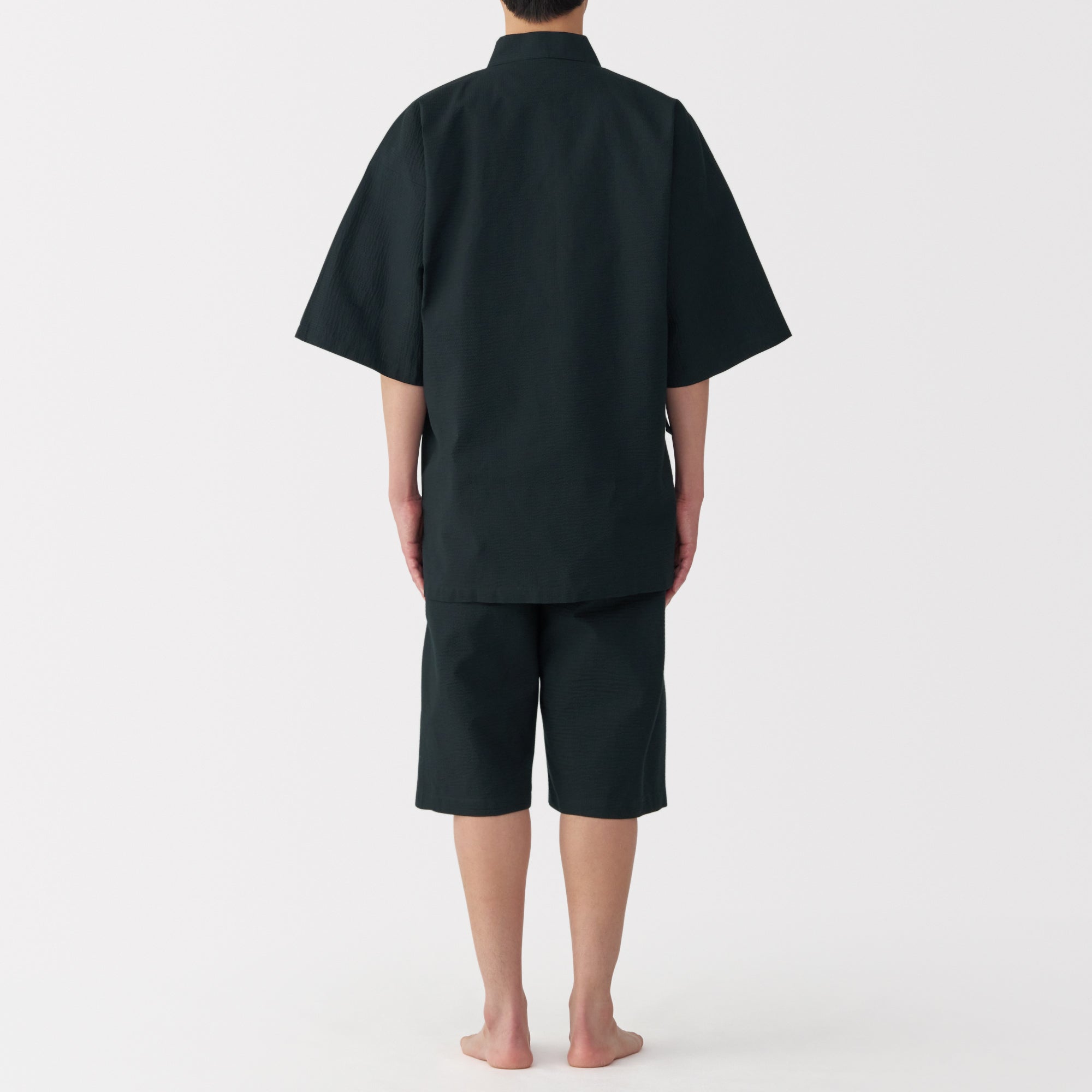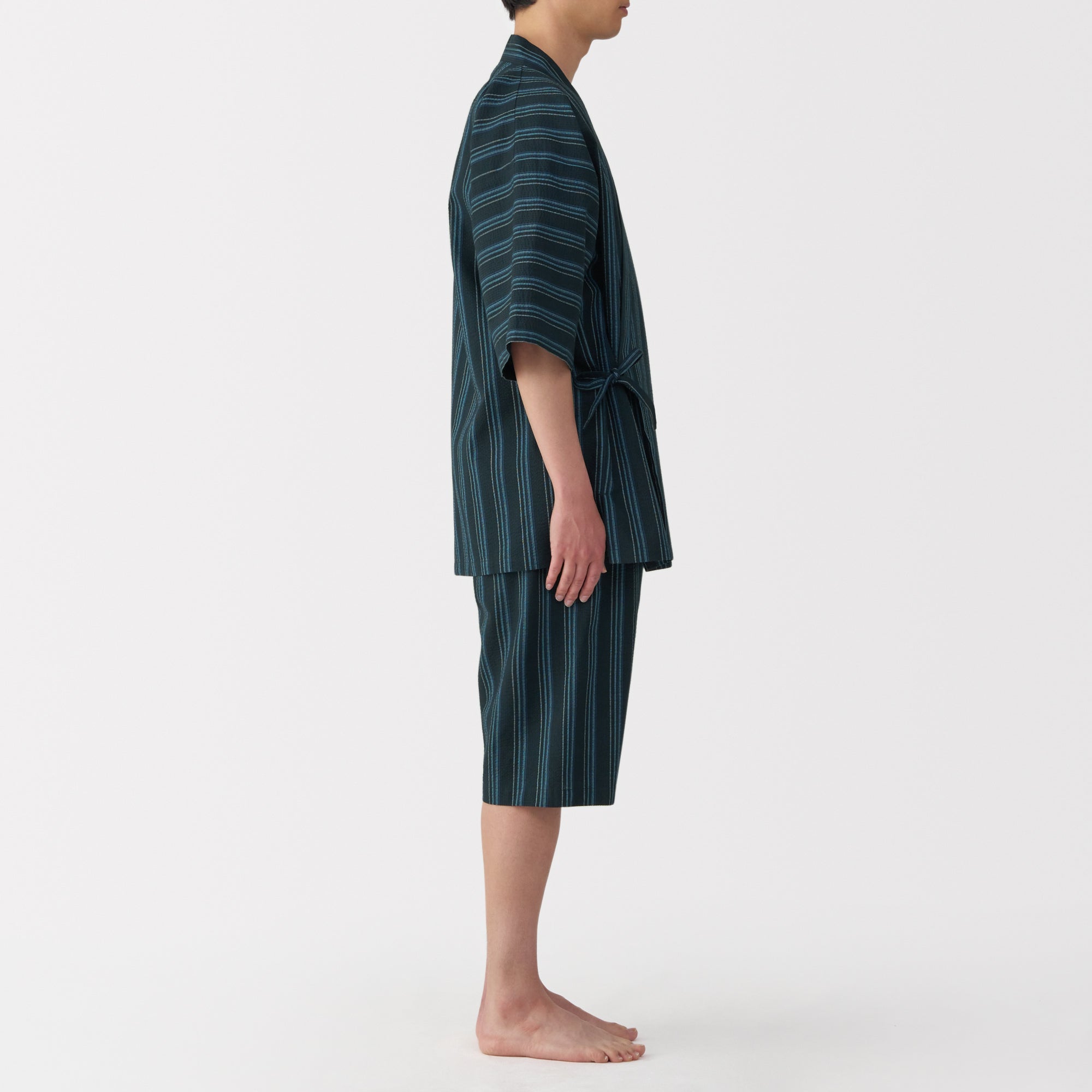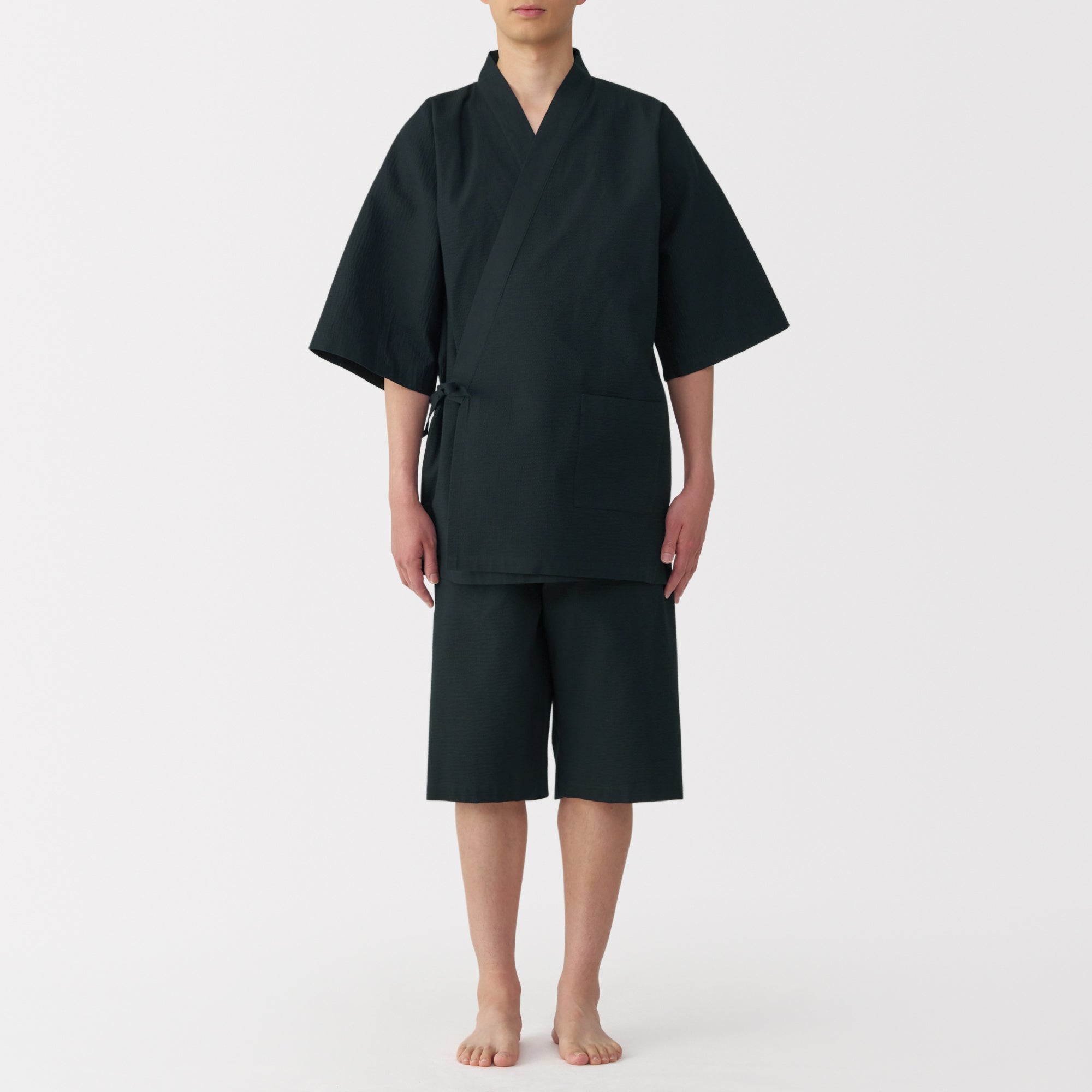 Relax in the comfort of traditional Japanese loungewear with this Shijira Jinbei set! Made from soft and breathable organic cotton for ultimate comfort. this set was designed with a relaxed fit and unique crepe-like texture. so you can stay cool even on the warmest nights. The fabric is dry and crisp with a slightly rough texture that softens over time with each wash and wear. The open weave of Shijira fabric allows for excellent airflow. preventing the material from sticking to your skin. Great for unbeatable comfort in any weather!