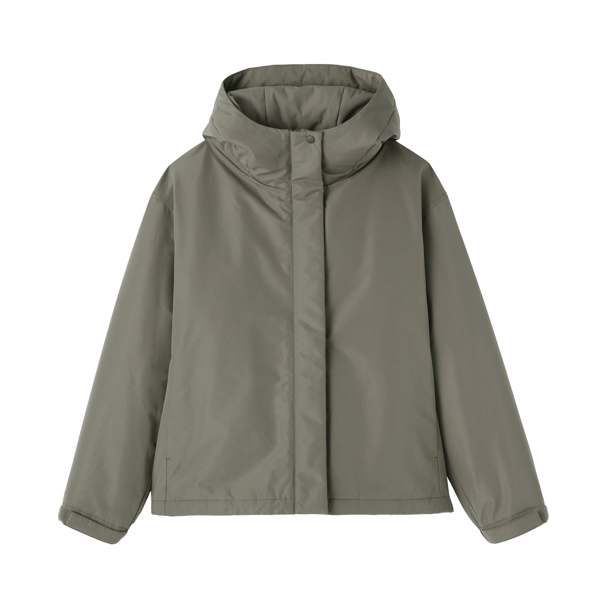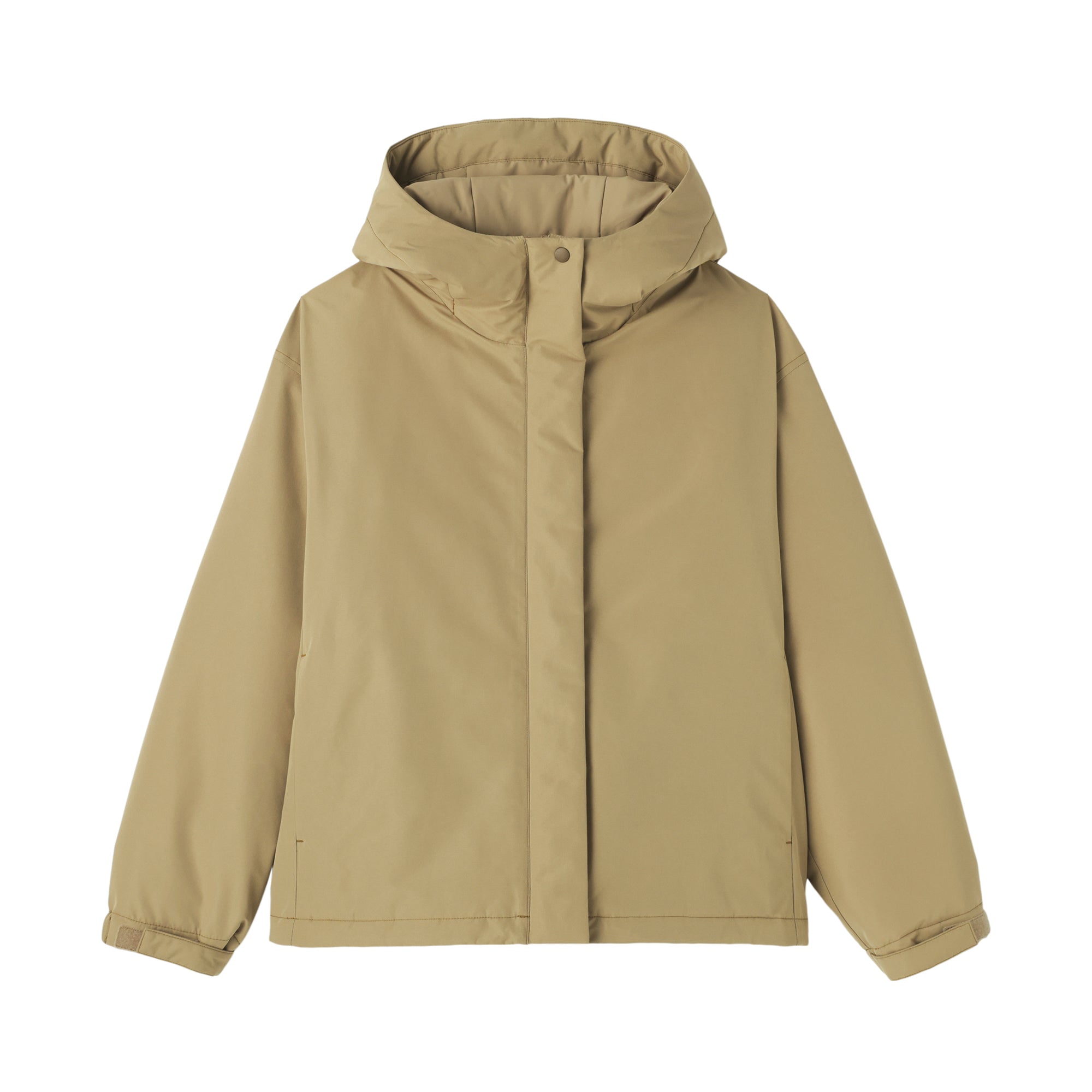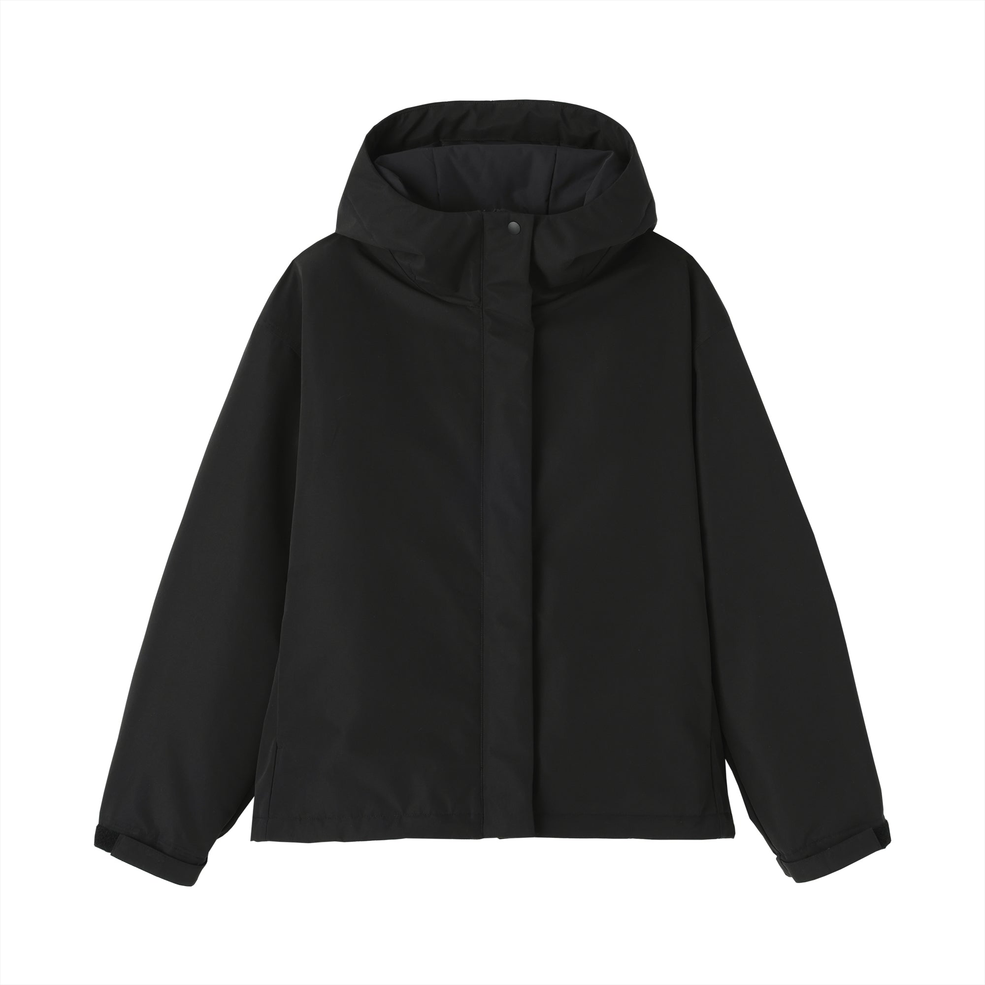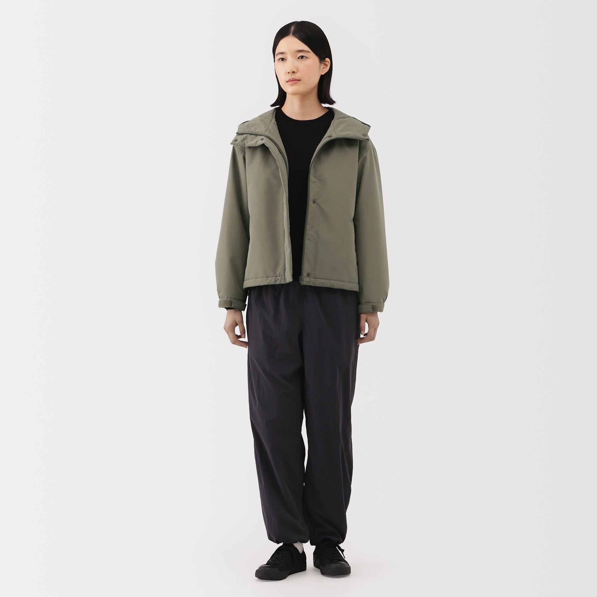 A women’s water repellent padded jacket with a hood that will keep you warm and dry in the winter. Uses recycled polyester.