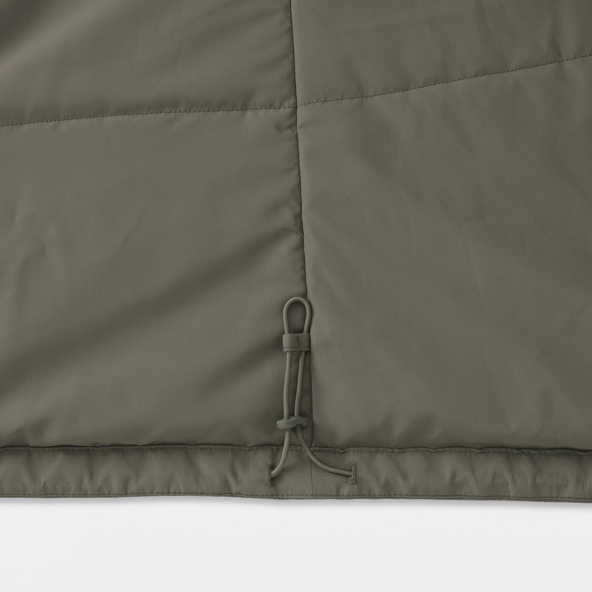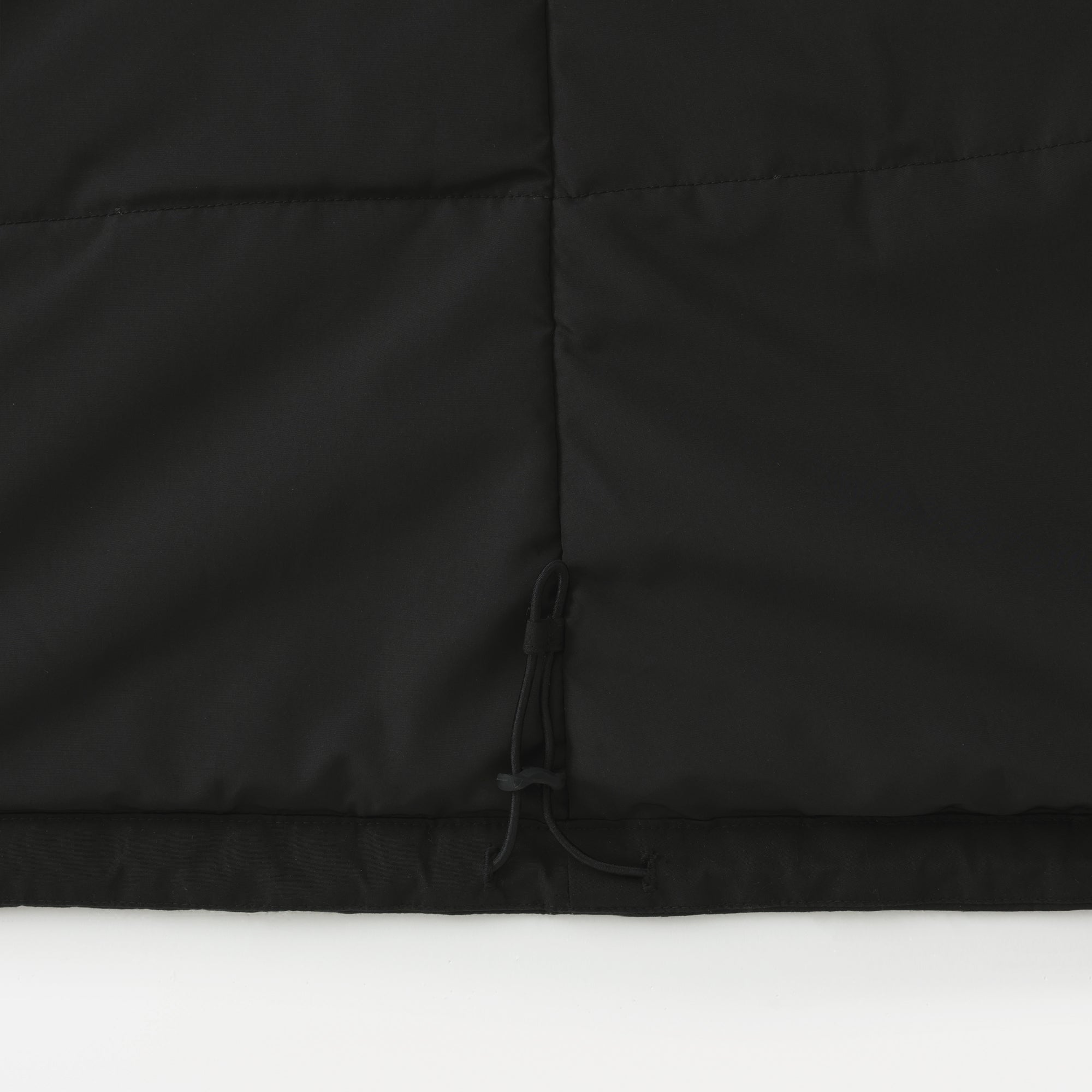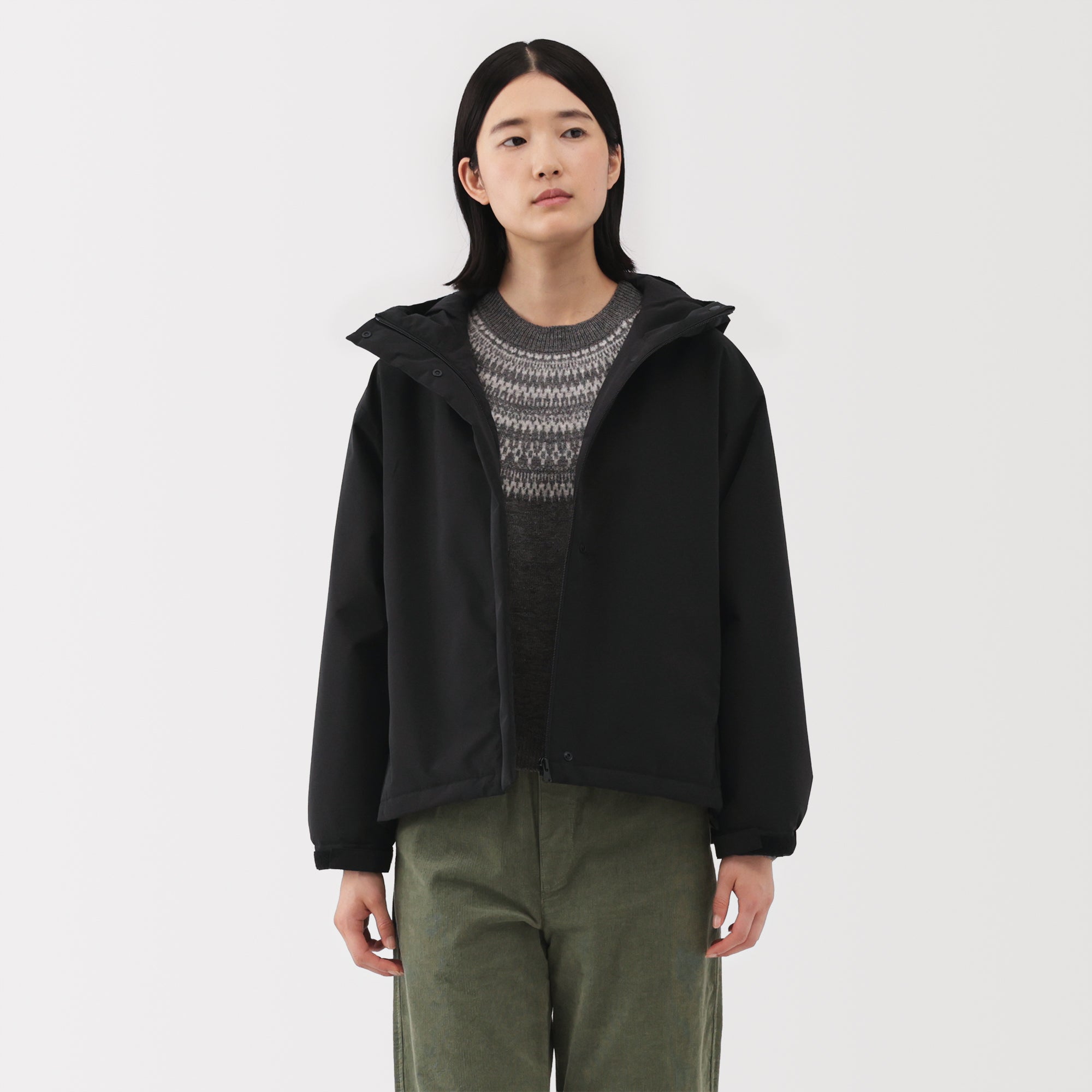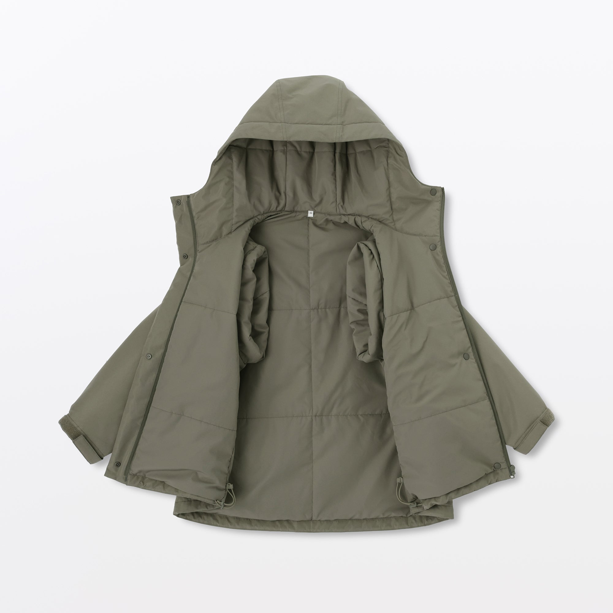A women’s water repellent padded jacket with a hood that will keep you warm and dry in the winter. Uses recycled polyester.