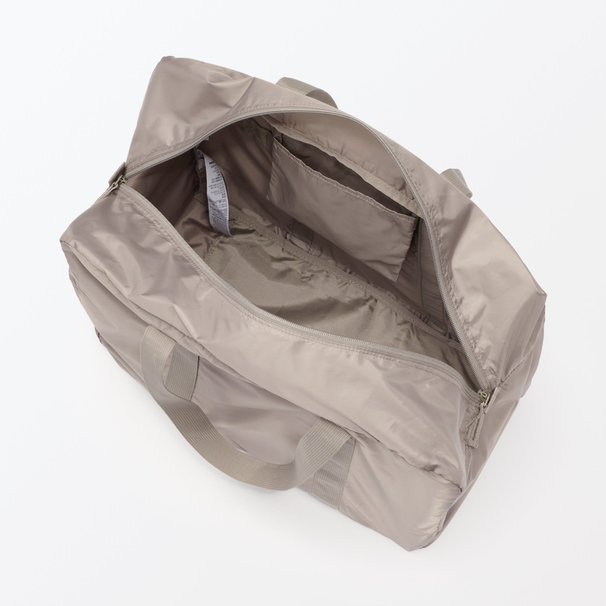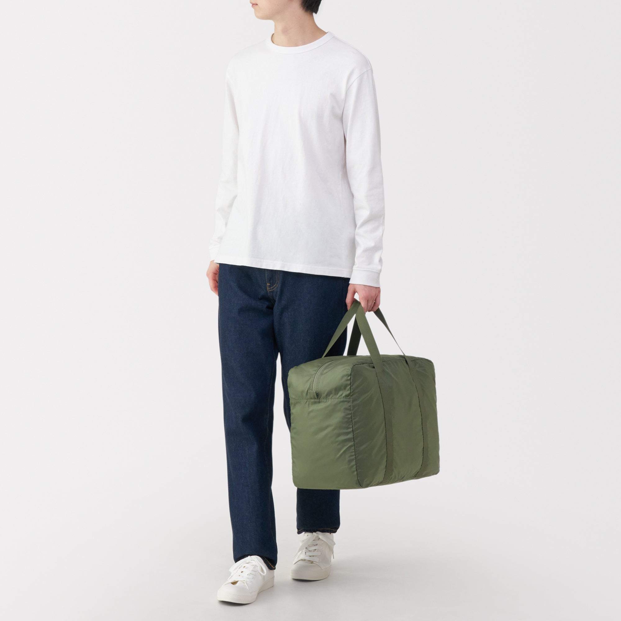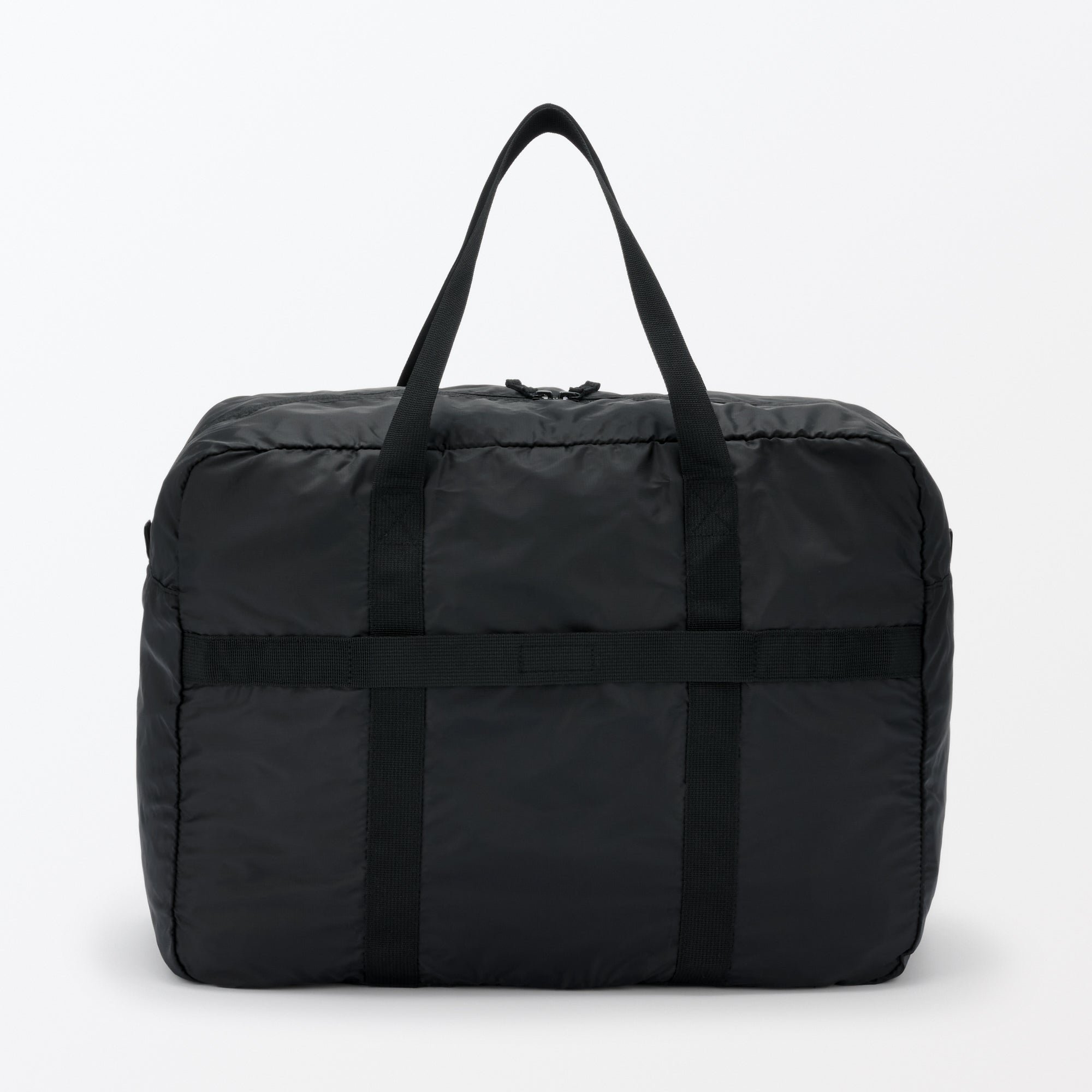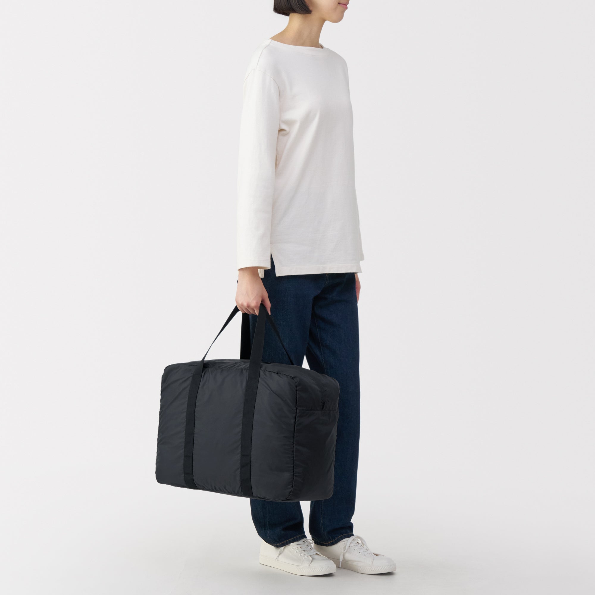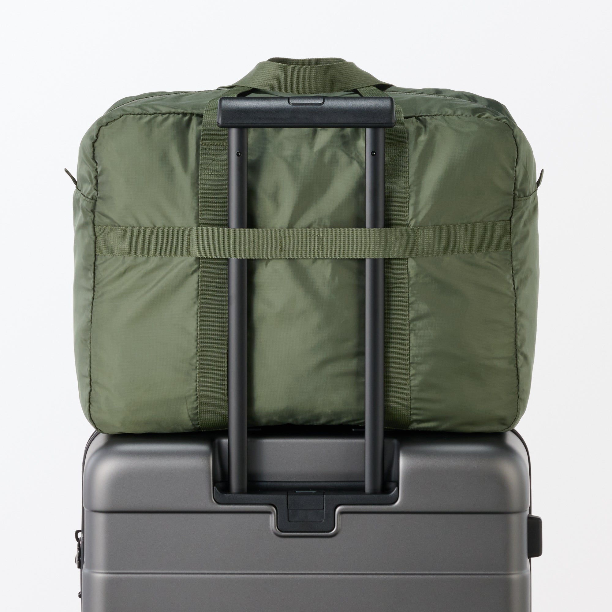 A weekend bag with a compact. foldable design that makes it easy to store when not in use. Made with a water-repellent recycled polyester material so it can be used in all types of weather. The bag also features a luggage strap for your convenience. allowing you to easily secure it to your suitcase handle.