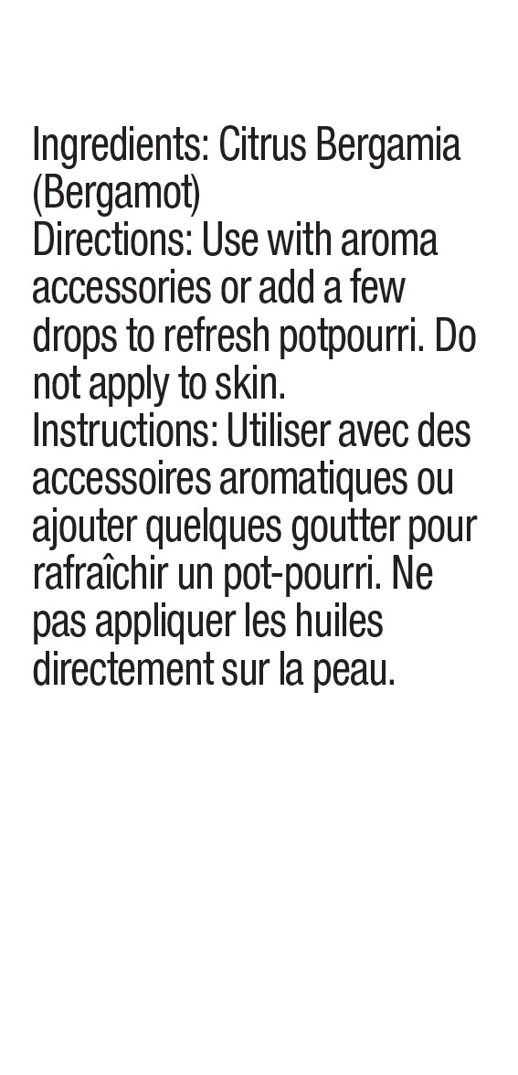 The Bergamot plant produces a citrus fruit. from which oil is extracted from its rinds. This oil has a sweet. citrus and floral-like scent. reminiscent of Earl Gray tea. Use with aroma accessories or add a few drops to refresh potpourri.