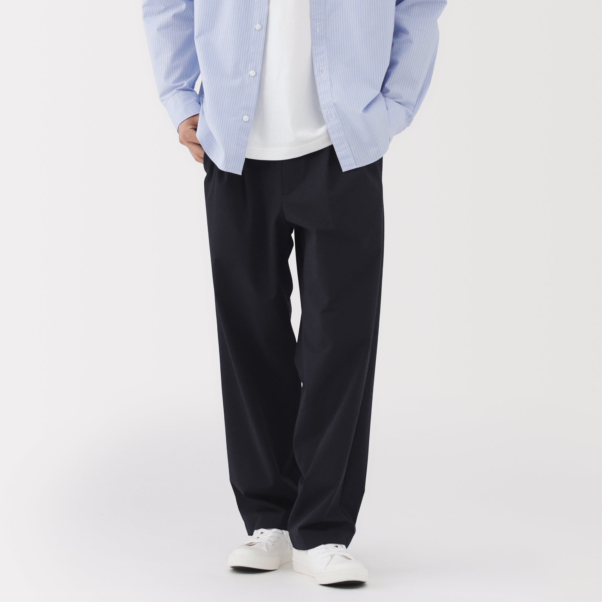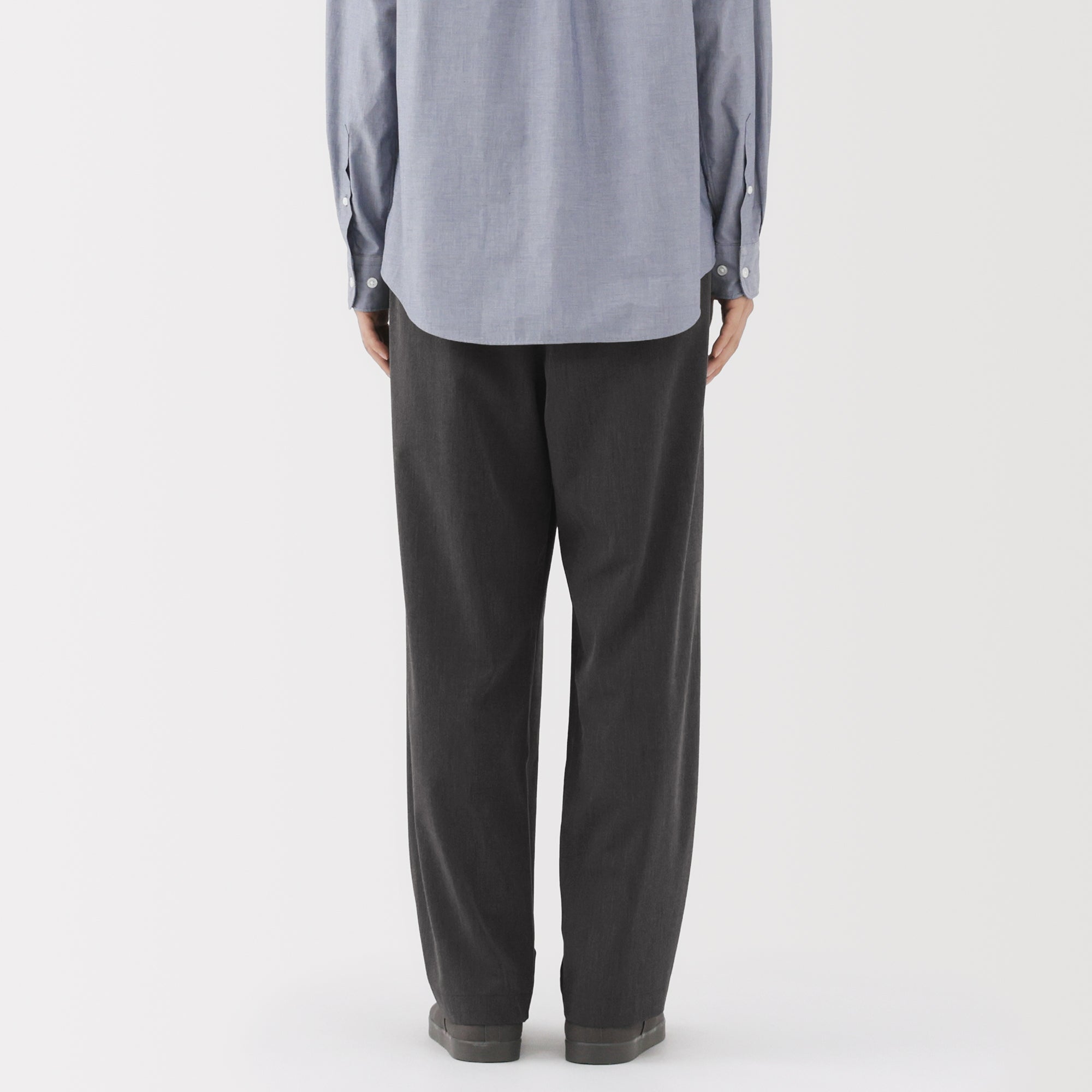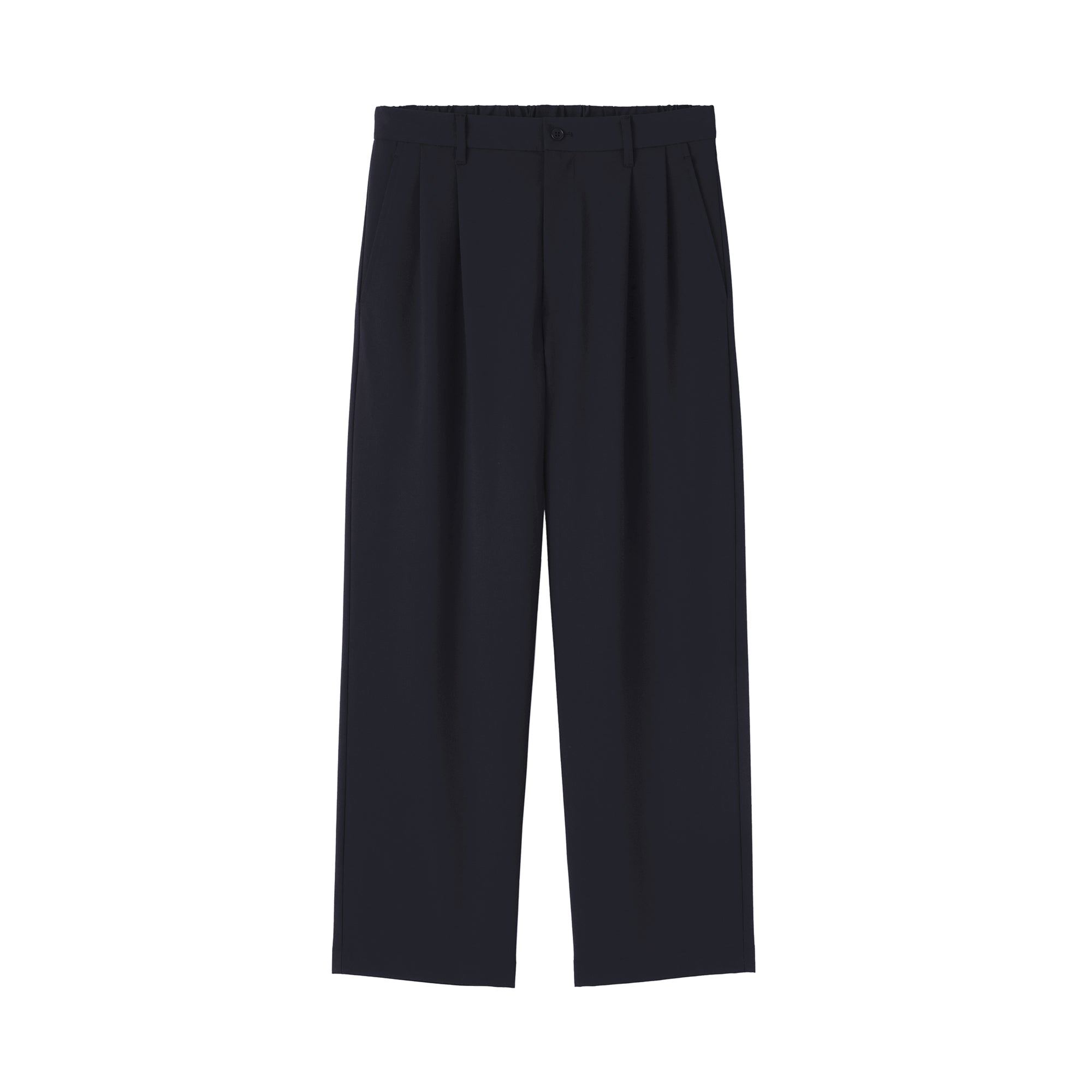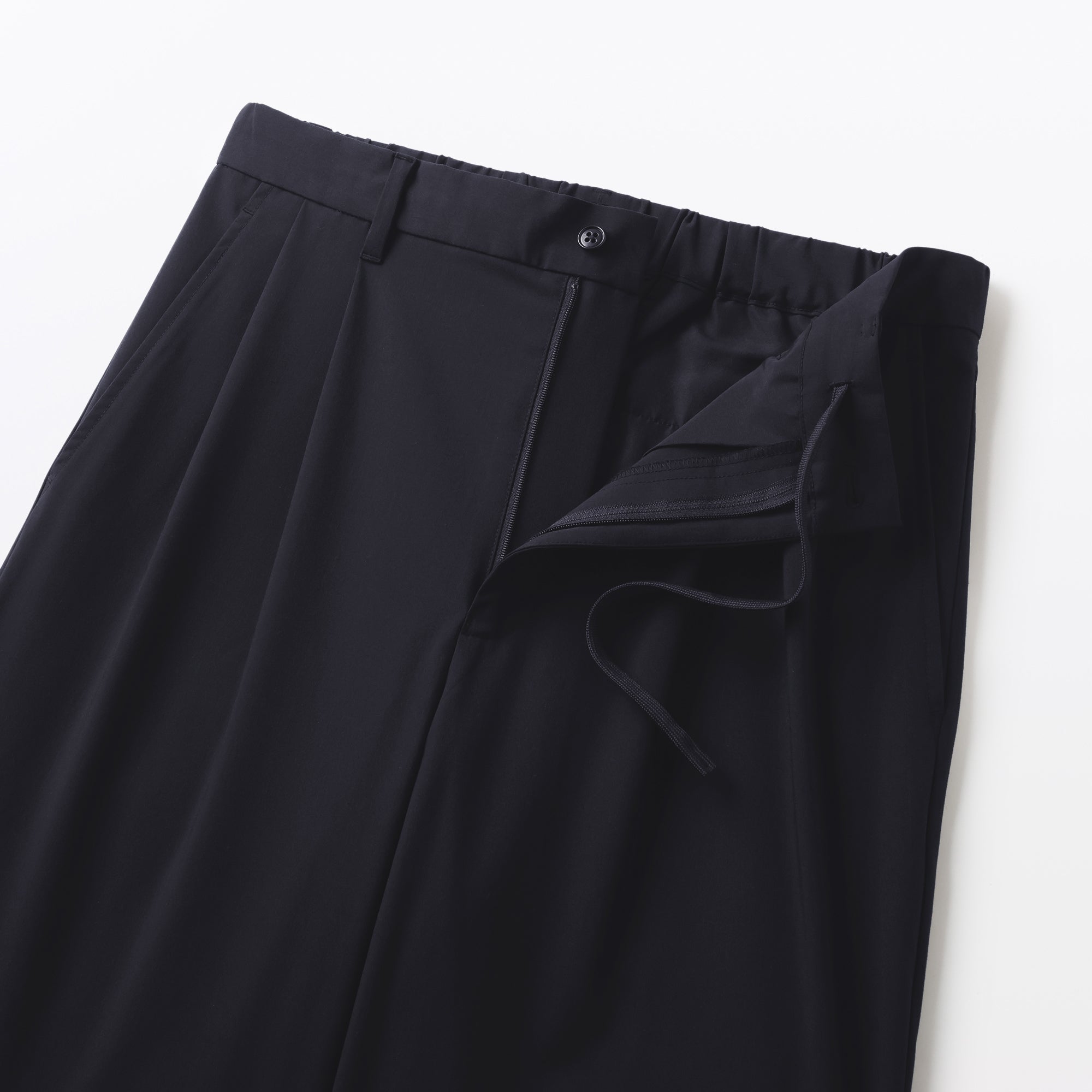 Wide-leg. relaxed fit pants with front darts. made with recycled material that dries quickly after washing. The darts add a three-dimensional effect to the front of the pants. There is a drawstring on the inside of the waistband for an adjustable fit.