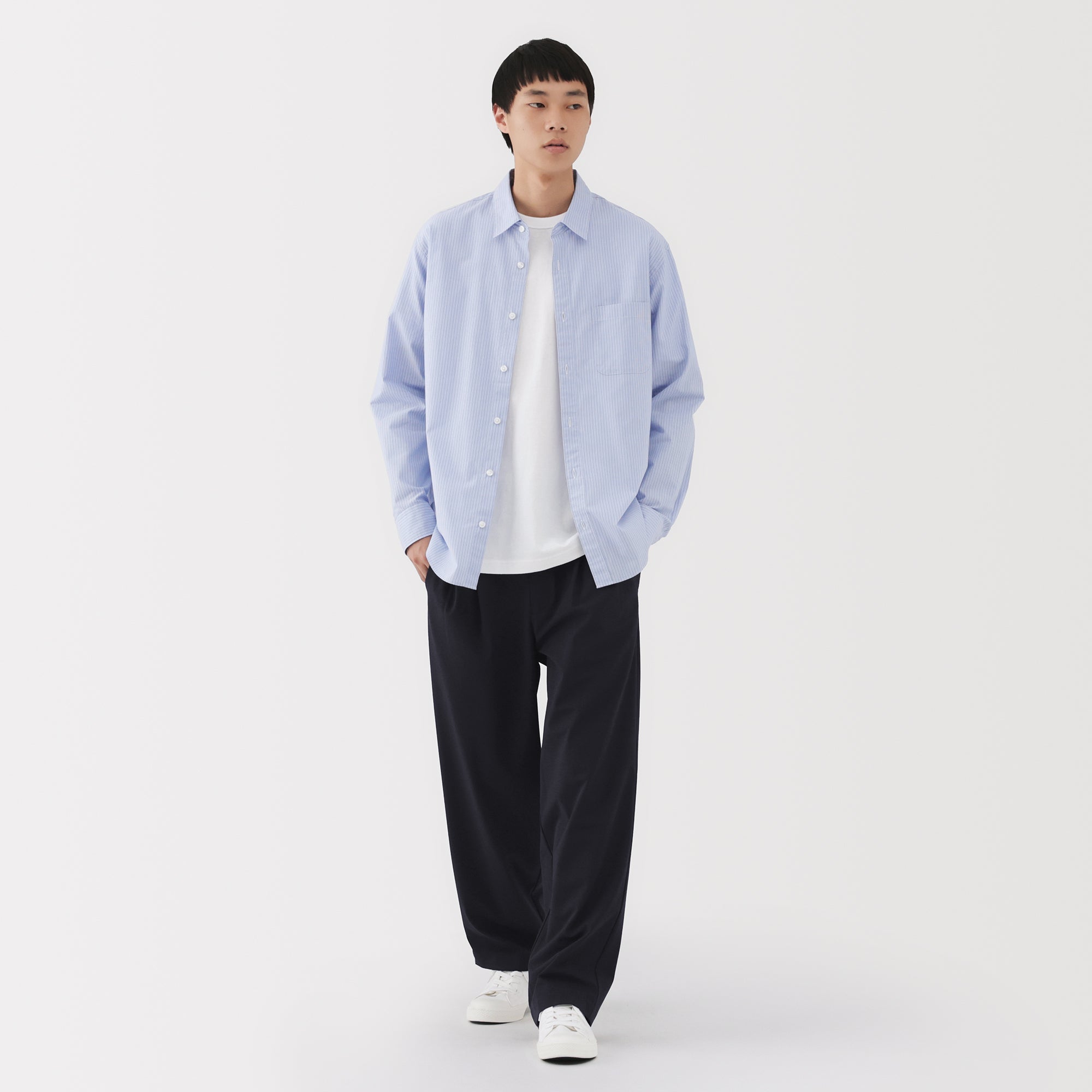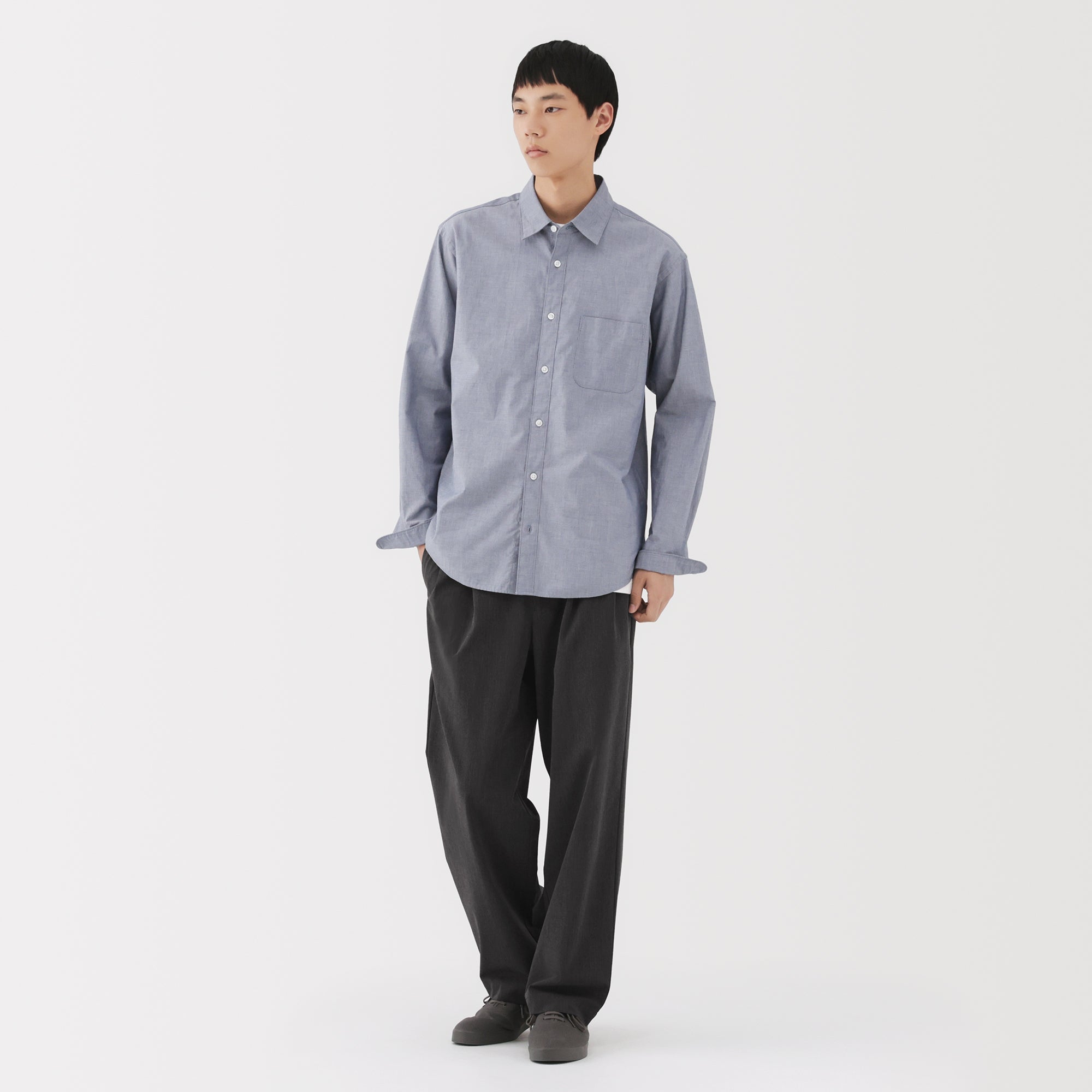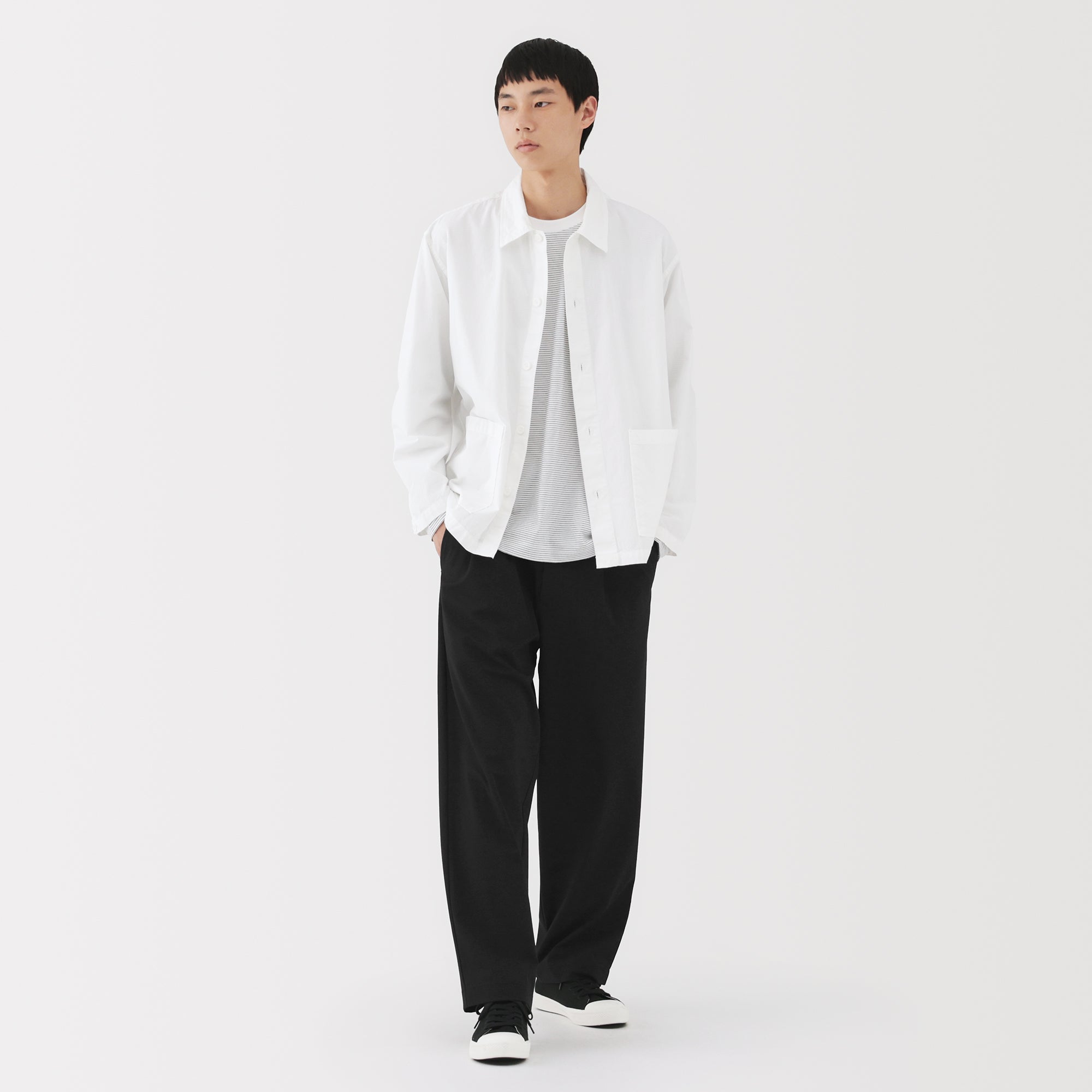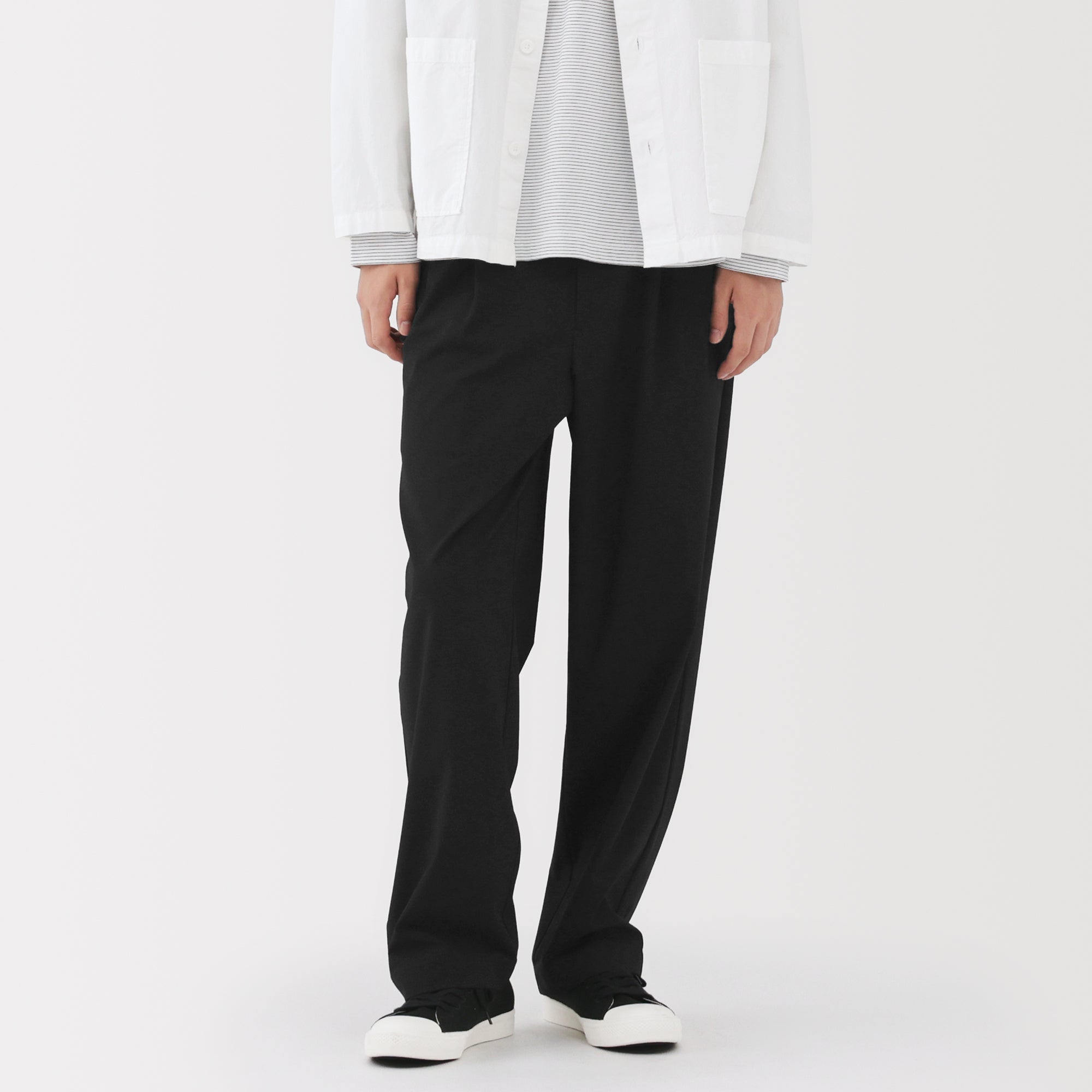 Wide-leg. relaxed fit pants with front darts. made with recycled material that dries quickly after washing. The darts add a three-dimensional effect to the front of the pants. There is a drawstring on the inside of the waistband for an adjustable fit.