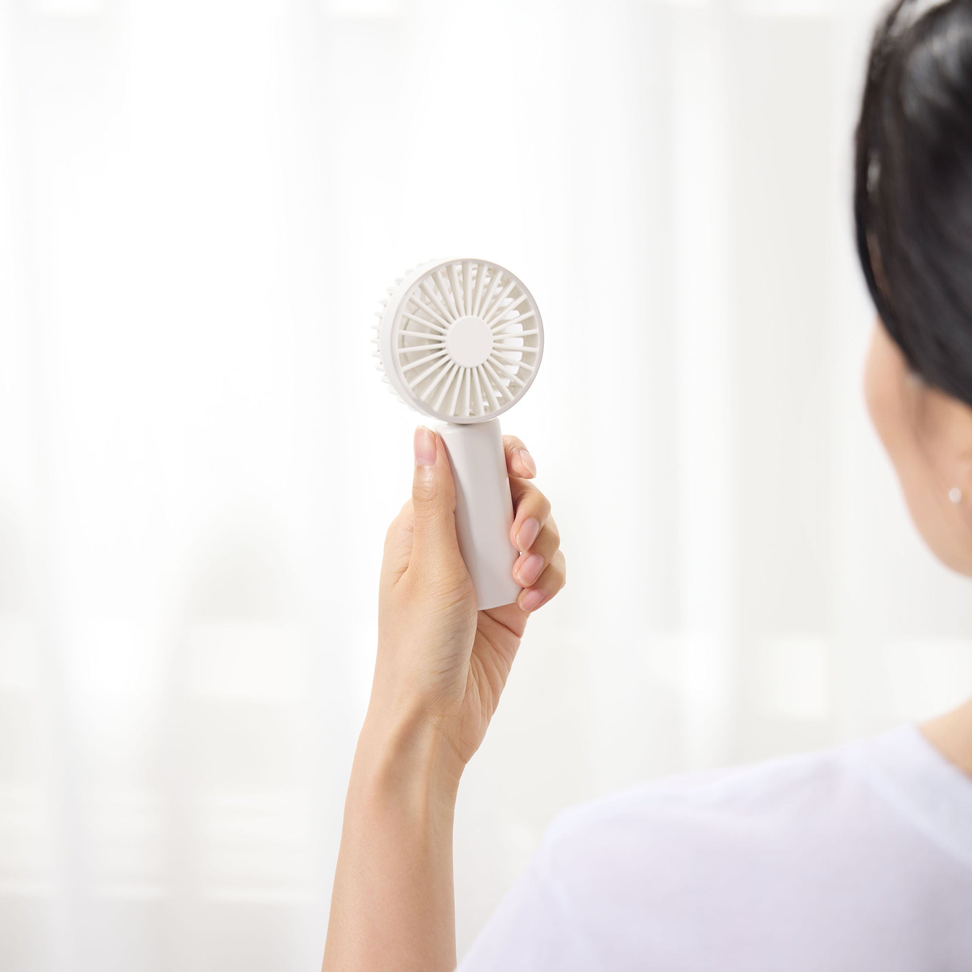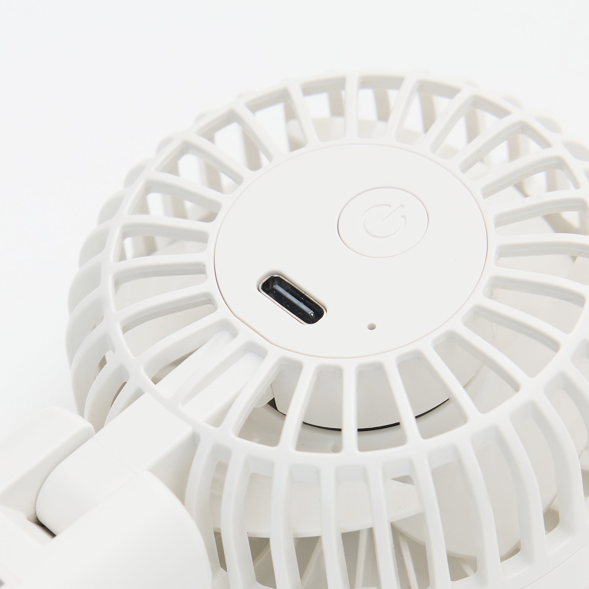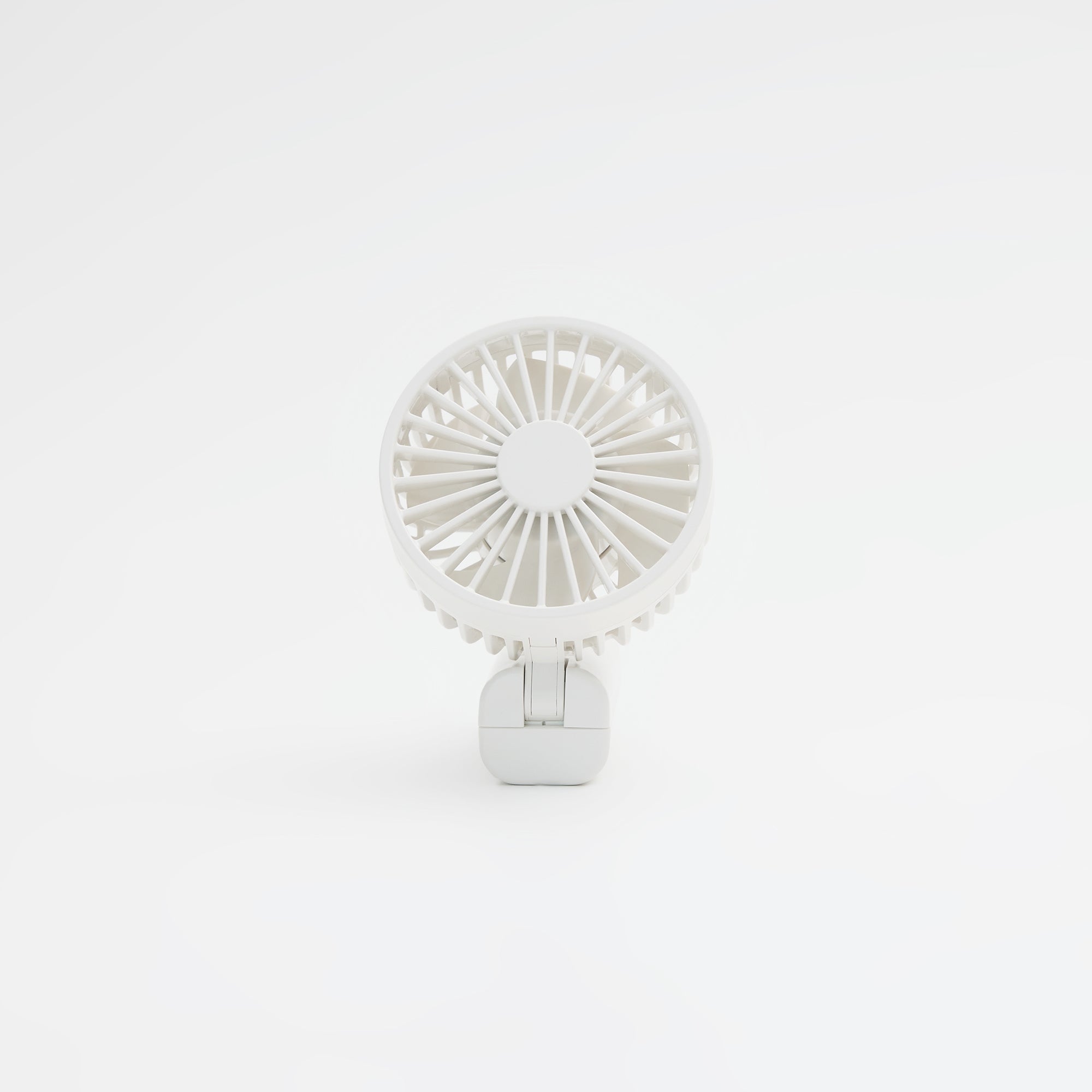 This portable fan is the perfect size to bring with you on the go. The head is foldable up to 120°. so it can be angled up and used on a tabletop as well. Simple button control allows you to easily turn the fan on/off and cycle through the 4 levels of wind speed.