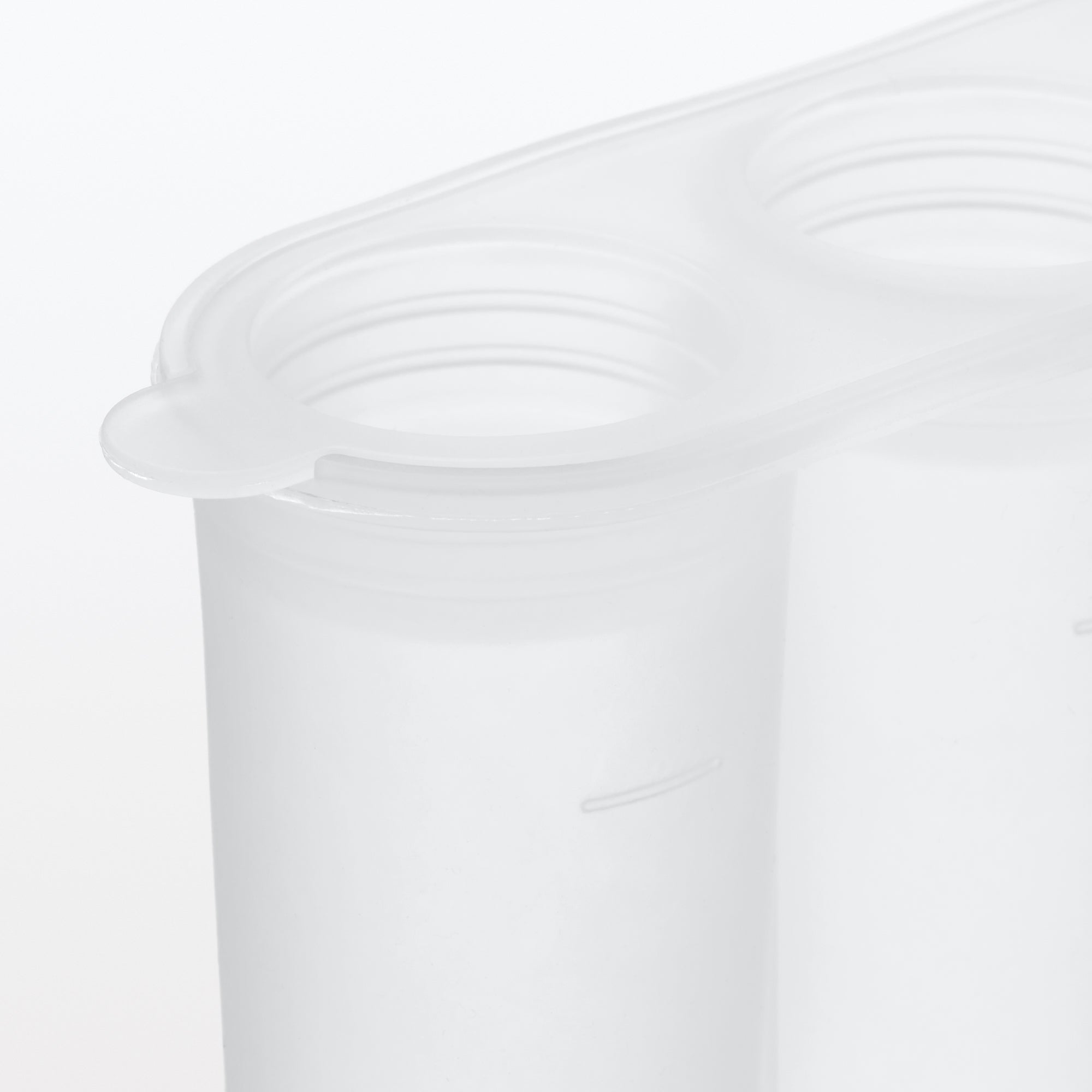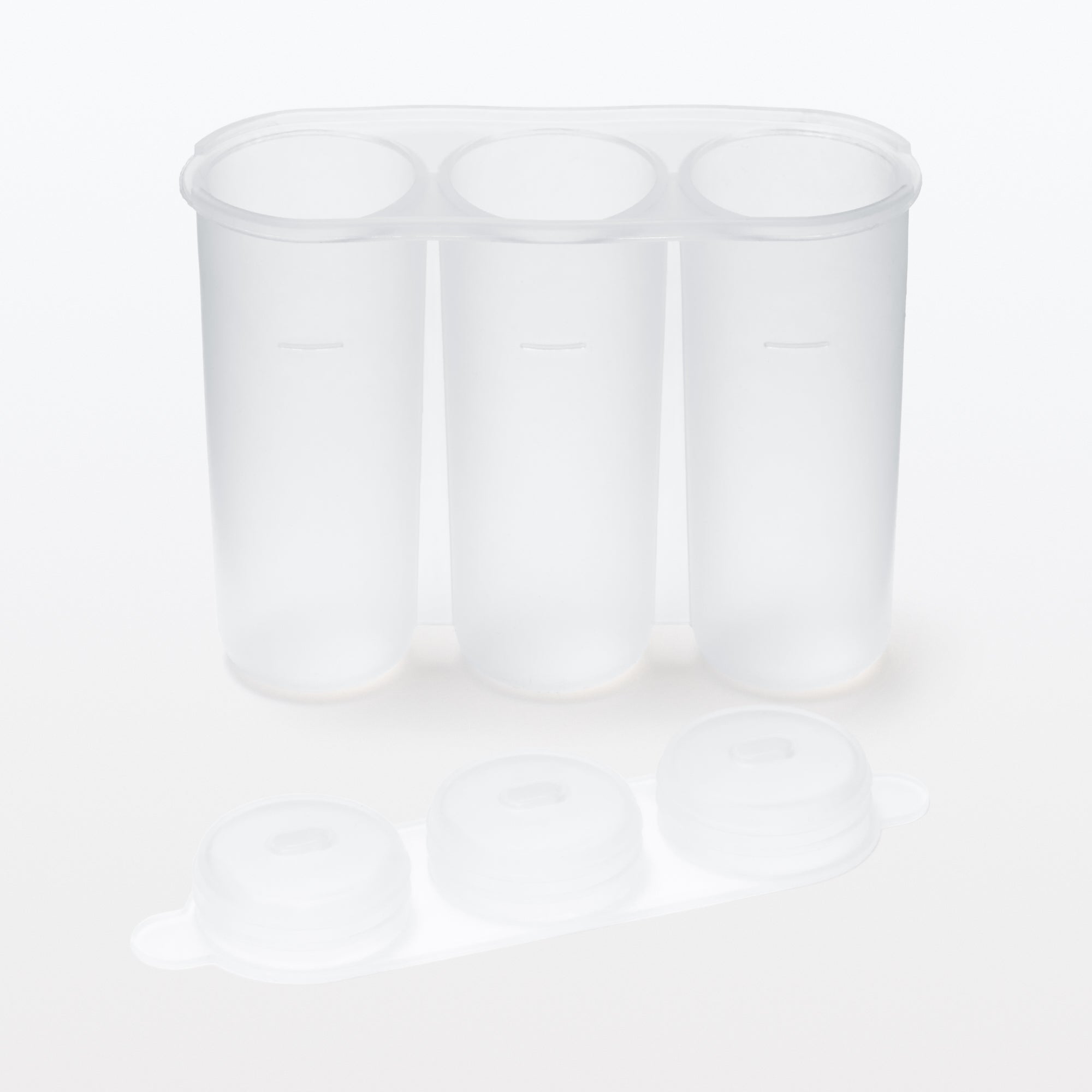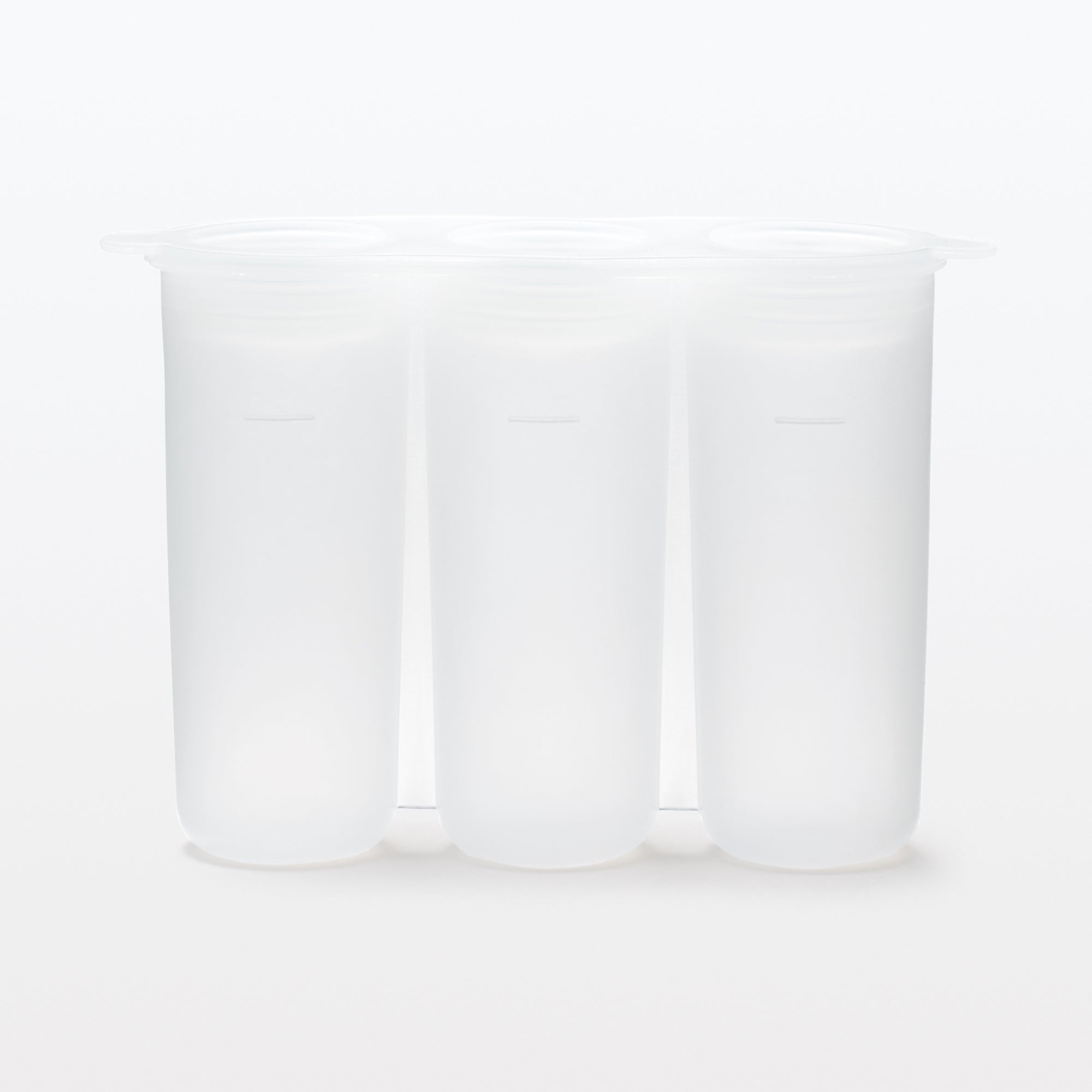 Ice tray made of silicone. making it easy to take out the ice. Creates long. thin ice cubes that can fit into water bottles with a small opening. The lid has a slot for popsicle sticks. making it perfect for creating homemade ice pops as well. Makes 3 ice cubes at a time.