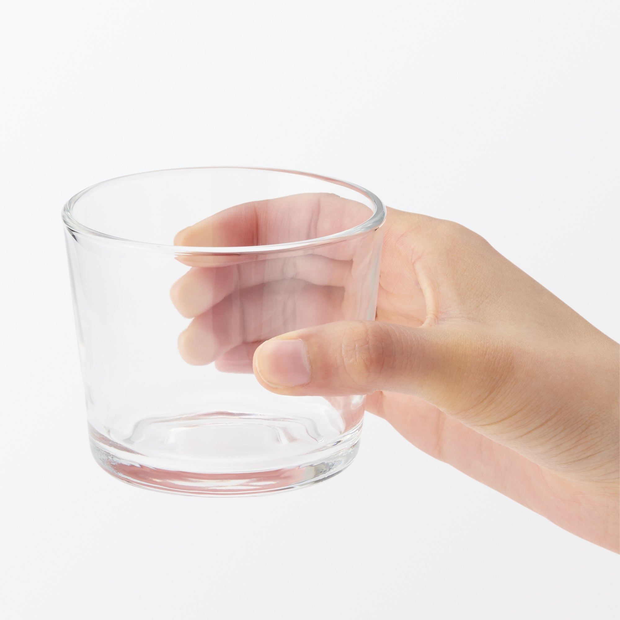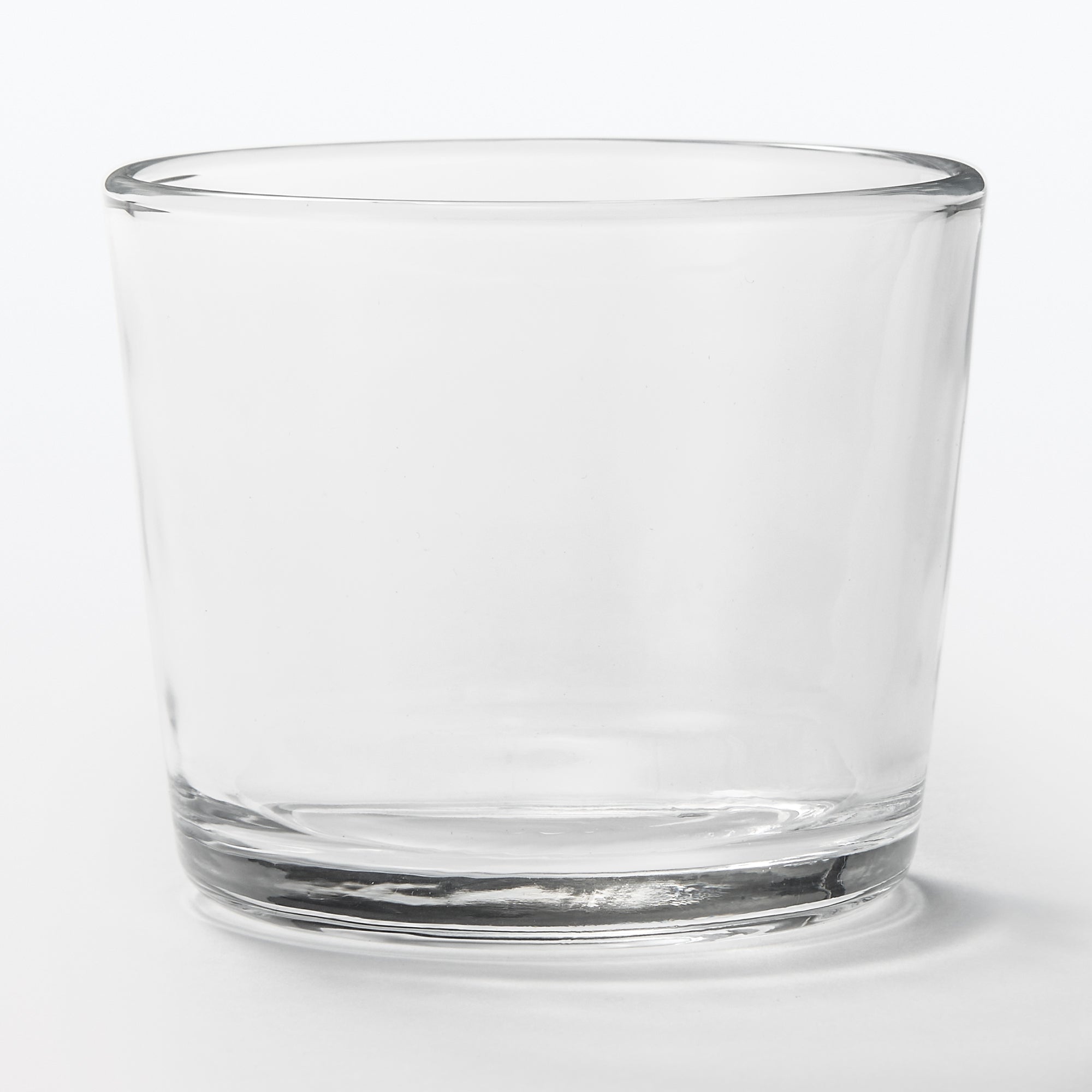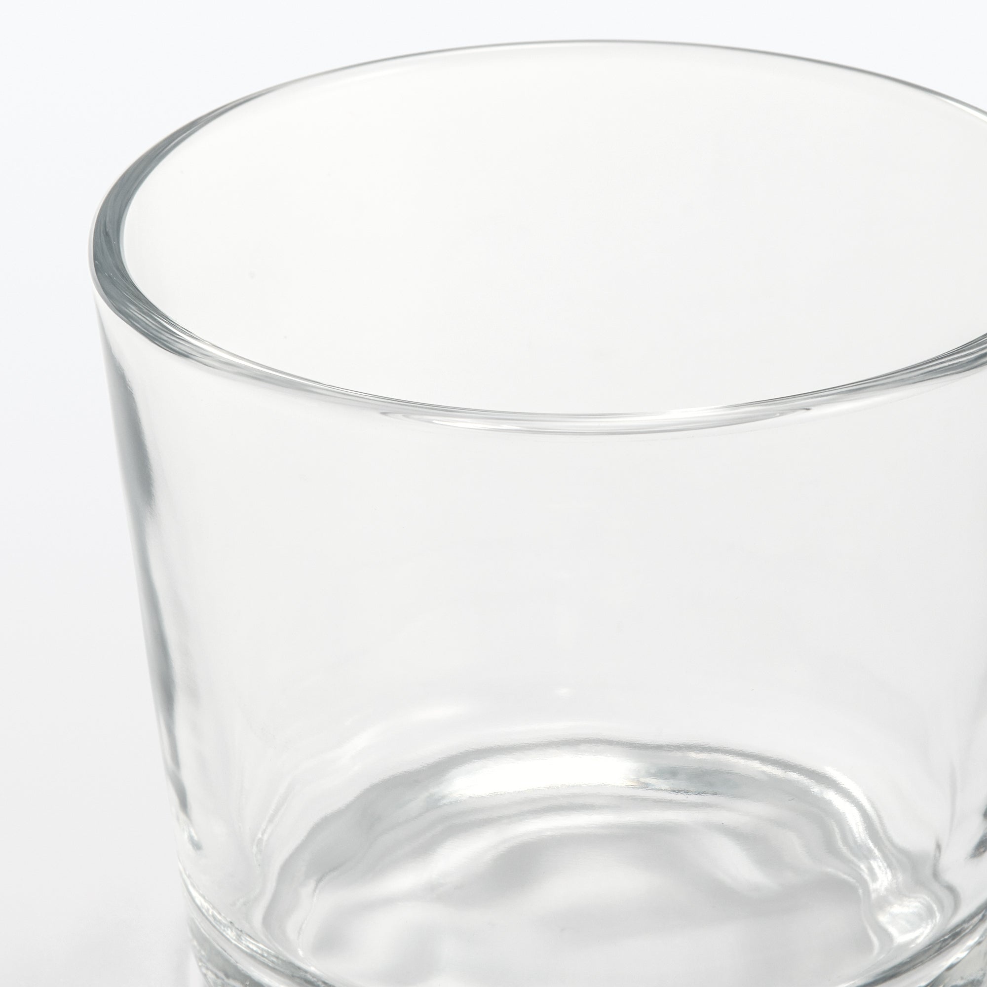 A transparent cup made from soda glass. It’s wavy surface texture is reminiscent of hand blown glass.