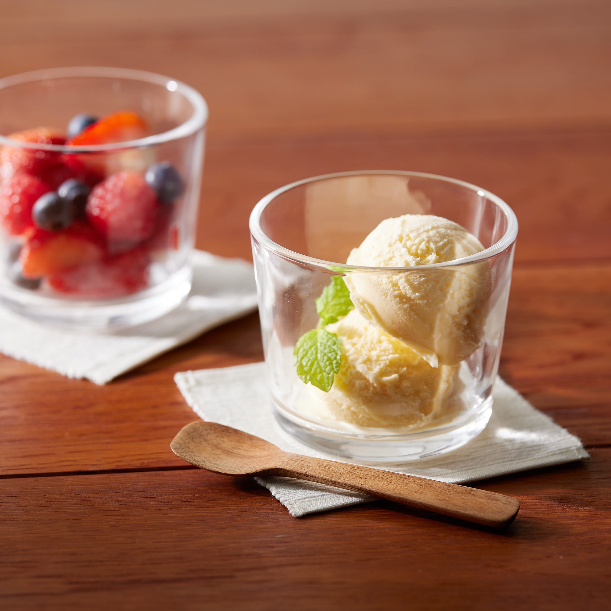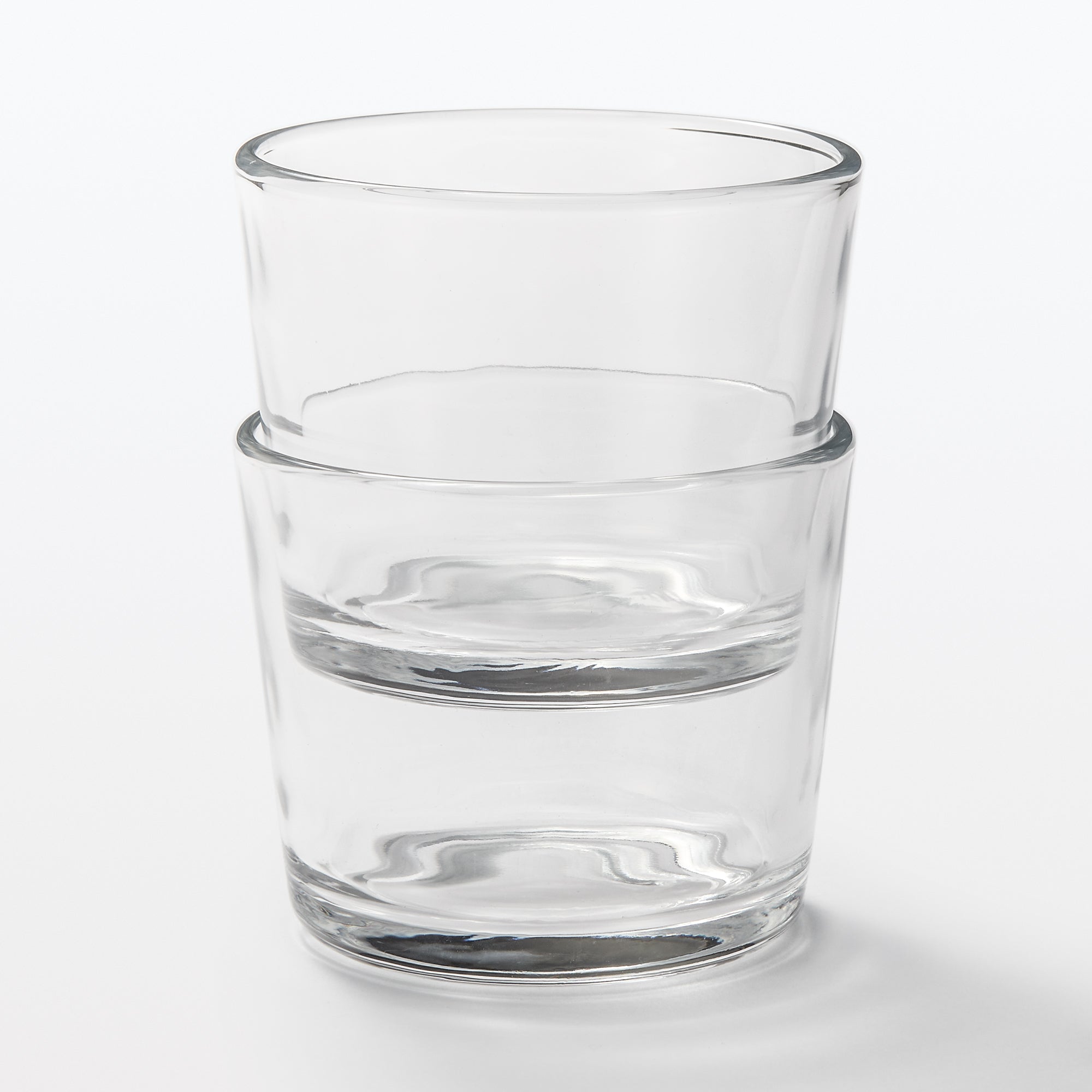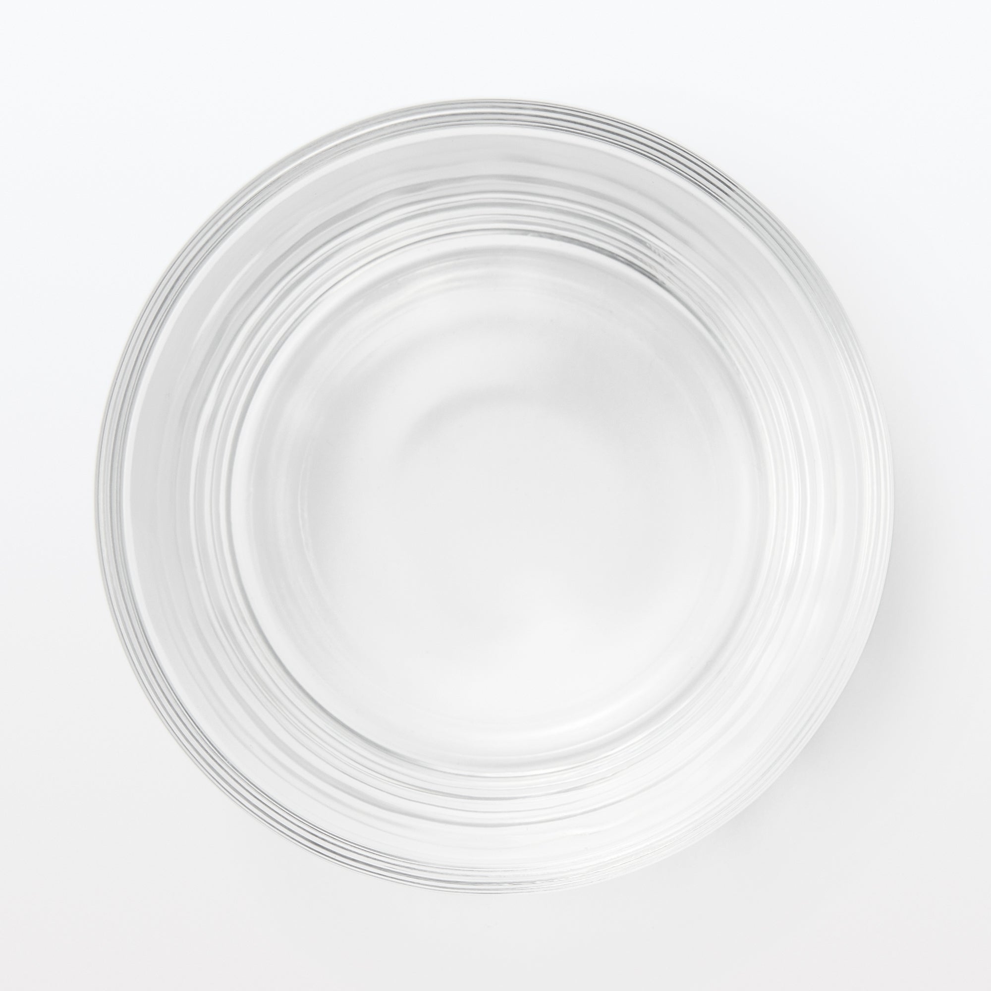 A transparent cup made from soda glass. It’s wavy surface texture is reminiscent of hand blown glass.