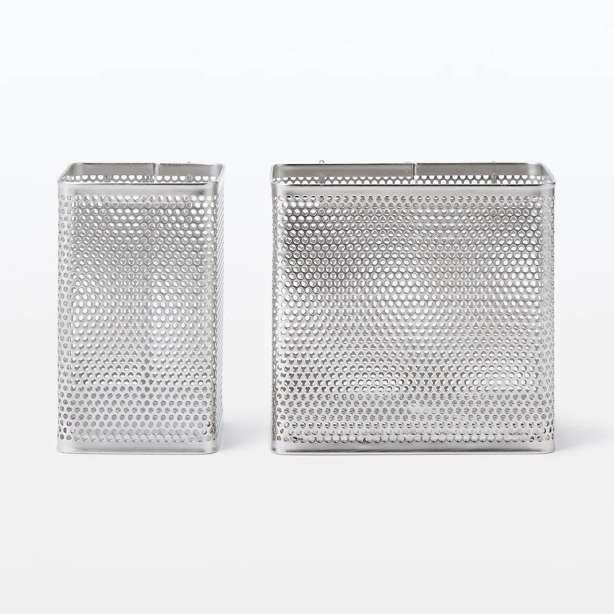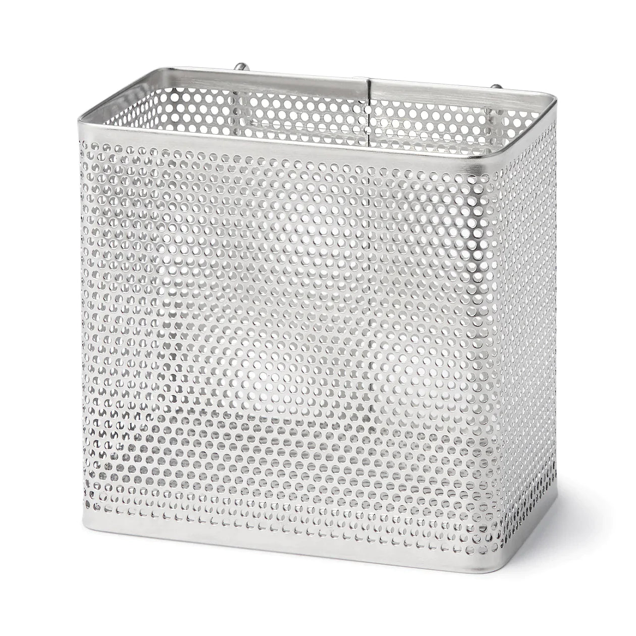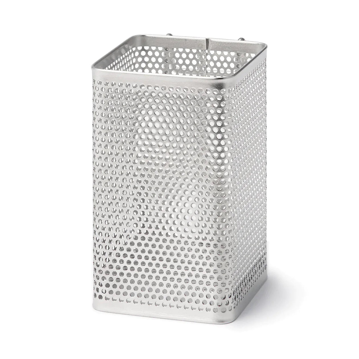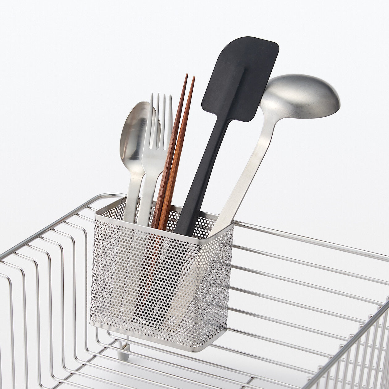 This stainless steel cutlery stand is durable. rust resistant. and easy to clean. The hook on the back gives you the option to hang the stand on a rack. Comes in two sizes.