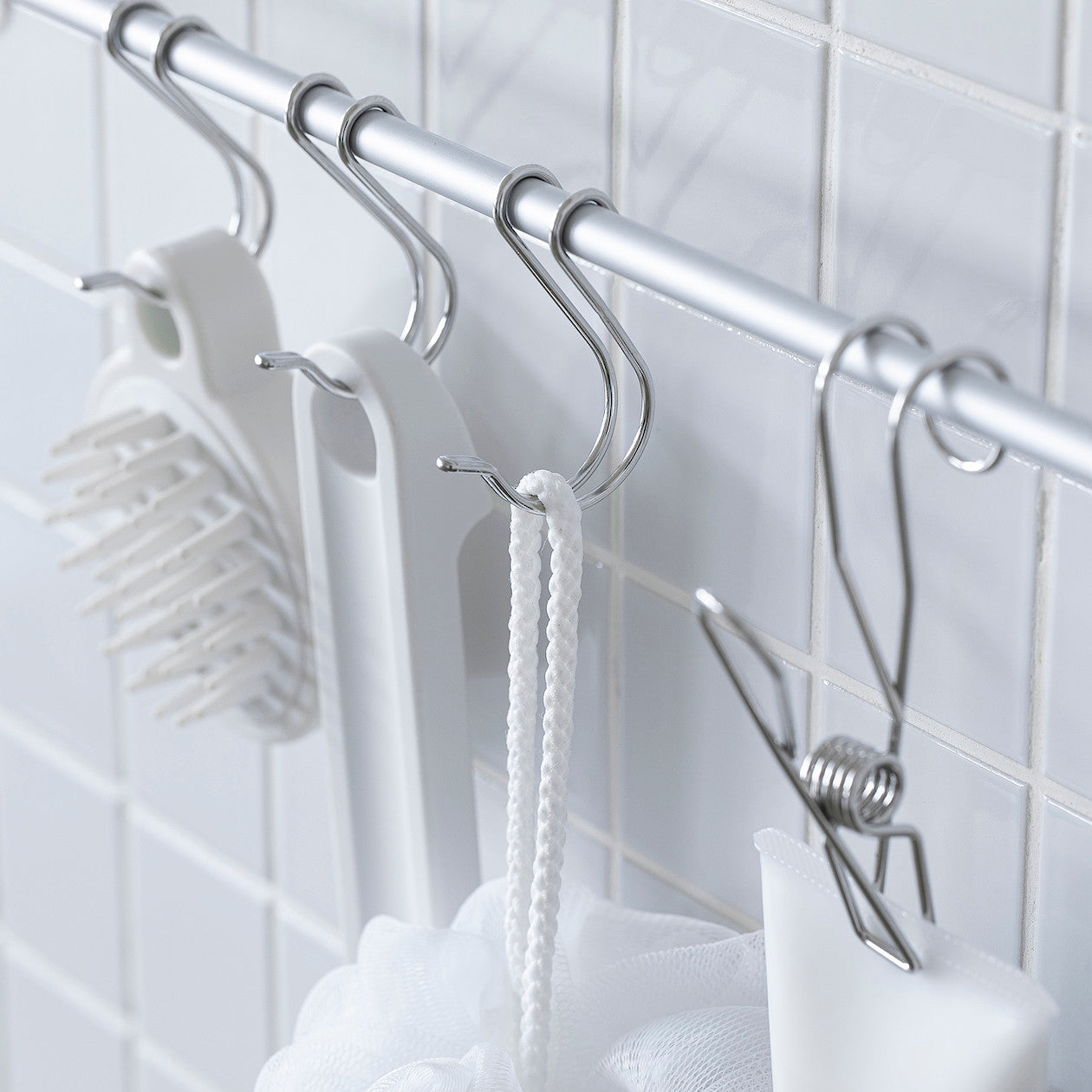 A clip made of rust-resistant 18-8 stainless steel that can be hung on a bar. Convenient for hanging recipe notes. dish towels. rubber gloves. etc. Comes in a set of 4 pieces.