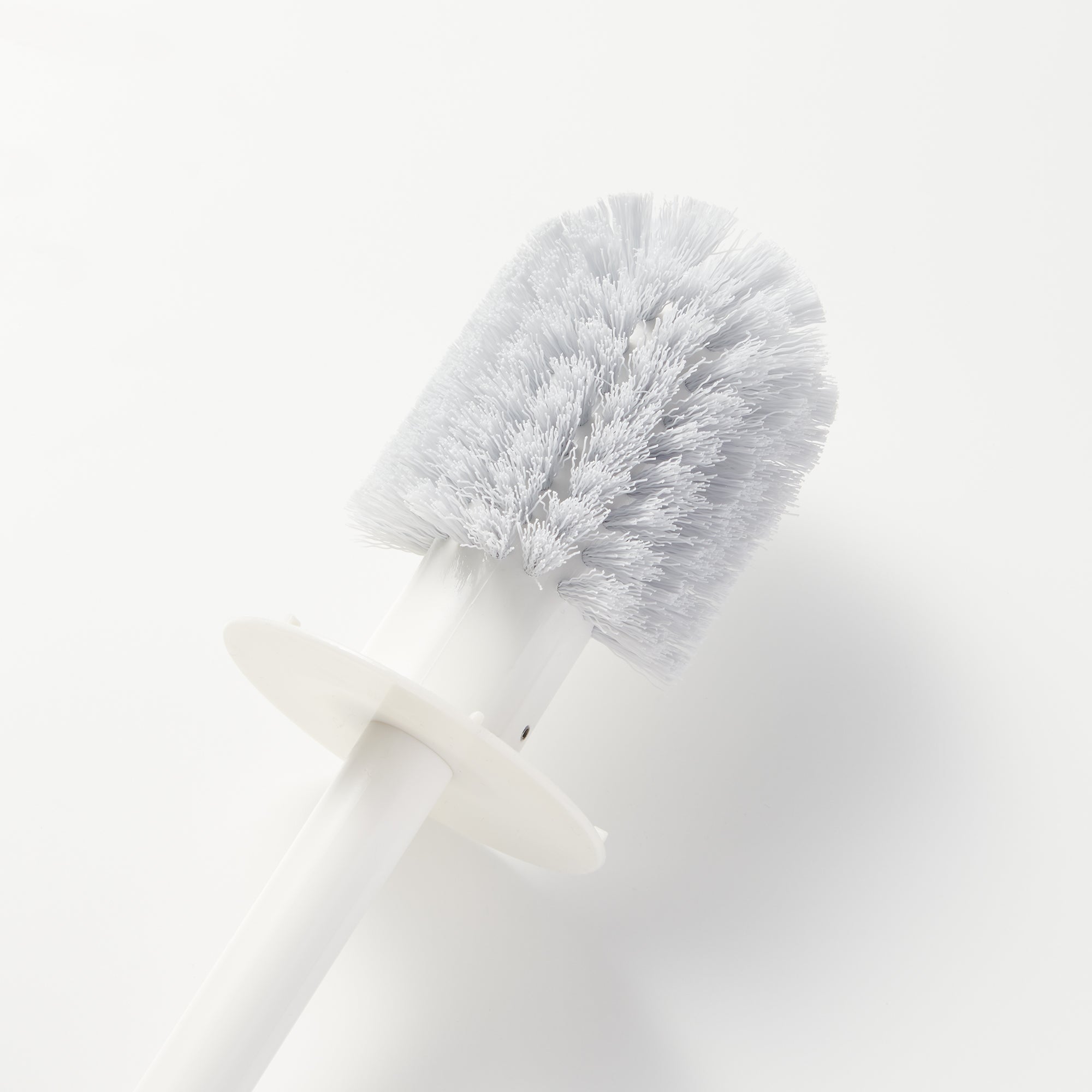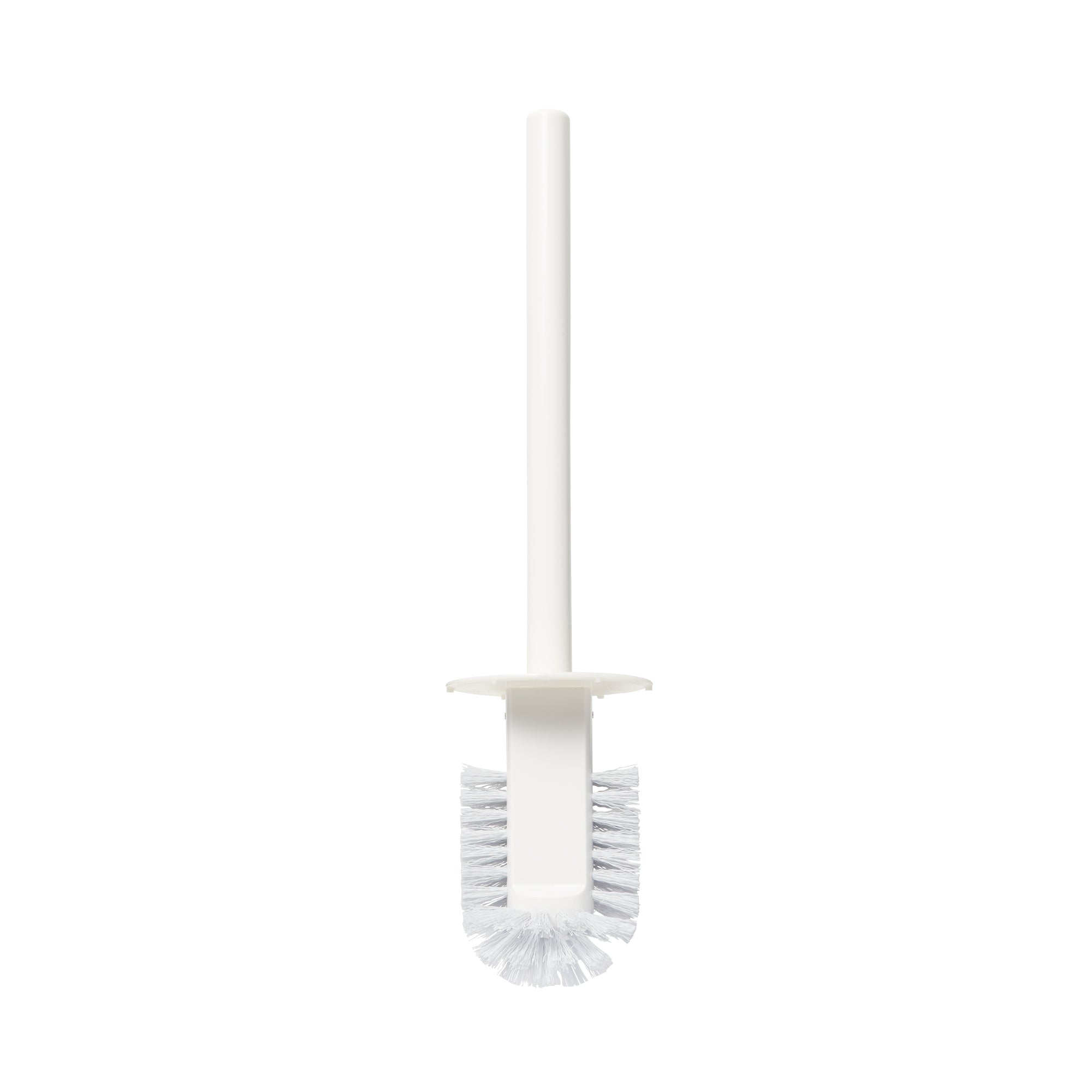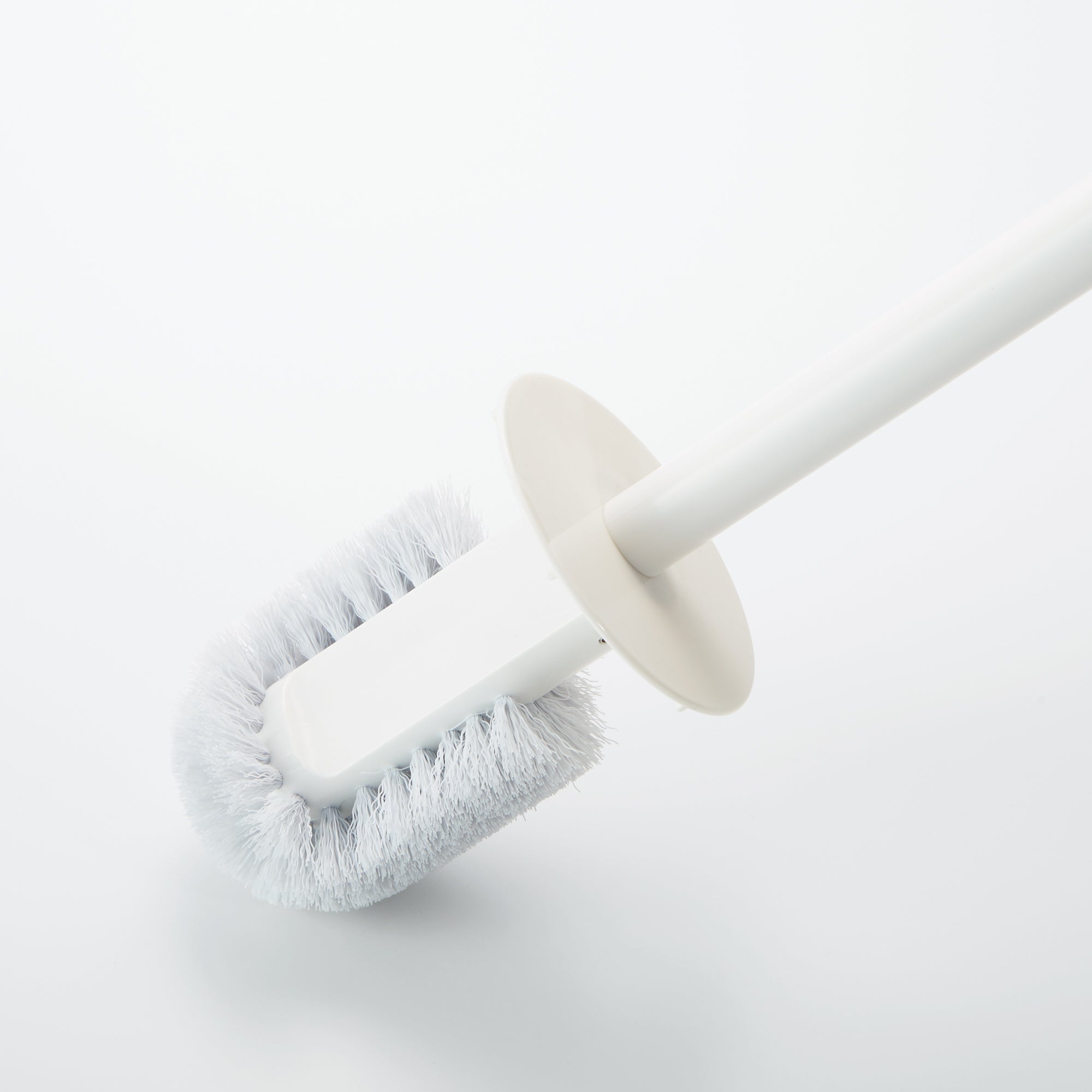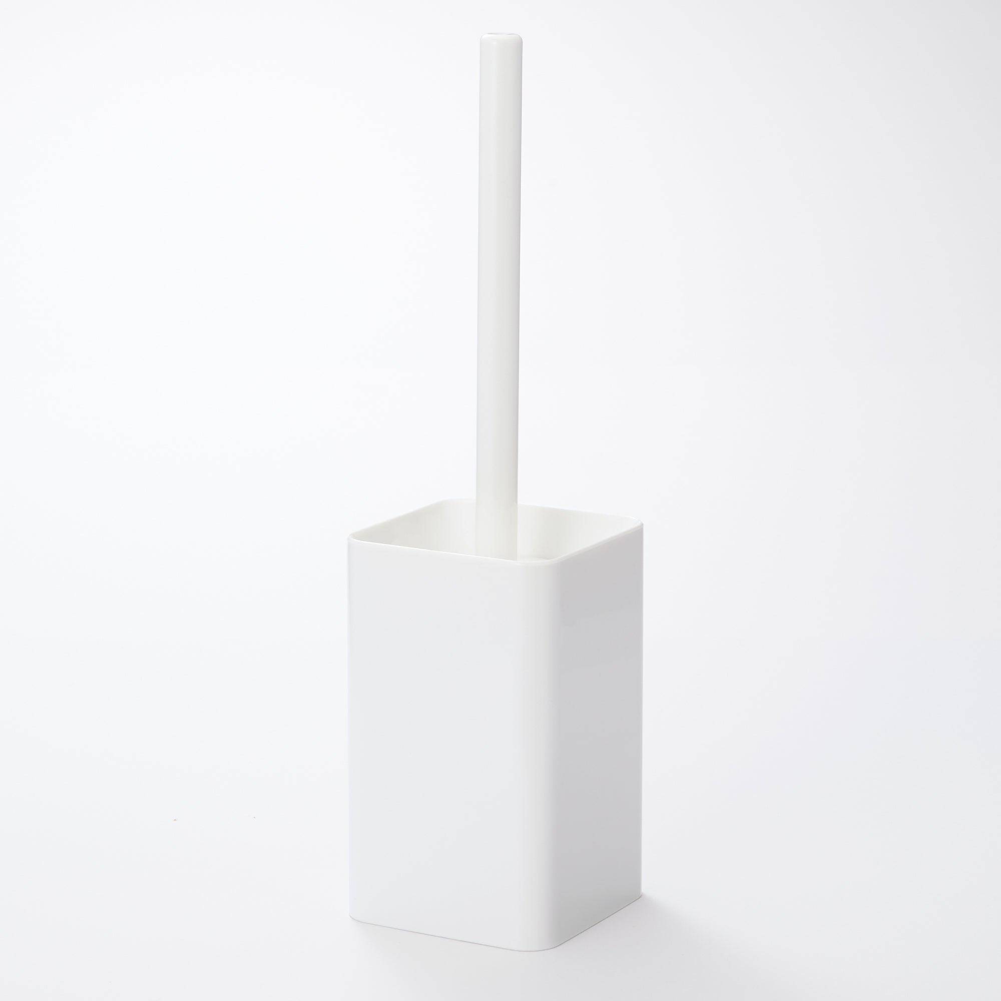 A minimalistic toilet brush with a rectangular case can be stored in the corner of the bathroom. It is cut out on one side with a lip to let it dry before putting it back in the case. This prevents having as much bacteria. moisture. and odor buildup.