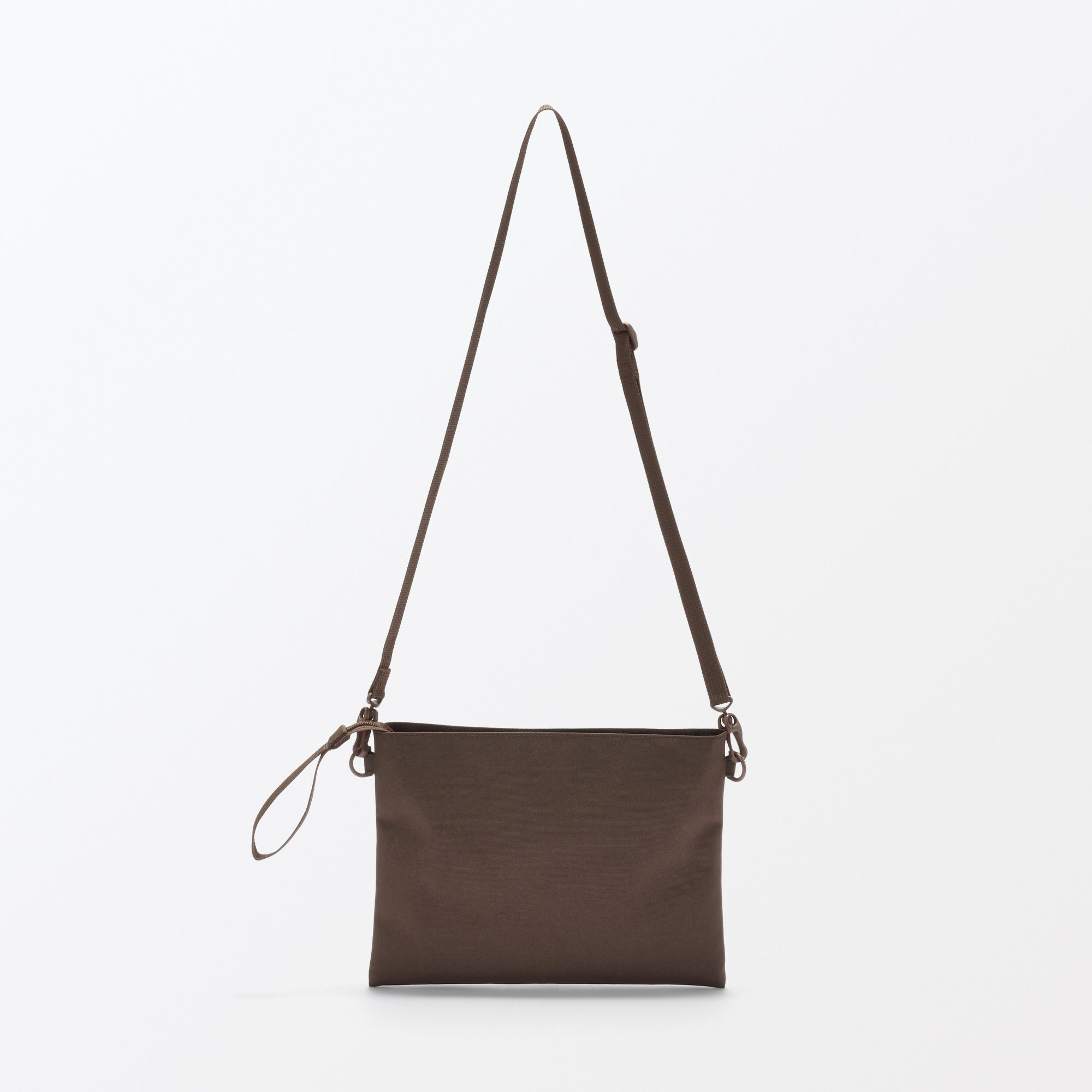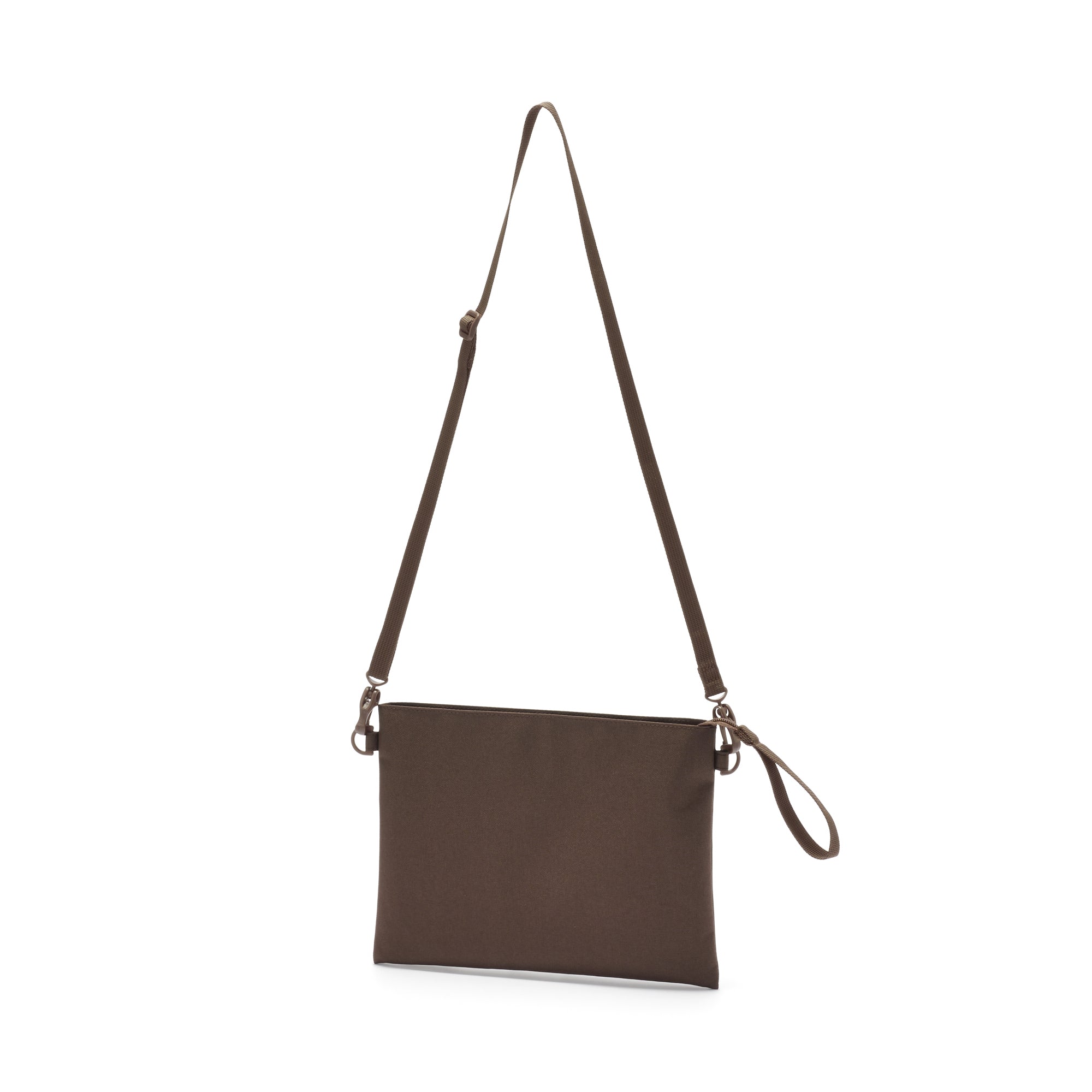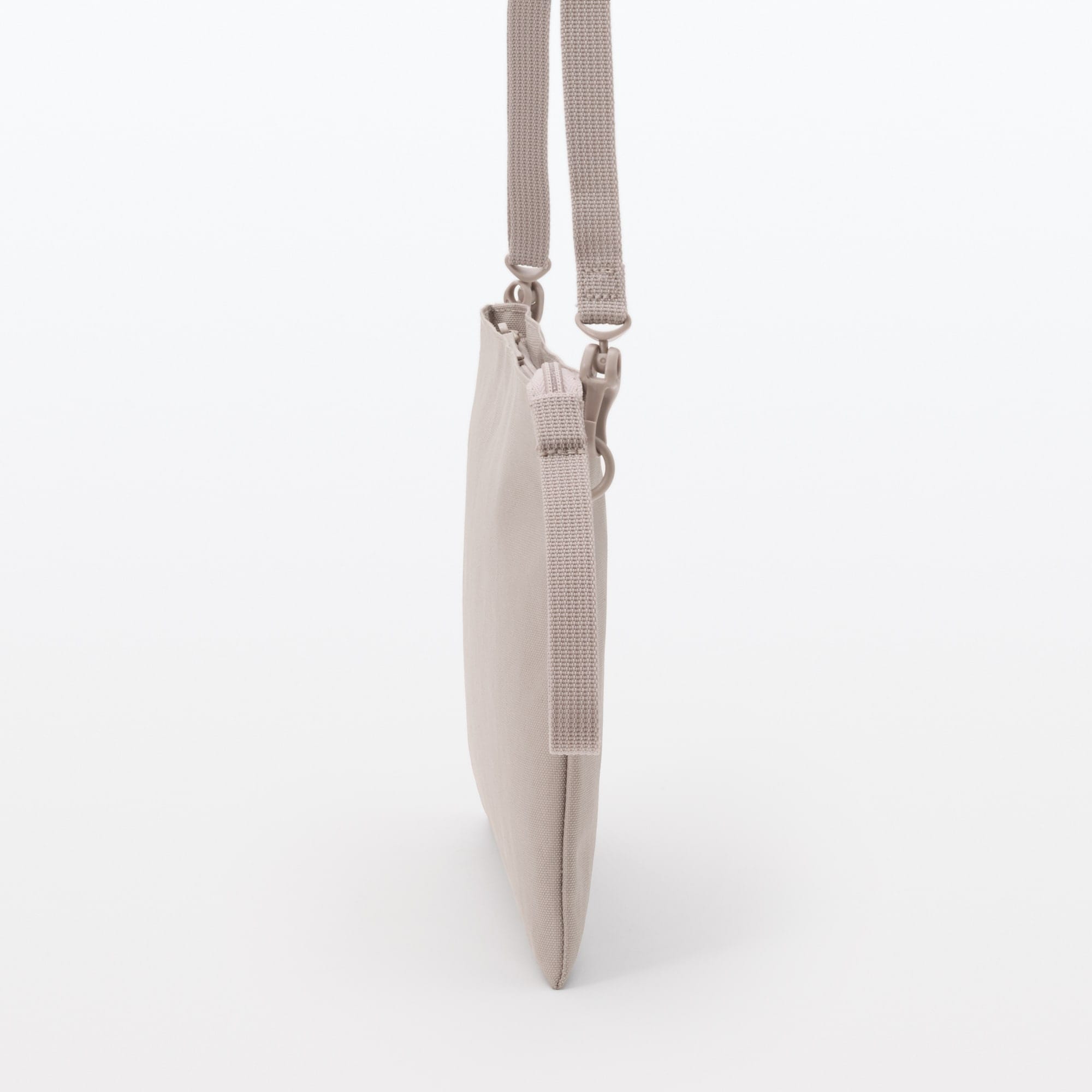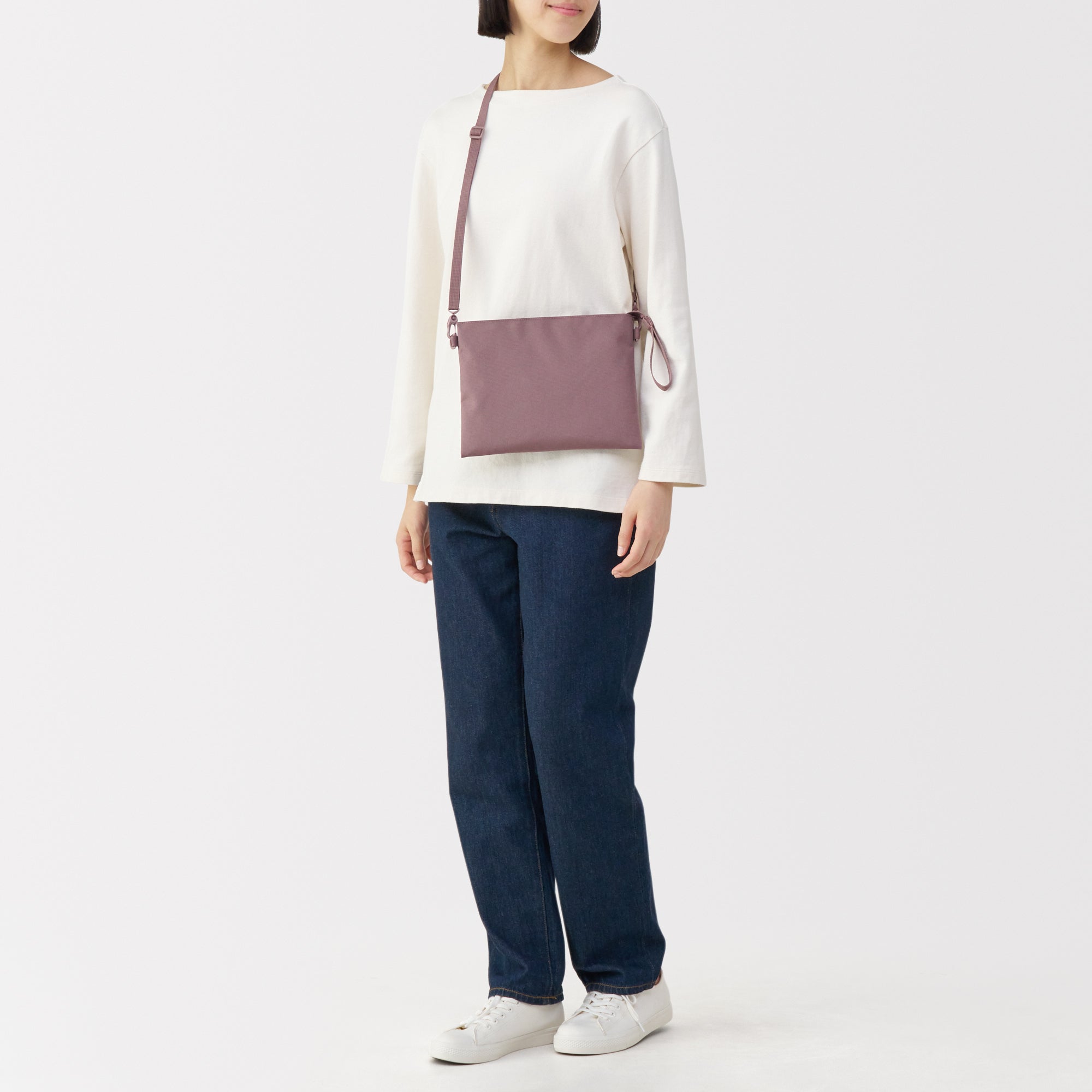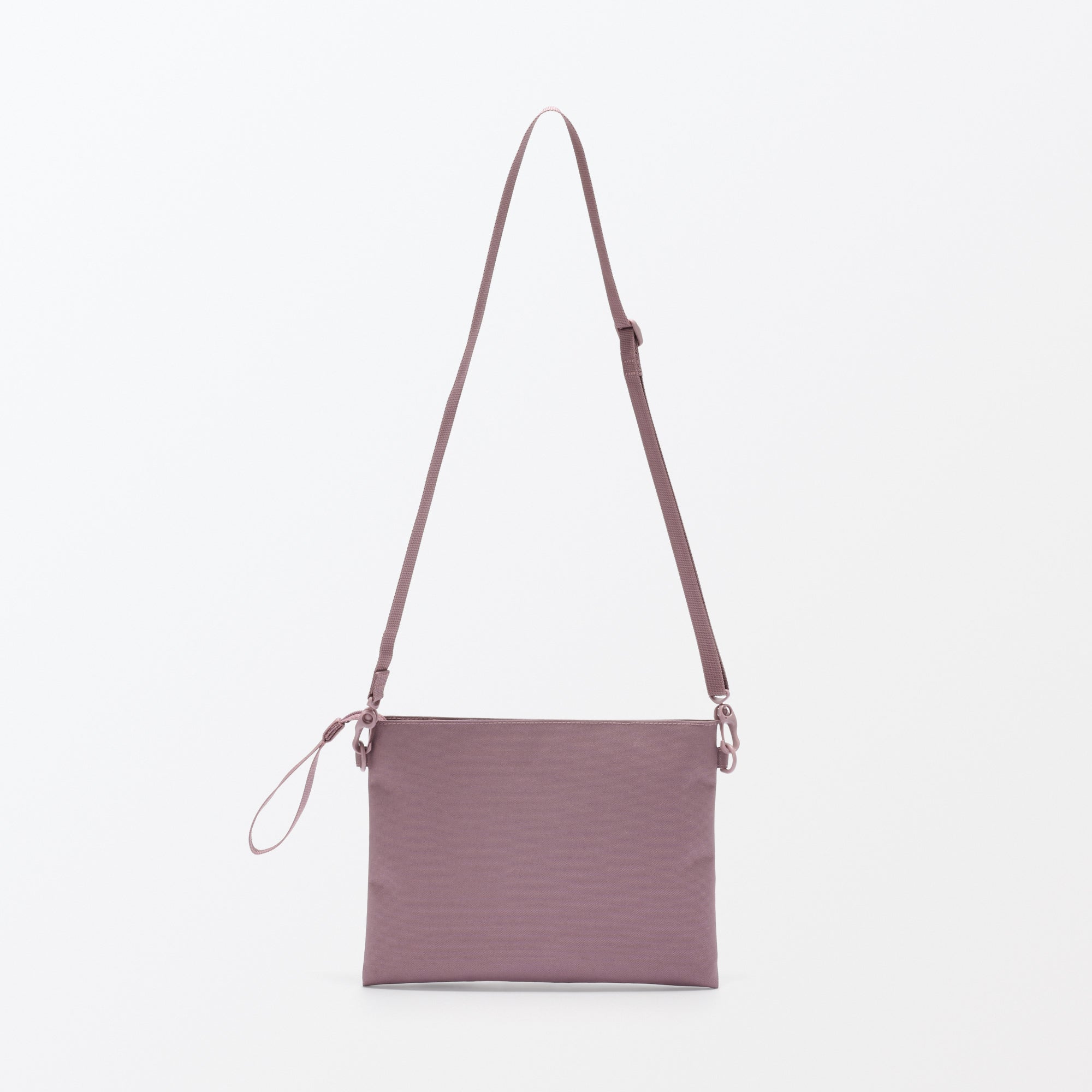 This compact. shoulder-slung pouch is the perfect size to hold all of your daily necessities for quick outings. Made from recycled polyester. it has a water repellent coating to protect your belongings. There is an interior divider to help keep its contents organized and easy to find.