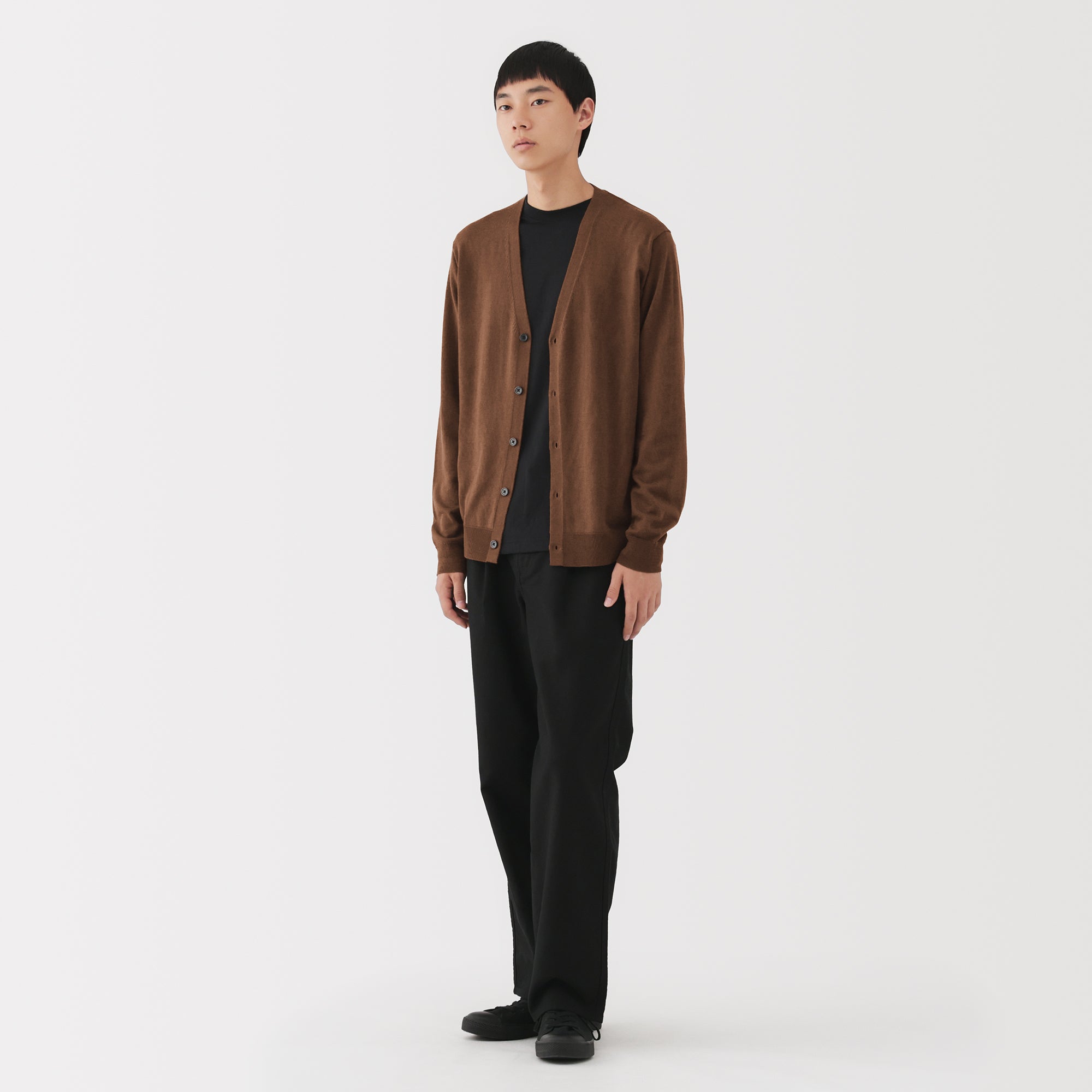 This men’s V-neck cardigan is soft and cozy. made from fine. durable high-gauge wool thread that is smooth on the skin. The thin wool material ensures warmth for versatile styling on its own or as a layering piece on chilly days. It also features a shrink-proof finish. making it easily washable at home.