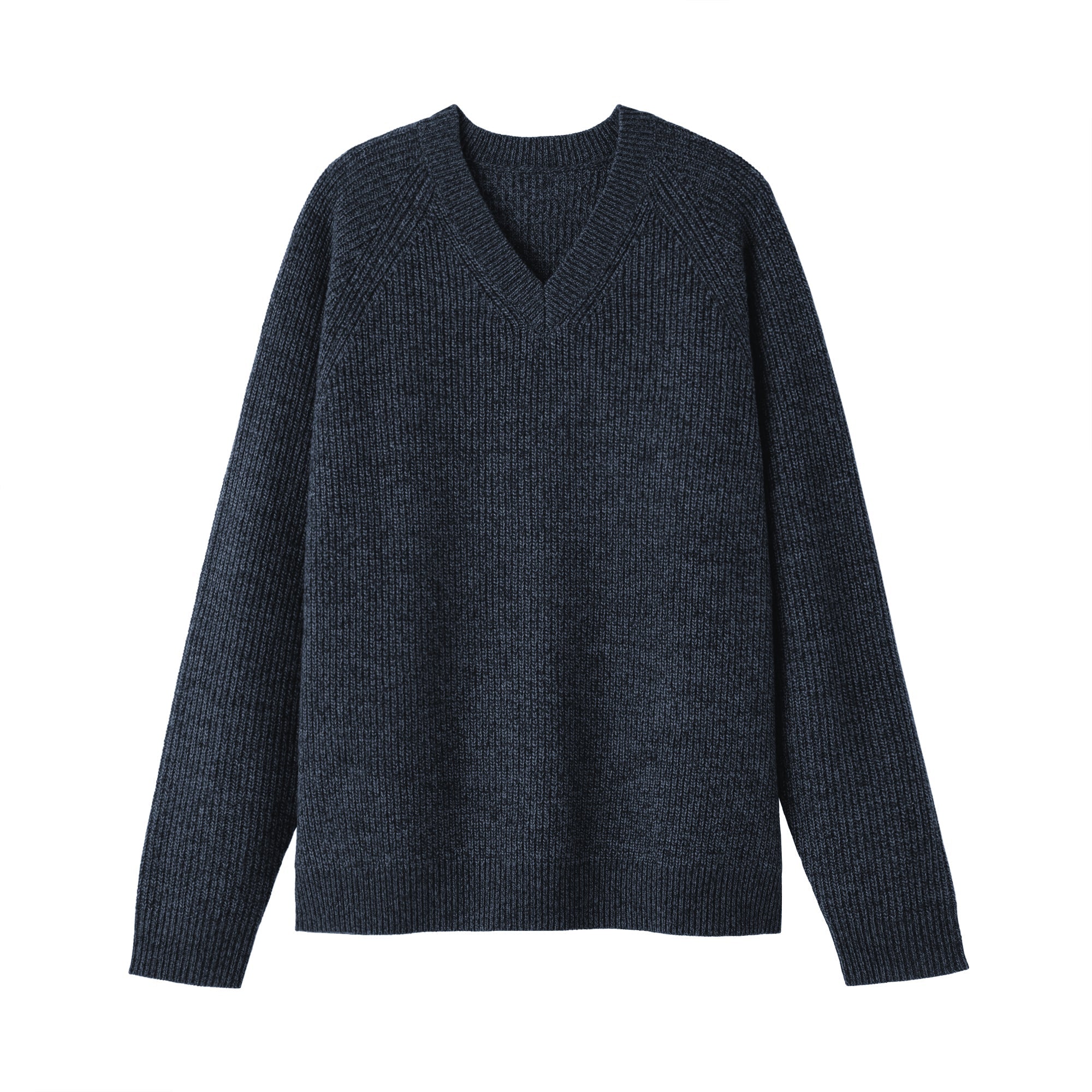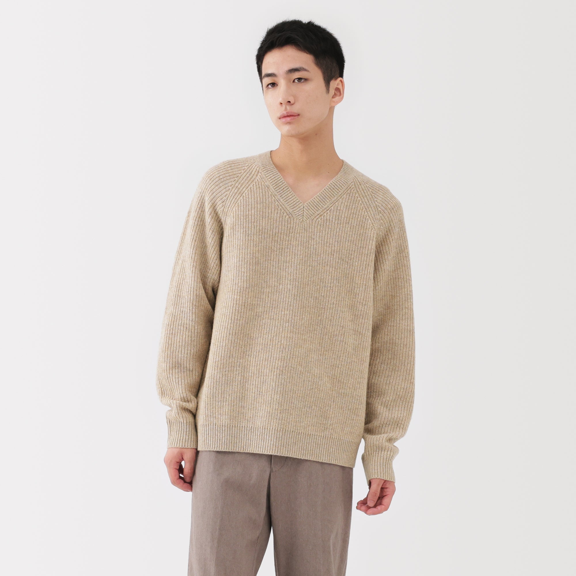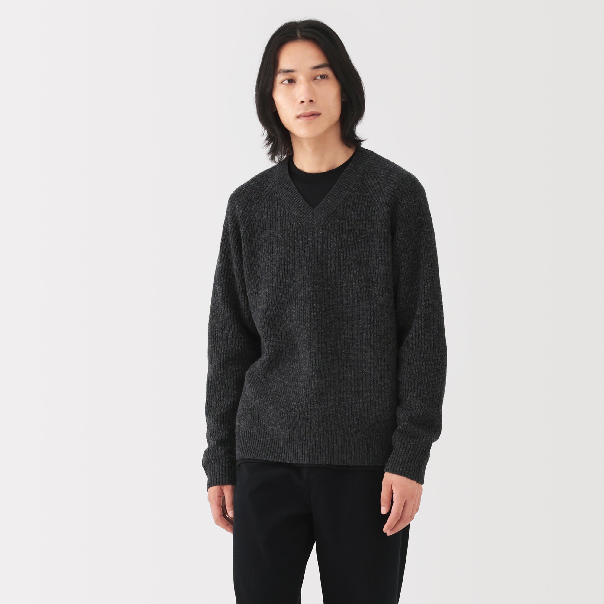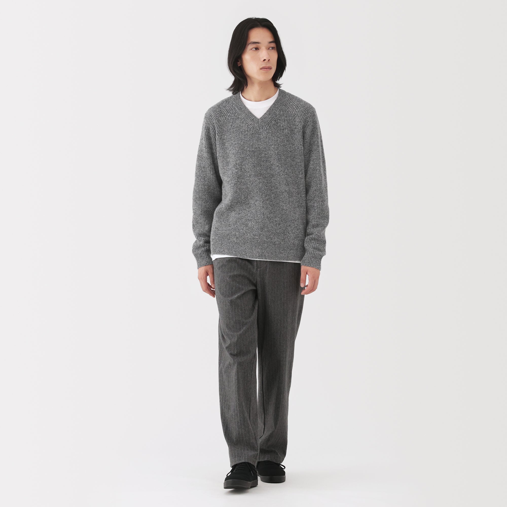 This men’s mid-gauge wool V-neck sweater is crafted with a knit that combines two yarn thicknesses twisted together. resulting in a lightweight. soft. and fluffy texture for comfort.
