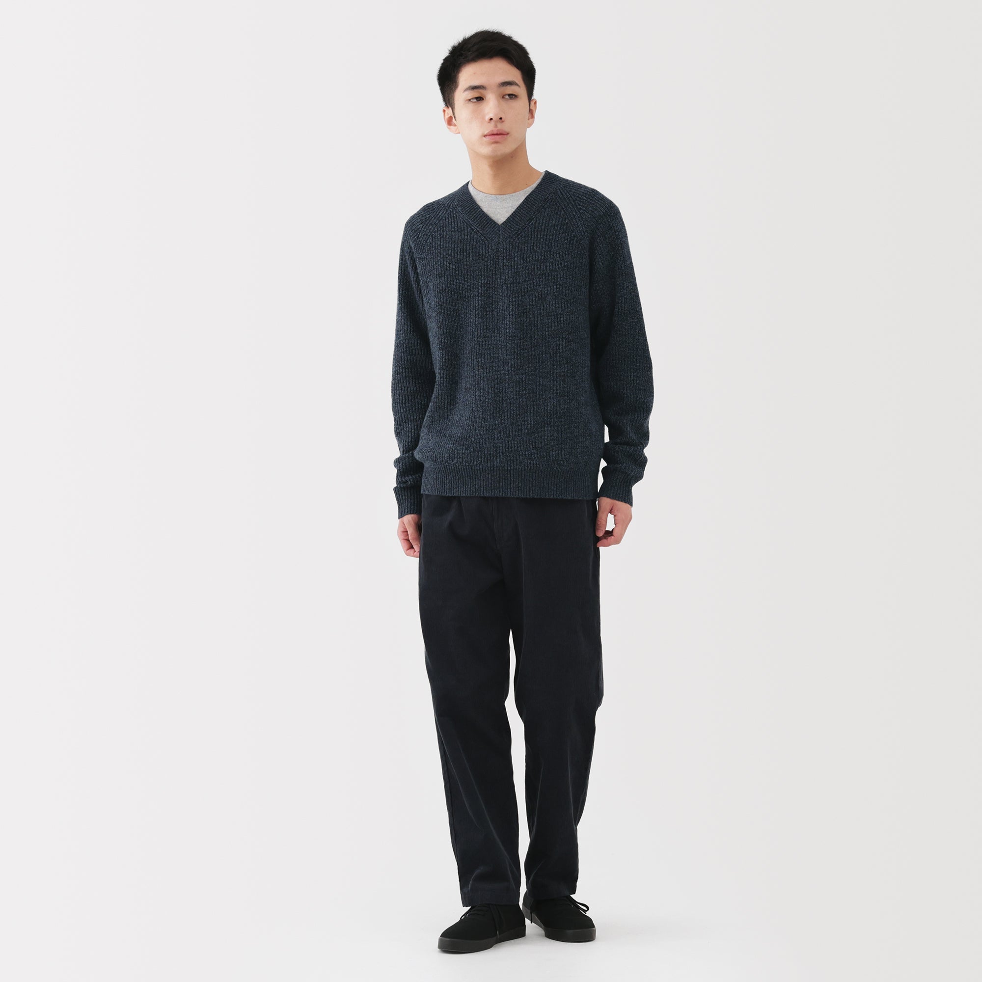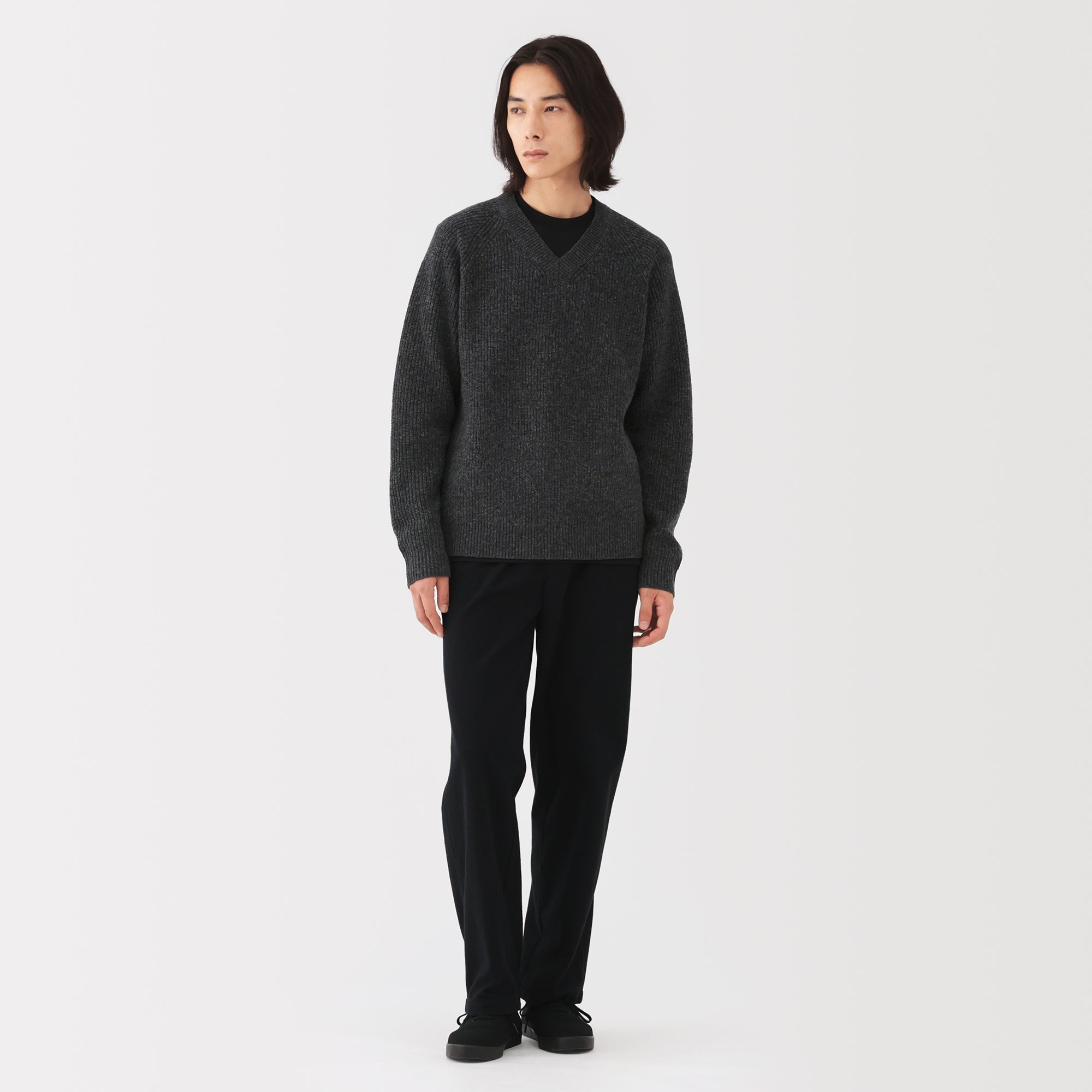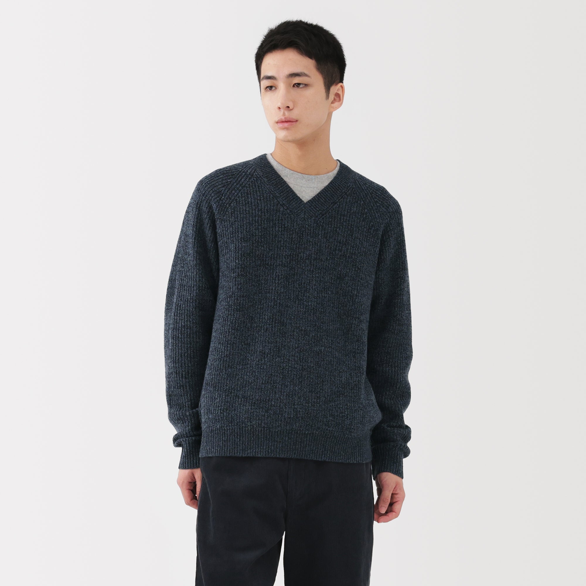 This men’s mid-gauge wool V-neck sweater is crafted with a knit that combines two yarn thicknesses twisted together. resulting in a lightweight. soft. and fluffy texture for comfort.